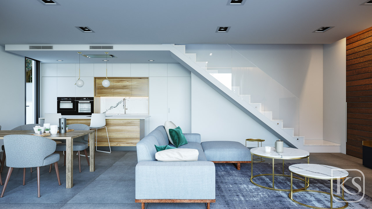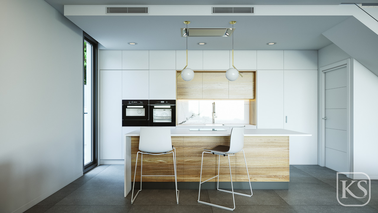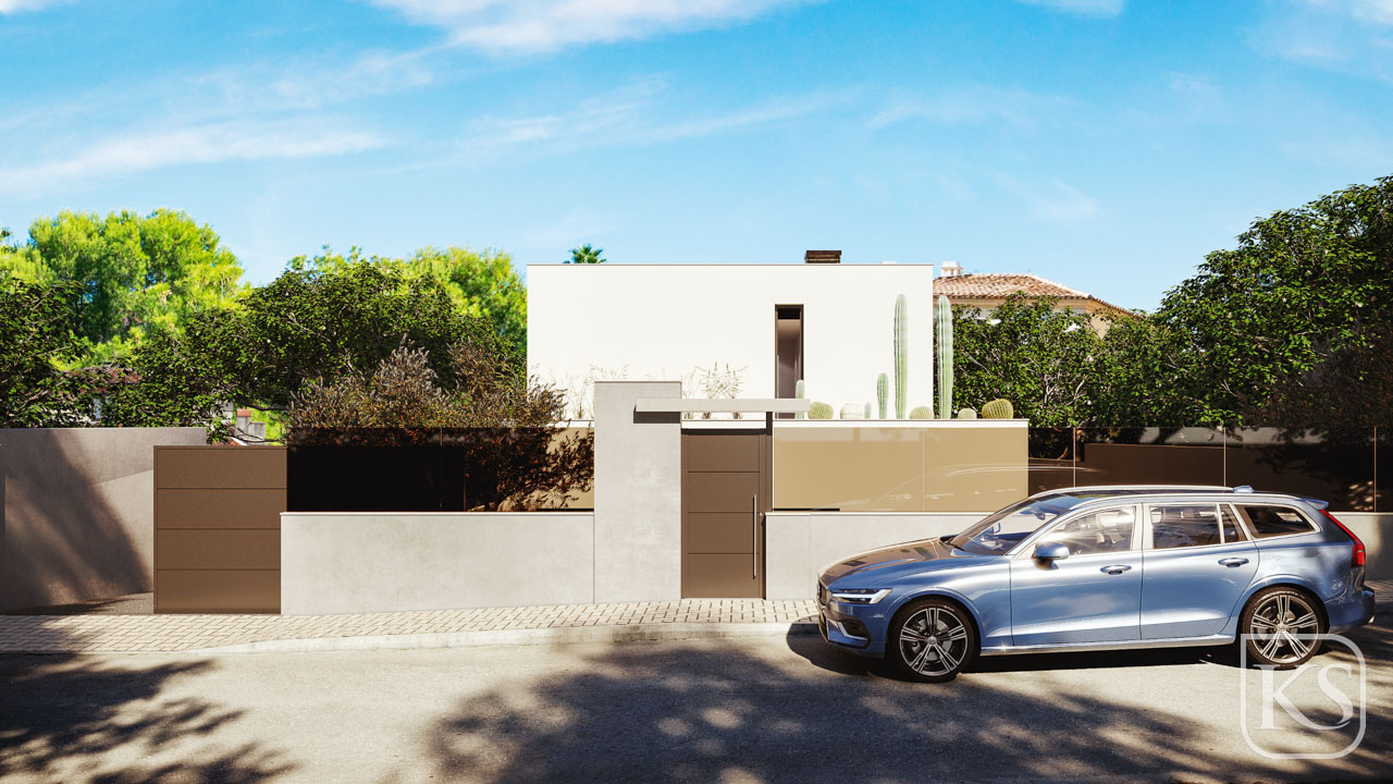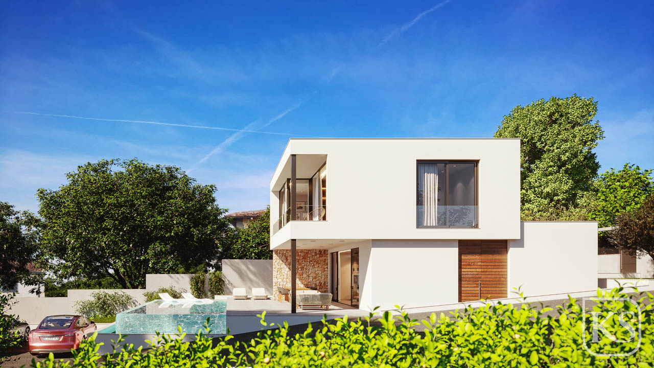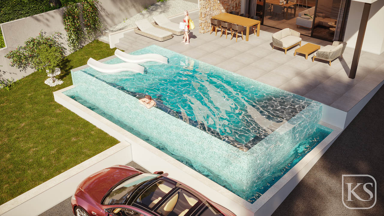 These exclusive villas have 4 bedrooms and 3 bathrooms, an infinity pool, a sun lounger area and a garden finished with artificial grass in areas closer to the house and pool. Fully fitted kitchen and bathrooms and pre-installation for air conditioning.