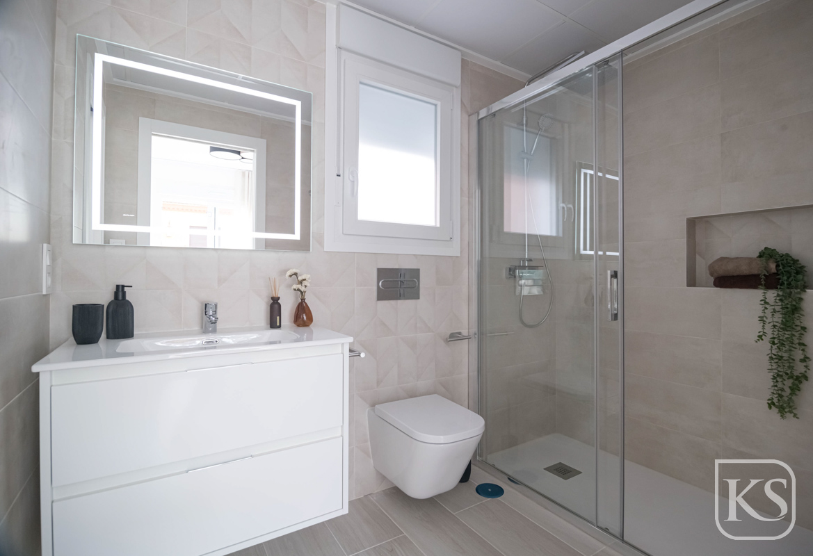 Retreat to the serene oasis of the bedrooms, where plush carpeting and white lacquered doors wardrobes await. The bathrooms are a sanctuary of relaxation, featuring top-quality porcelain sanitary ware, rainfall shower columns, and anti-slip shower trays with transparent safety glass screens.
