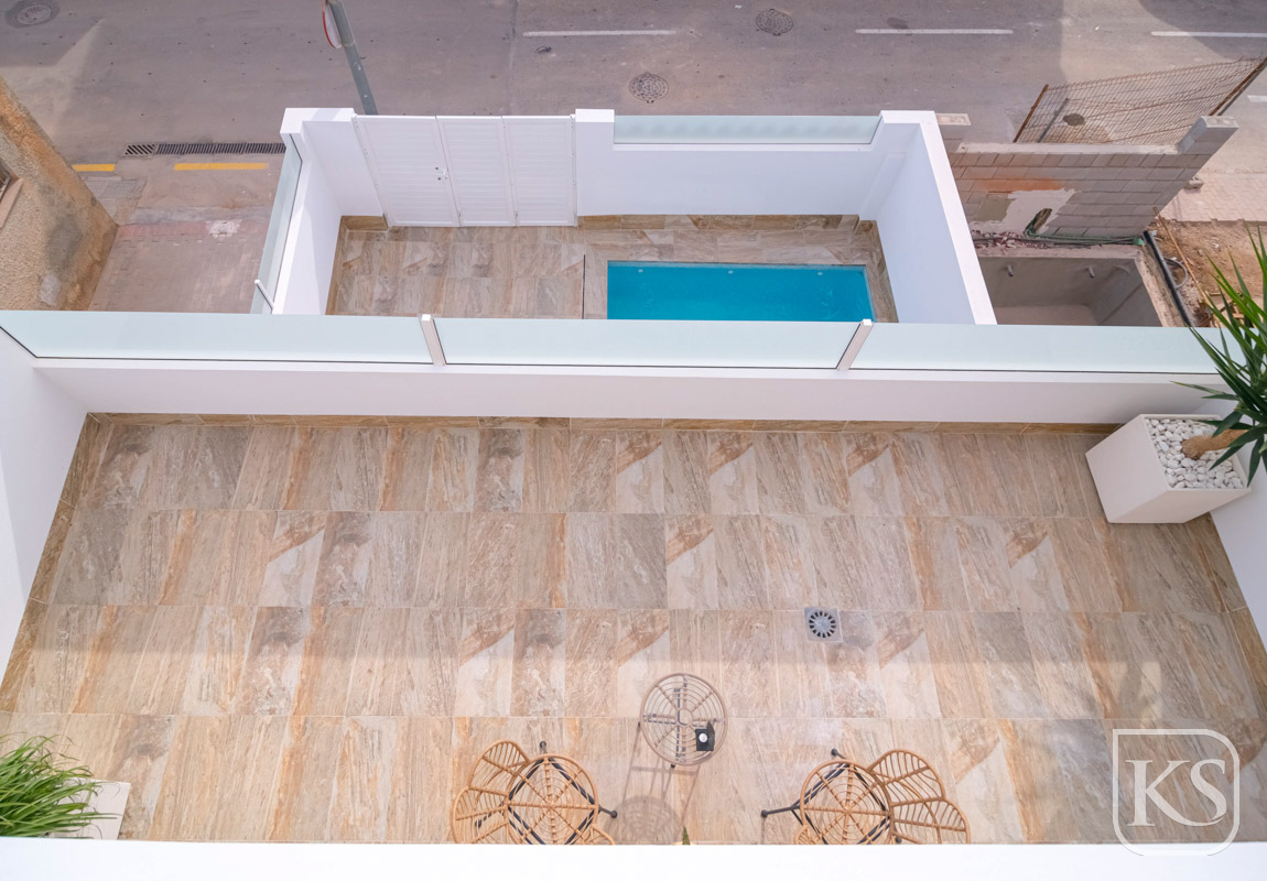 Outside, discover your own private paradise with a range of exceptional amenities. Take a dip in the sparkling pool, surrounded by lush landscaping and stainless steel shower fixtures. Enjoy alfresco dining on the large terrace areas, or soak up the sun on the expansive solarium. With a parking area inside the plot and a flat walkable roof with thermal insulation, every aspect of outdoor living has been carefully considered.