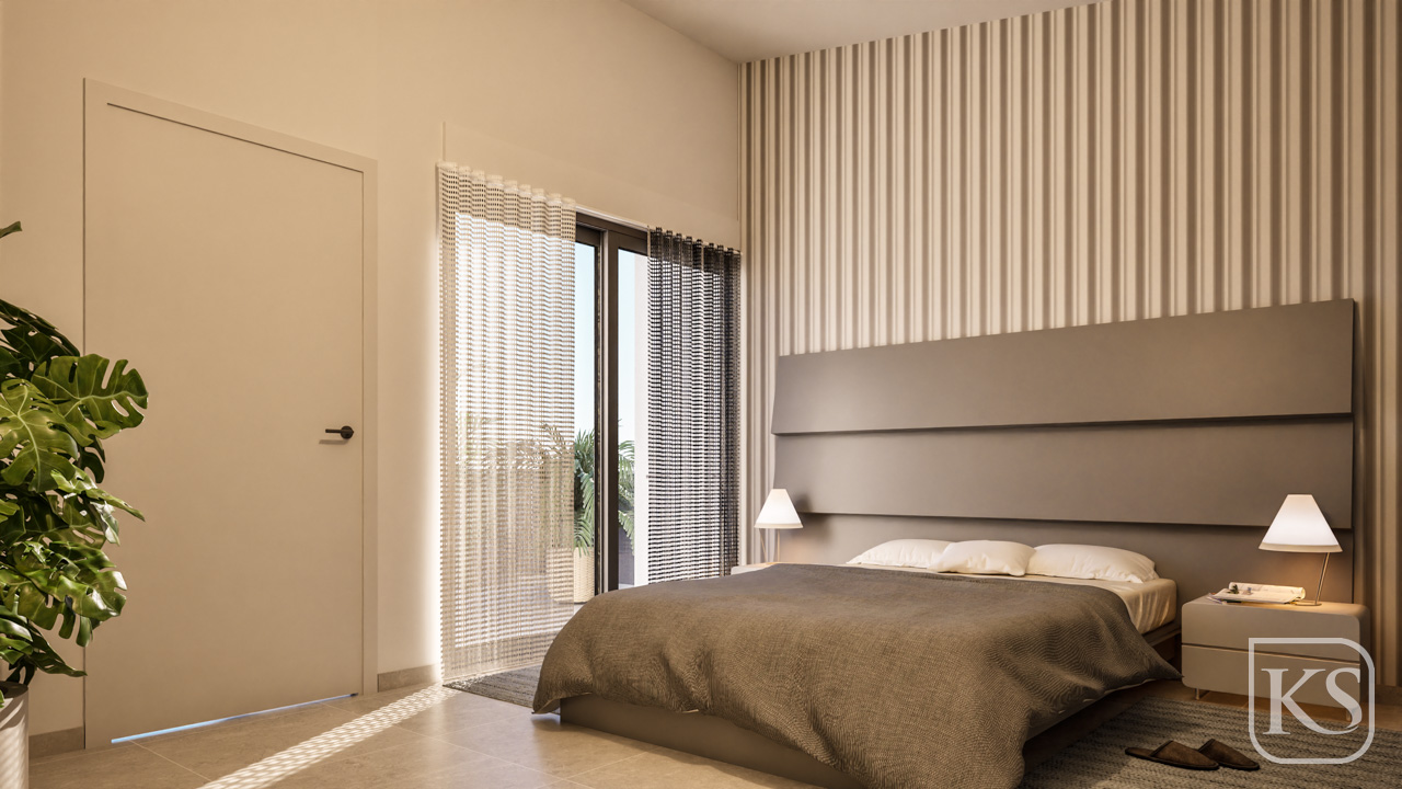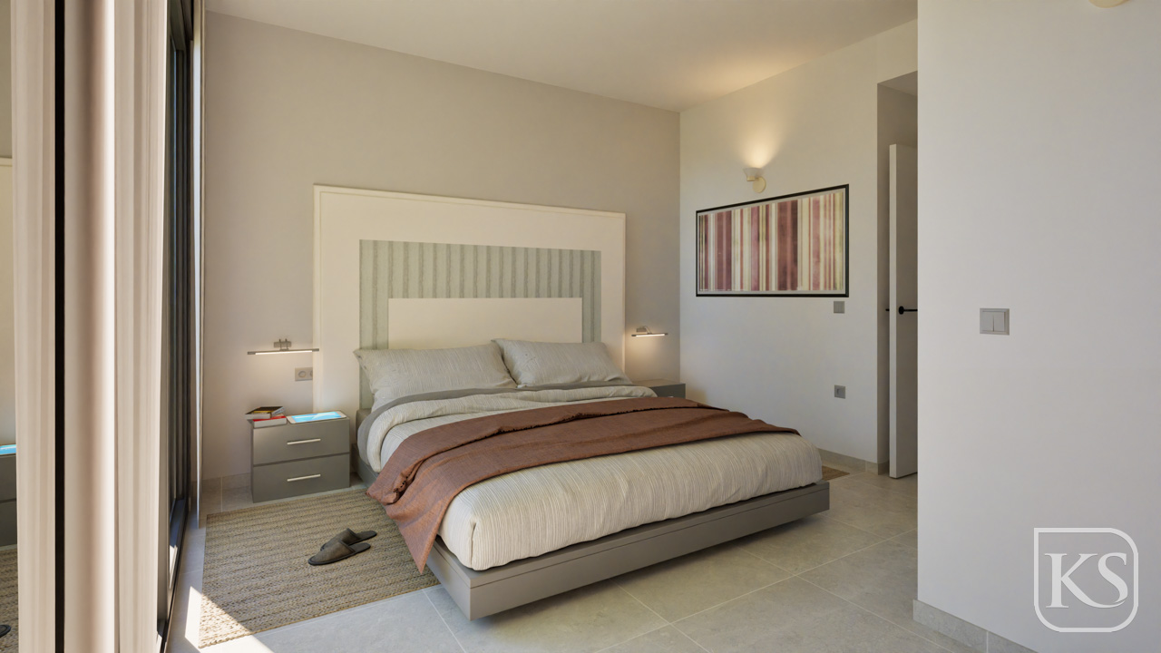 Retreat to the comfort of the villa's three spacious bedrooms, each offering a serene sanctuary for rest and relaxation. The master suite features a luxurious ensuite bathroom, complete with a floor-level shower tray and sleek Duravit fixtures. Built-in wardrobes in every bedroom provide plenty of storage space, keeping the rooms clutter-free and organized.