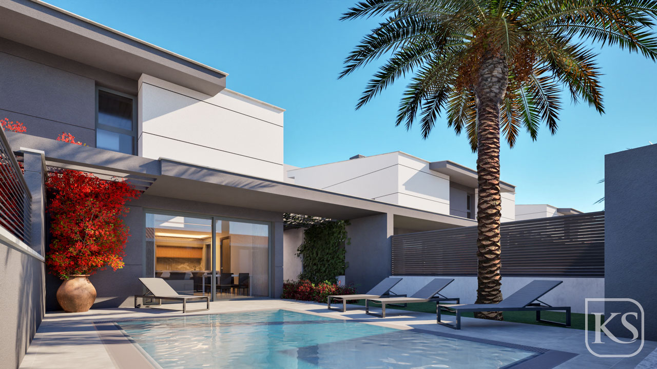 Step outside to discover your own private oasis. The villa boasts a beautiful patio, garden, and terrace, providing ample space for outdoor living and entertaining. Lounge by the sparkling private pool, surrounded by TAU porcelain tiles and LED lighting, or enjoy alfresco dining on the covered porch and terrace.