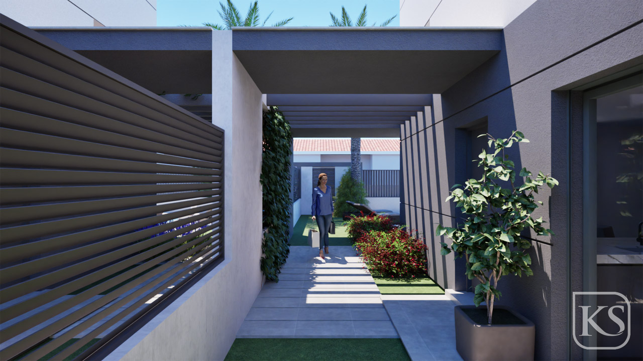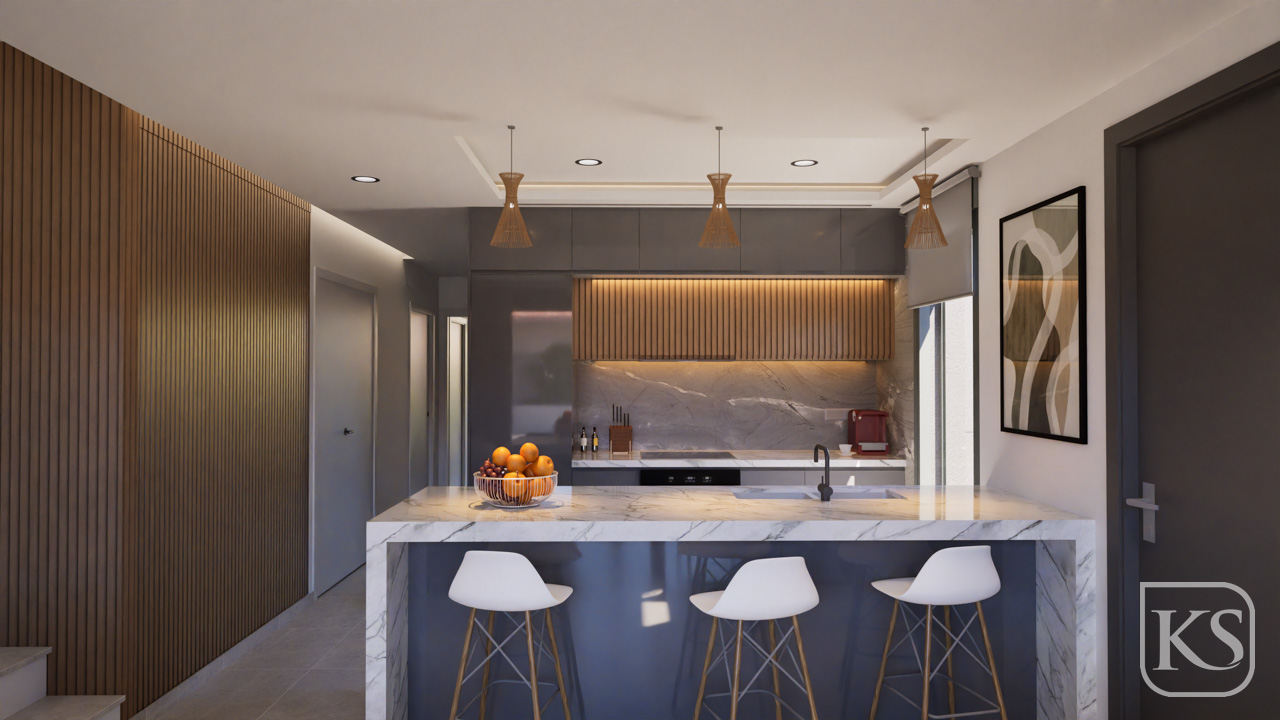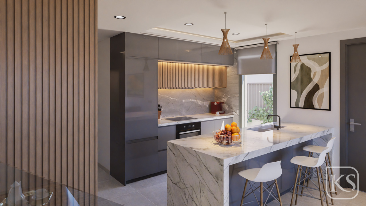 Step inside to find an open-plan layout seamlessly connecting the kitchen, living, and dining areas. Bathed in natural light, these spaces are perfect for both relaxing with family and entertaining guests. With smooth porcelain flooring throughout and sleek white walls, the interior exudes a sense of tranquility and sophistication.