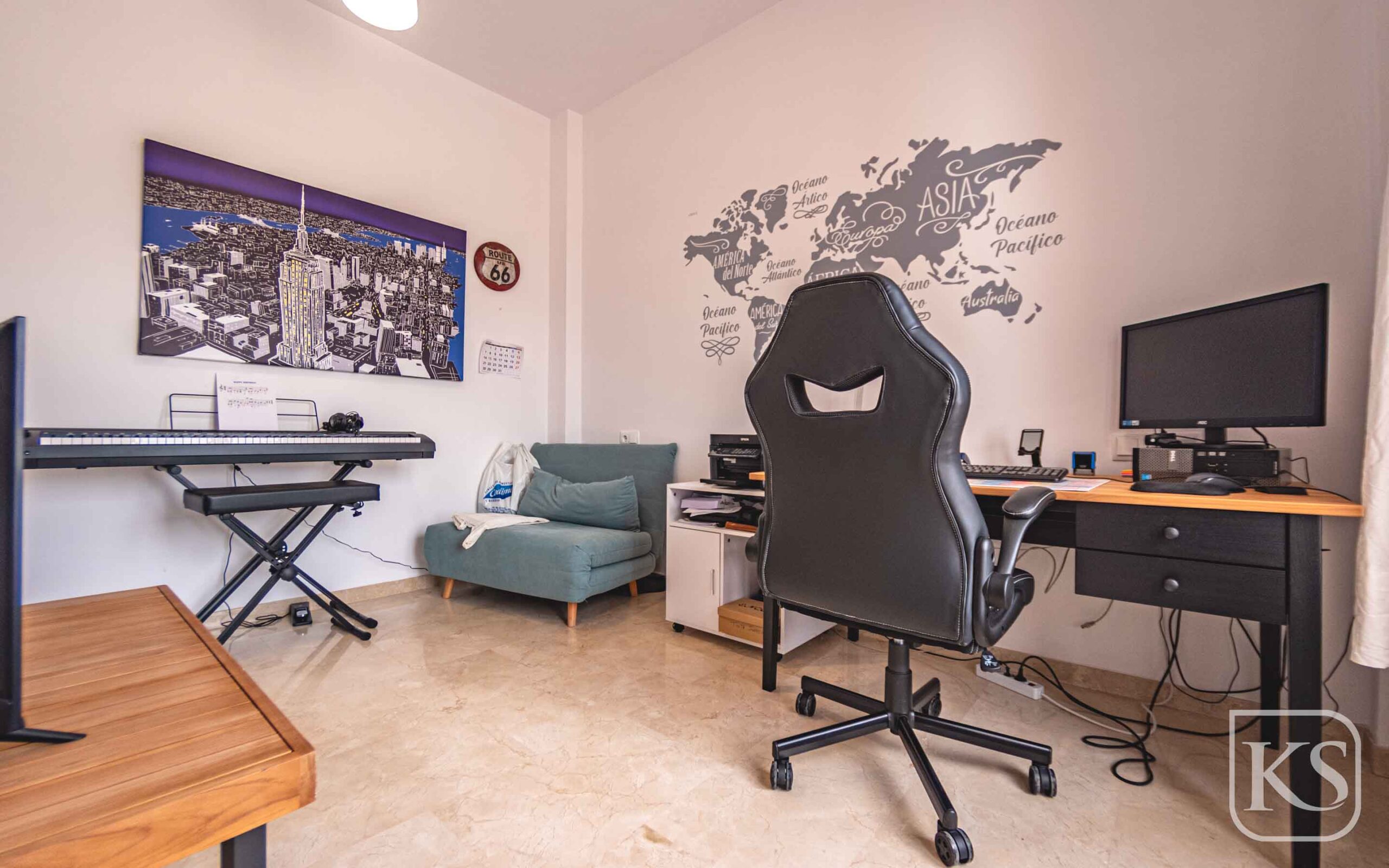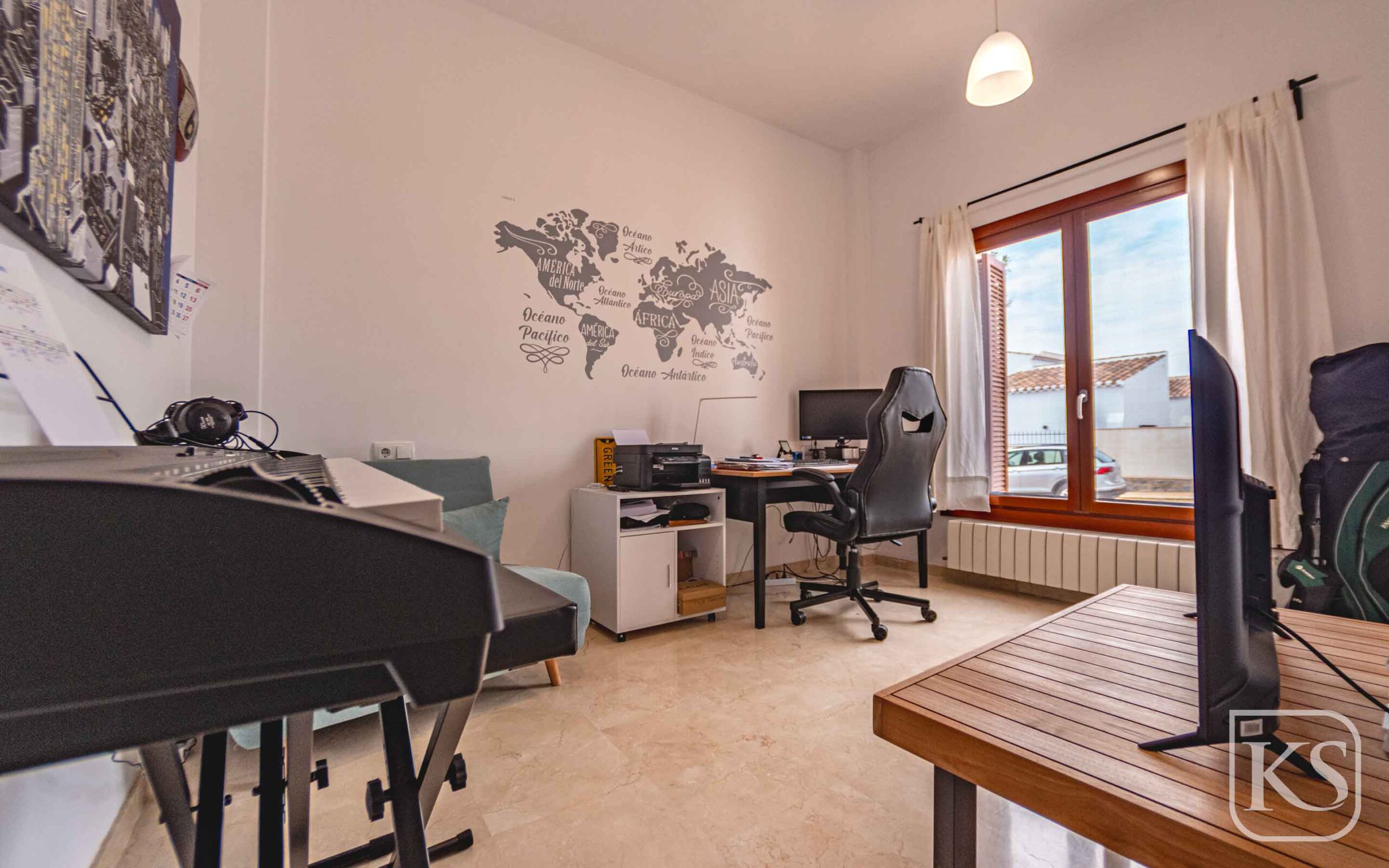 Inside, two double doors open into the master bedroom, complete with fitted wardrobes and an ensuite bathroom featuring his and her sinks. The first spare bedroom is bathed in natural light, while the second spare bedroom currently serves as an office. A spare bathroom is conveniently available for guests.