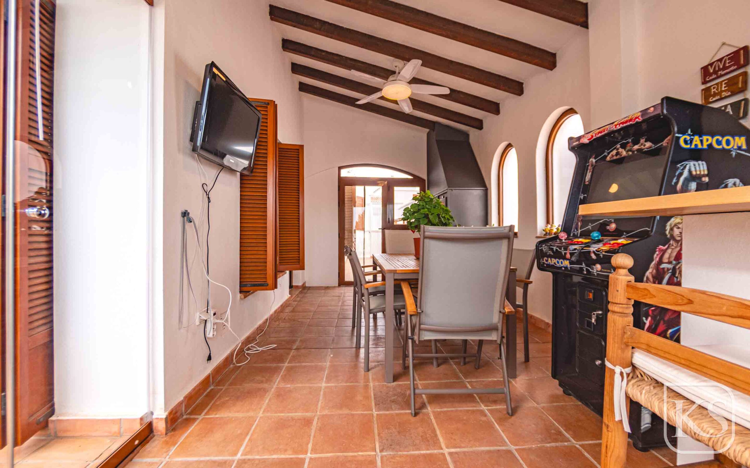 Here, you’ll find a well-equipped outdoor sink and a pathway leading to the barbecue/bar terrace, perfect for entertaining. The terrace also features a top-end barbecue setup, a bar with a view of the pool garden, and a nostalgic “Street Fighter” arcade machine. The pool area is a serene retreat, with pool tiles that harmonize with the light-colored outdoor seating, creating a tranquil ambiance. The east-facing garden overlooks the golf course, offering unobstructed views without the worry of golf balls interrupting your peace.