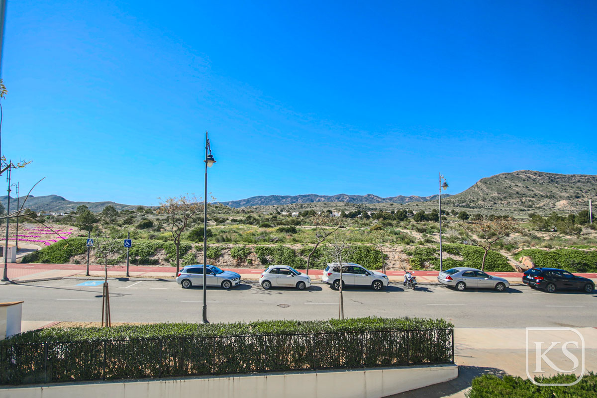 The enclosed terrace is a true highlight – fully fitted with glass curtains, it becomes a year-round living space with panoramic views of the resort and the rugged Murcian mountains beyond. There is one of five communal pools on the ground floor of the apartment block.