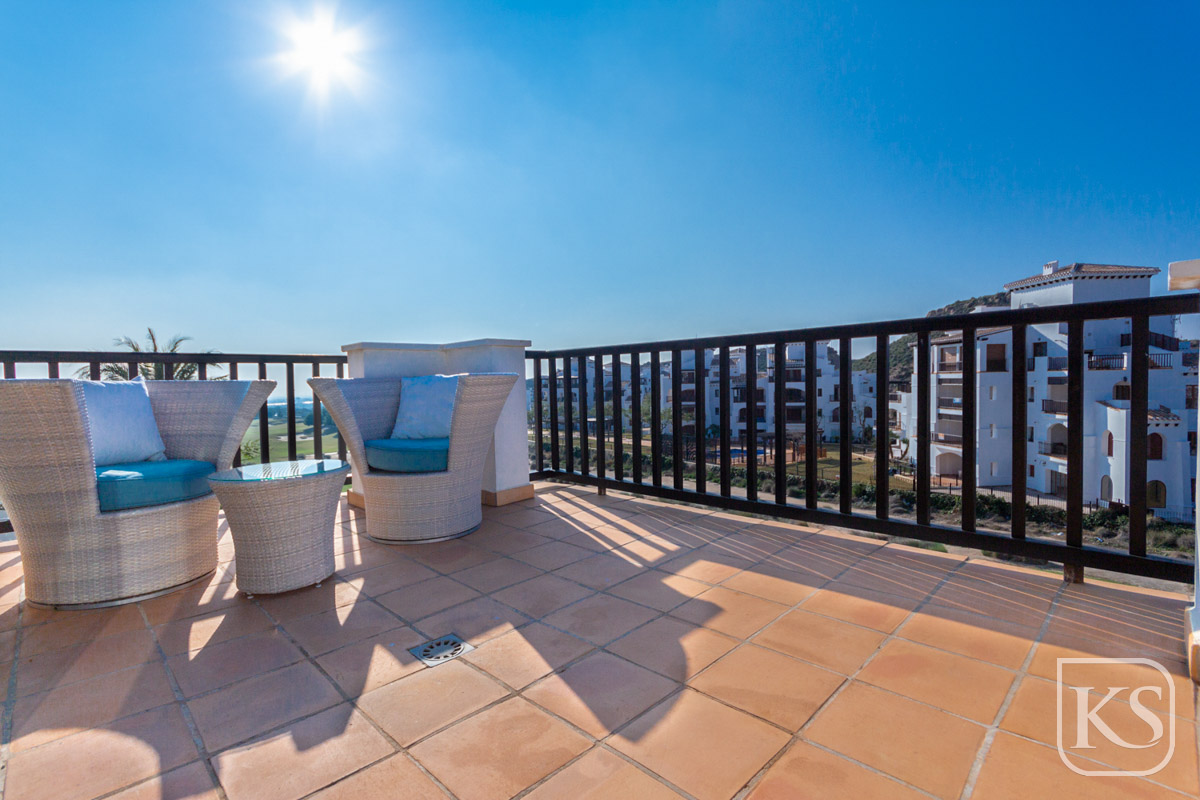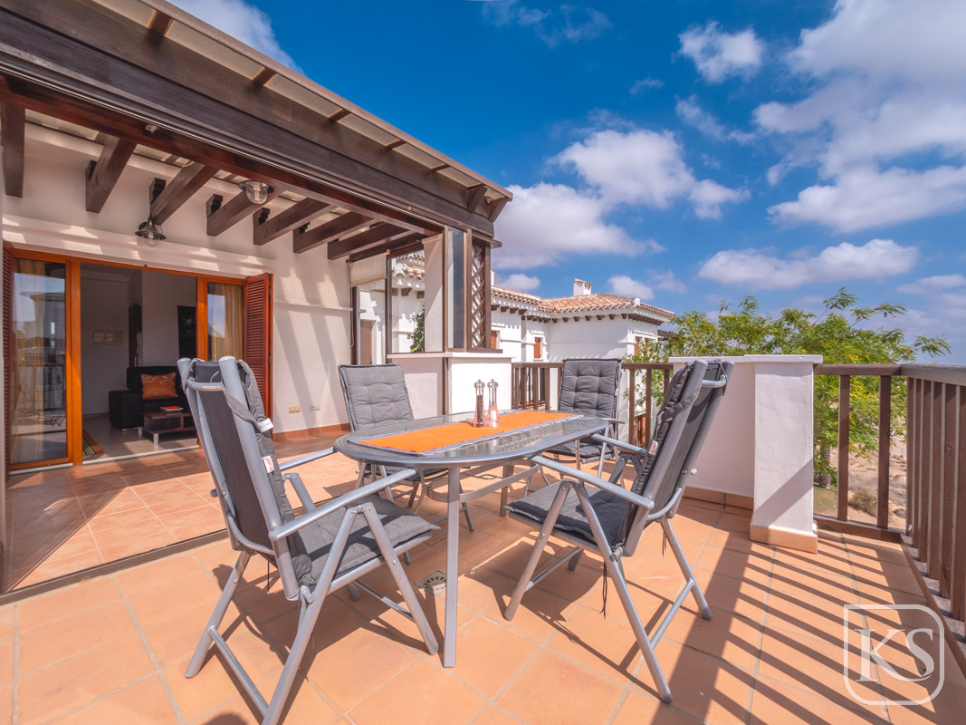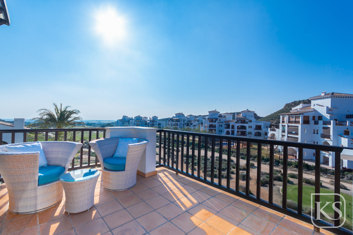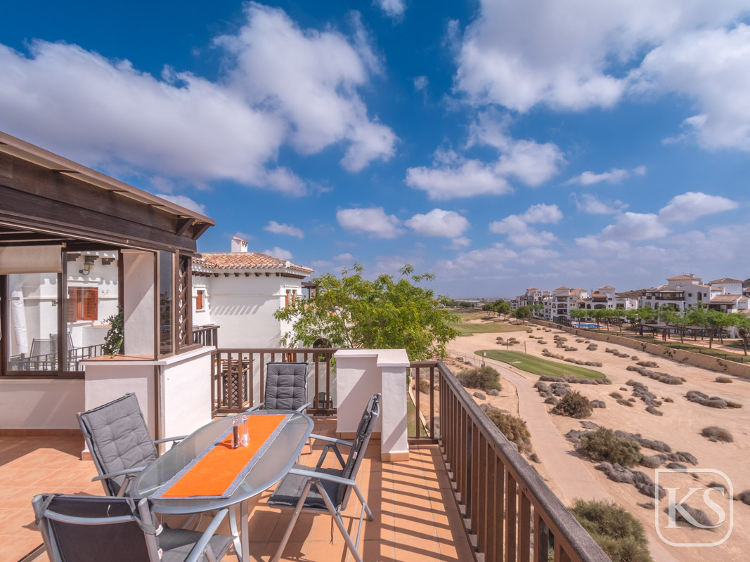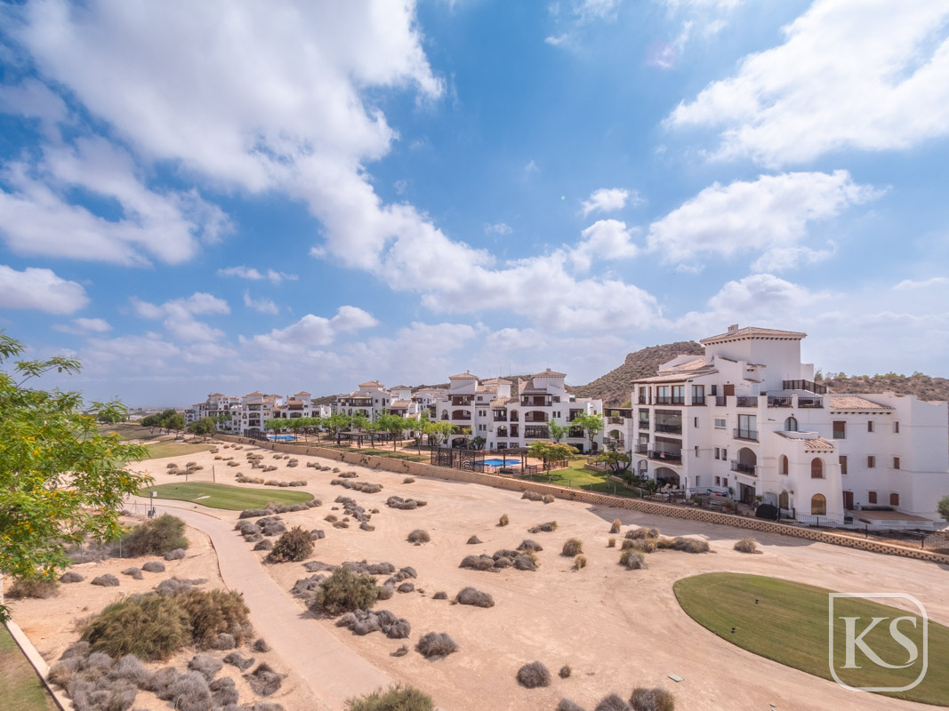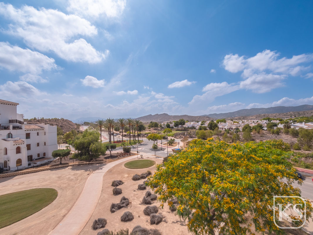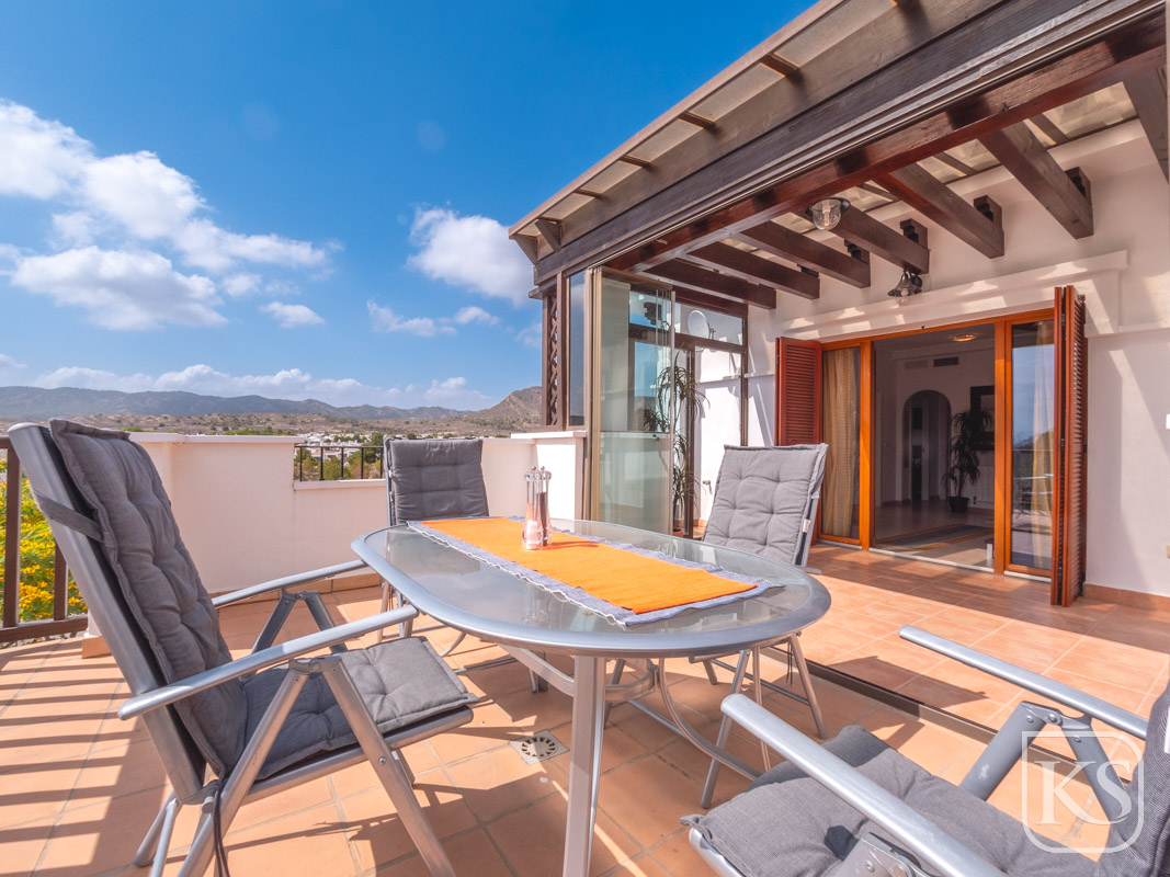 Discover Casa Harmony, a beautifully furnished top-floor apartment located in the prestigious El Valle Golf Resort in Murcia. This west-facing gem offers stunning views from every window, showcasing picturesque panoramas of lush golf courses and majestic mountains. Designed to maximize natural light, the apartment radiates brightness and warmth, creating a welcoming and tranquil living space.