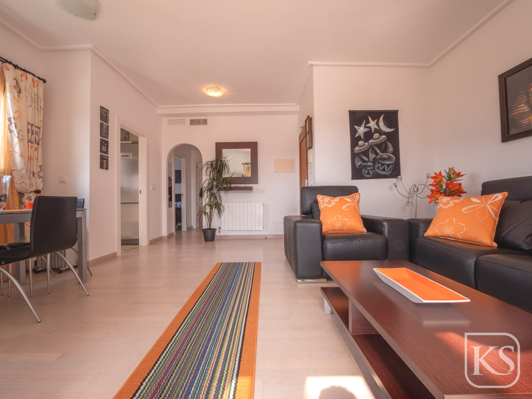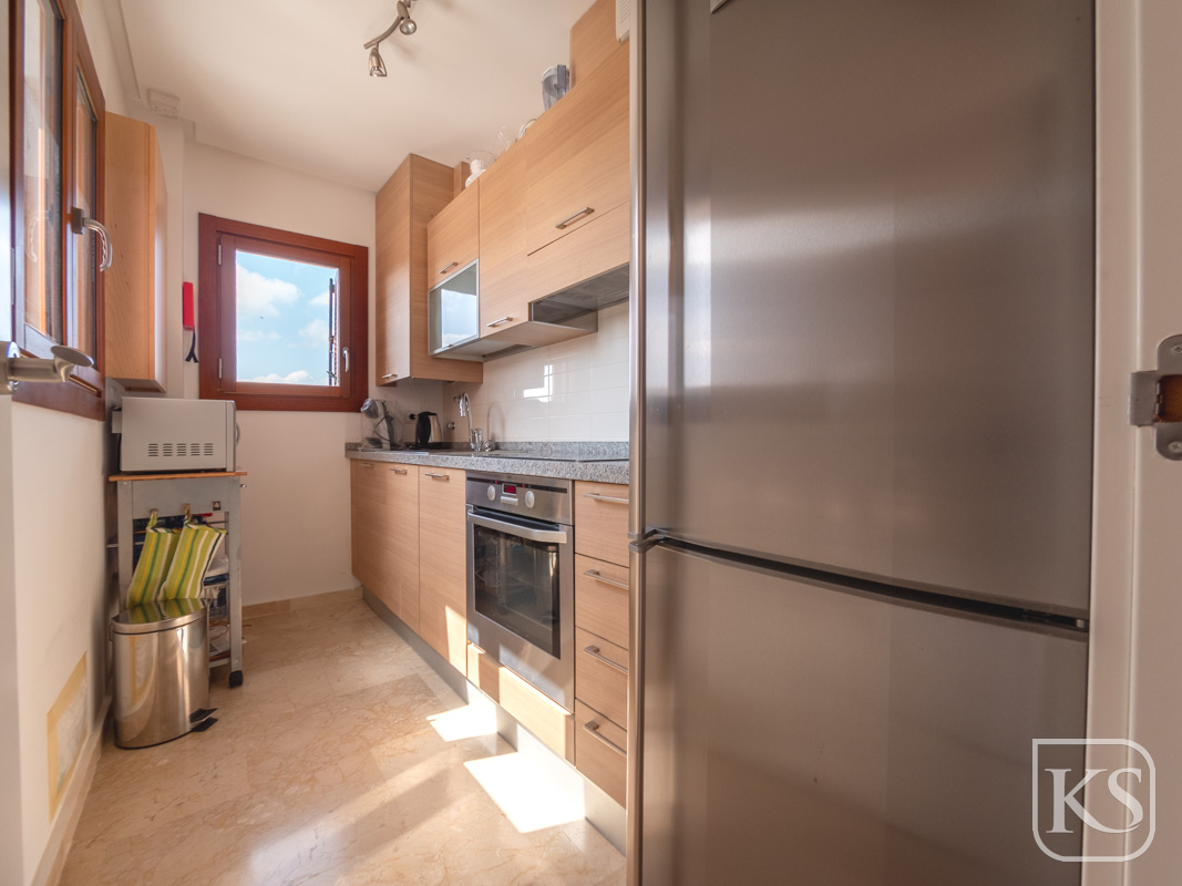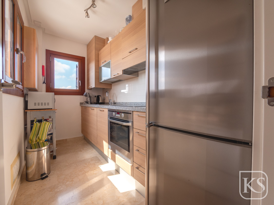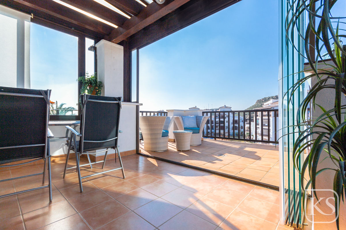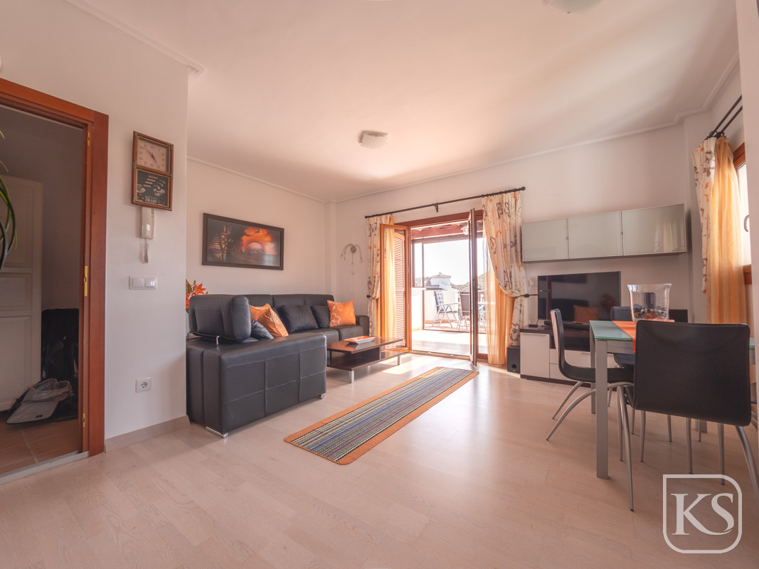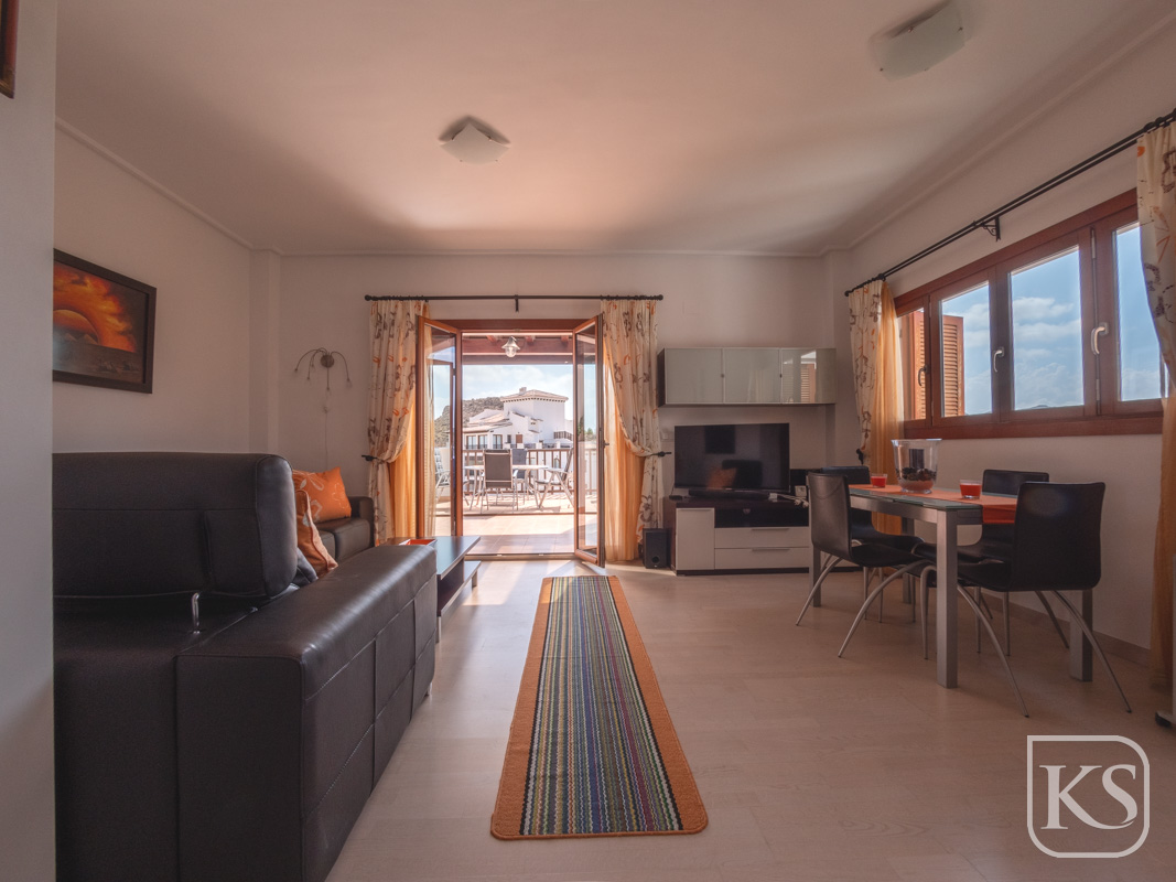 The apartment features two spacious bedrooms and a bathroom. The open-plan living and dining room is perfect for both entertaining and unwinding, while the fully equipped kitchen includes essential white goods such as a fridge freezer, washing machine, and built-in dishwasher. The large terrace, complete with glass curtains, offers a serene spot to relax and enjoy the breathtaking views of the golf course and mountains. For added luxury, the terrace includes a private jacuzzi with stunning mountain vistas.