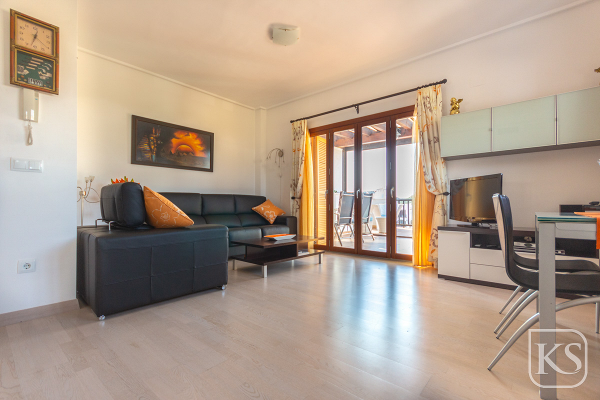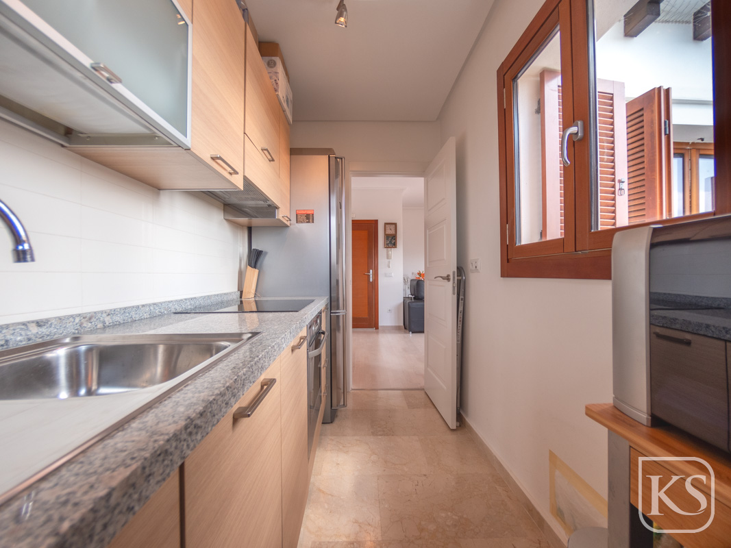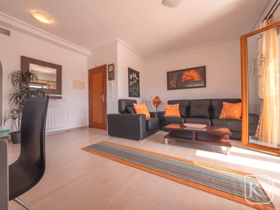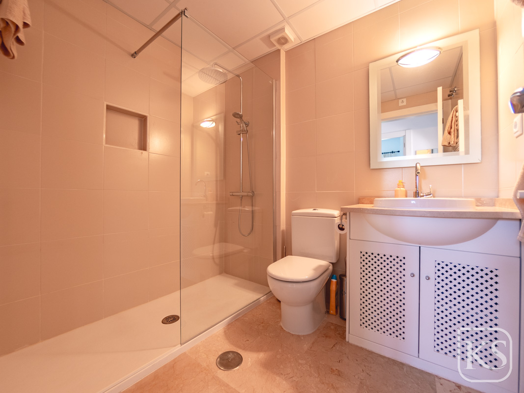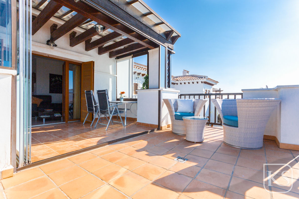 The apartment features two spacious bedrooms and a bathroom. The open-plan living and dining room is perfect for both entertaining and unwinding, while the fully equipped kitchen includes essential white goods such as a fridge freezer, washing machine, and built-in dishwasher. The large terrace, complete with glass curtains, offers a serene spot to relax and enjoy the breathtaking views of the golf course and mountains. For added luxury, the terrace includes a private jacuzzi with stunning mountain vistas.