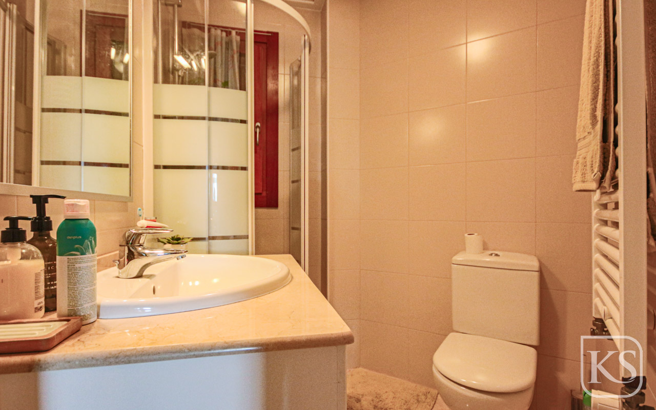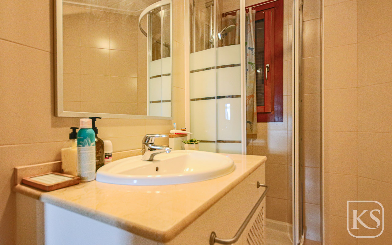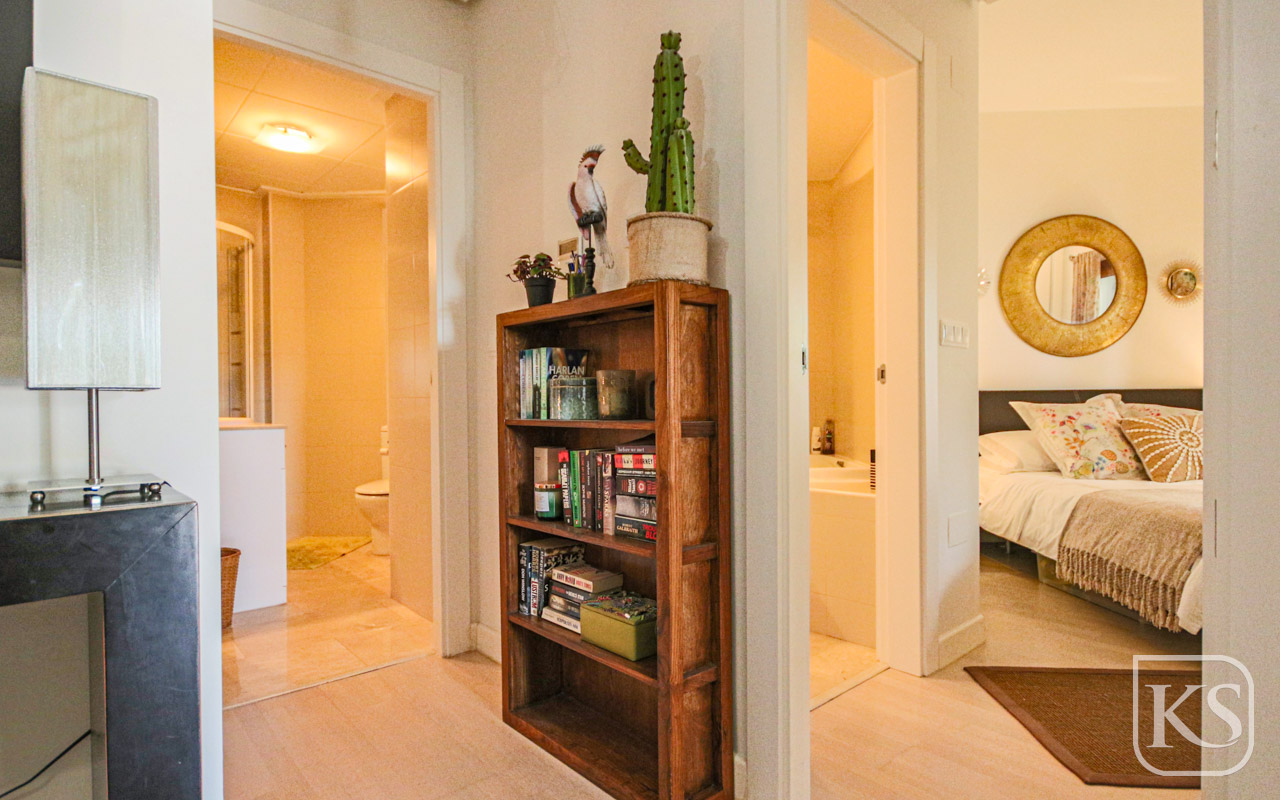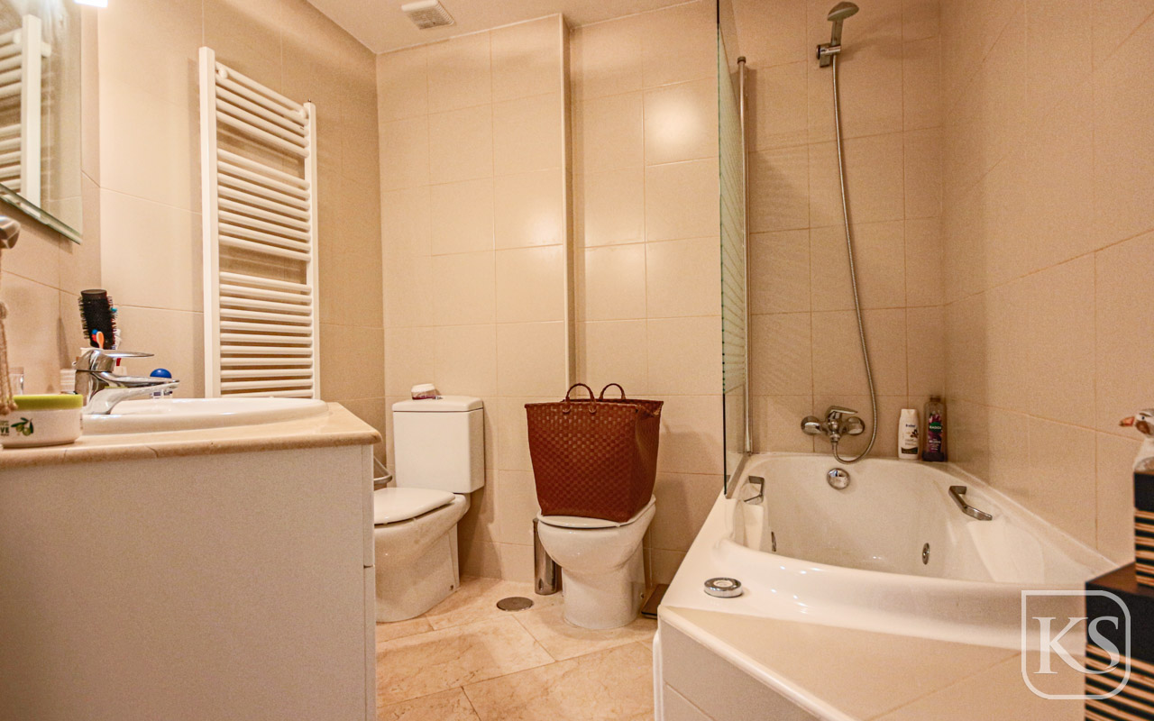 The main bedroom, located at the end of the hallway, features built-in wardrobes and an ensuite bathroom with a jet bathtub. This bedroom also has direct access to the terrace. The spare bathroom is equipped with a walk-in shower, and the second bedroom also includes built-in wardrobes.