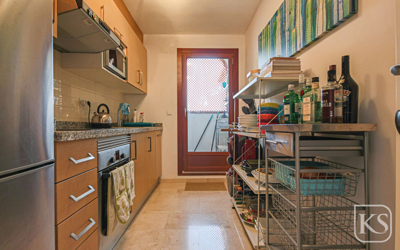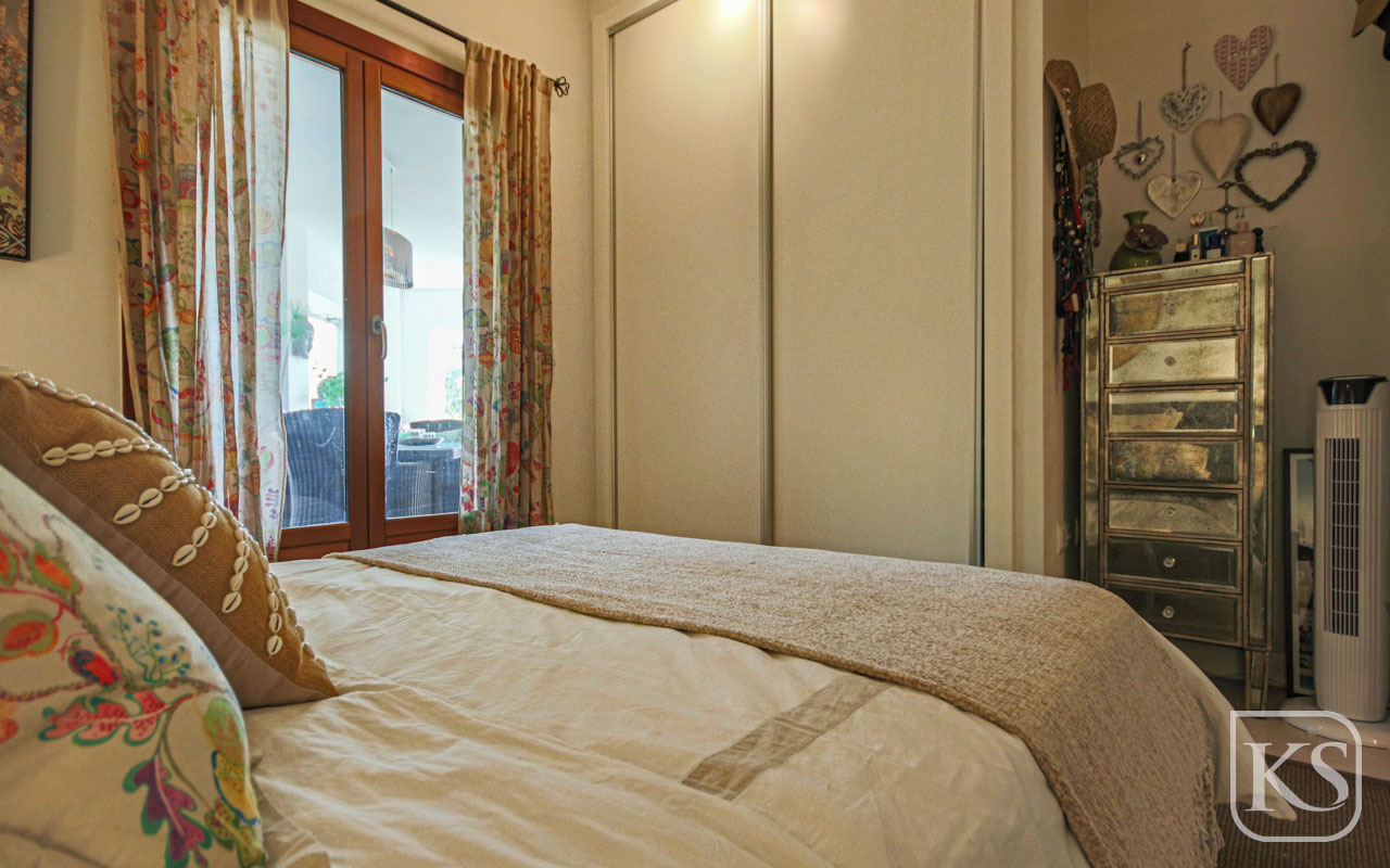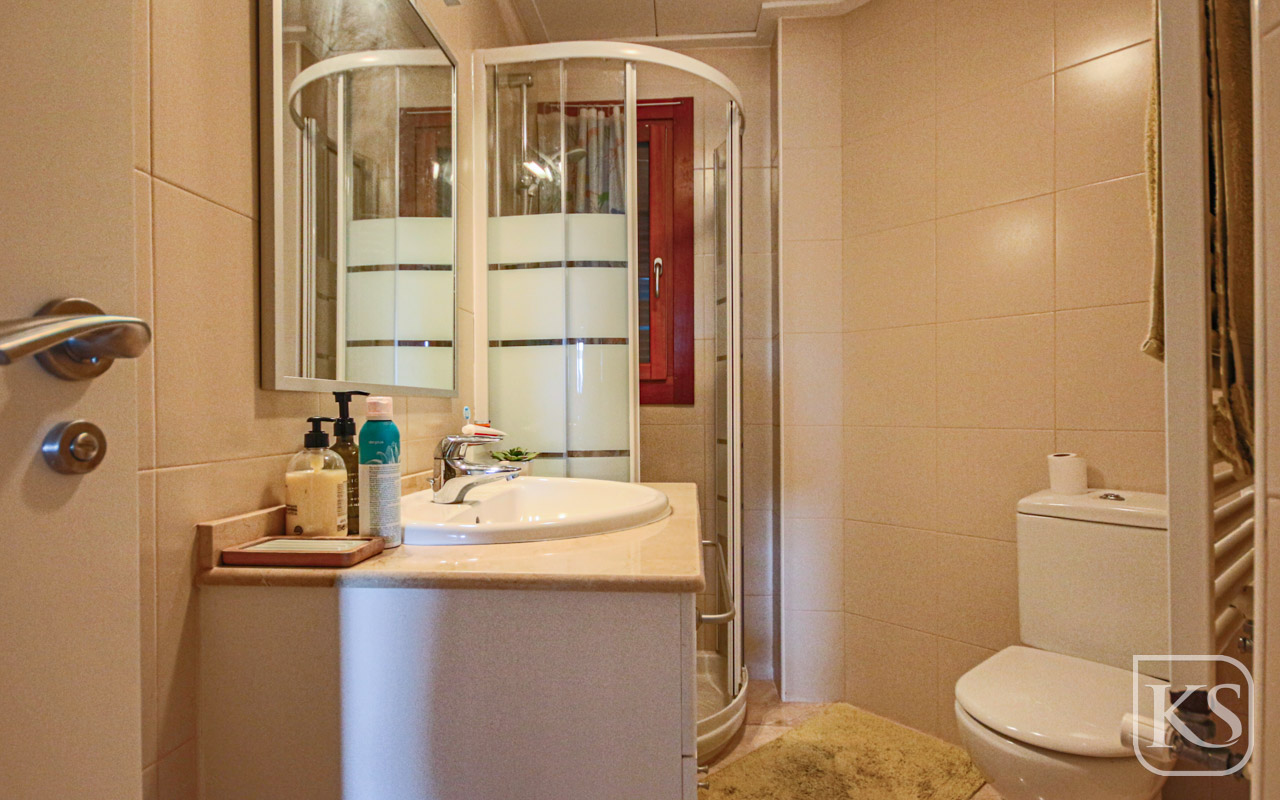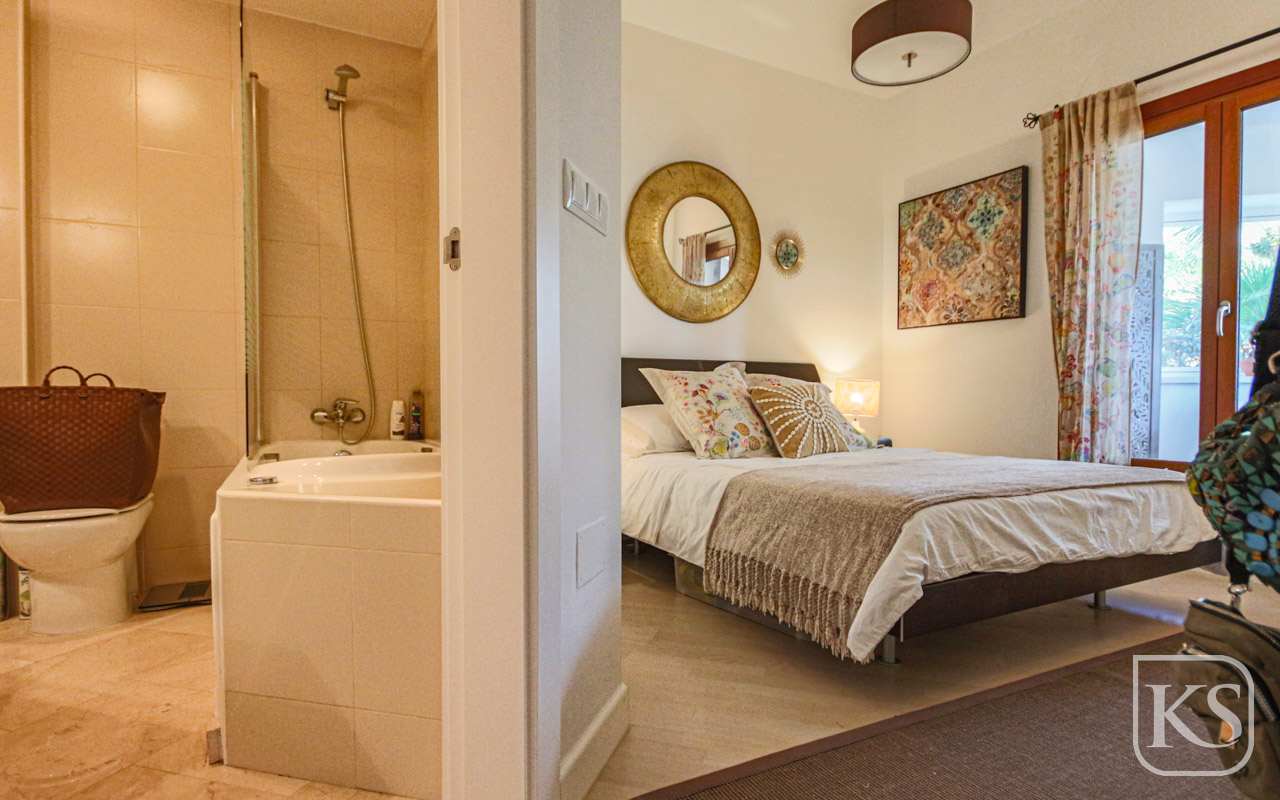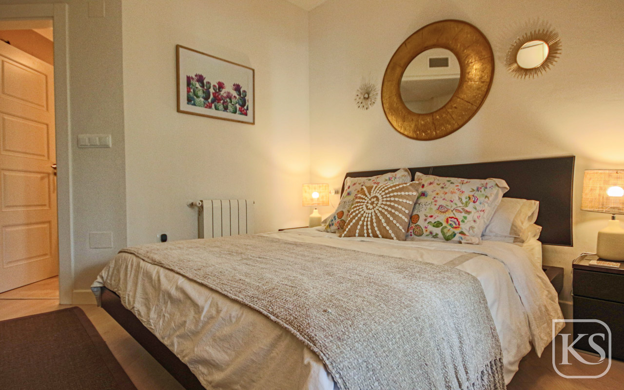 The main bedroom, located at the end of the hallway, features built-in wardrobes and an ensuite bathroom with a jet bathtub. This bedroom also has direct access to the terrace. The spare bathroom is equipped with a walk-in shower, and the second bedroom also includes built-in wardrobes.