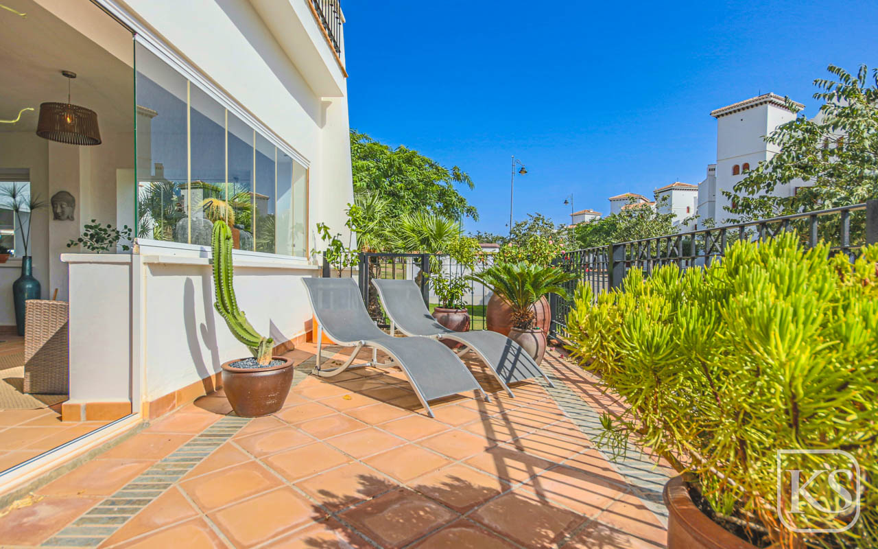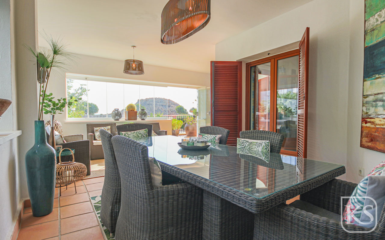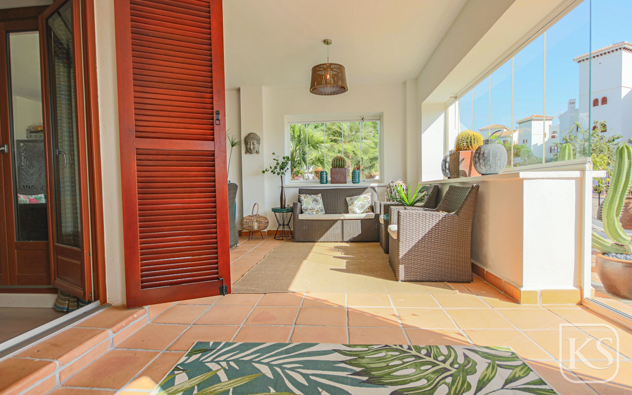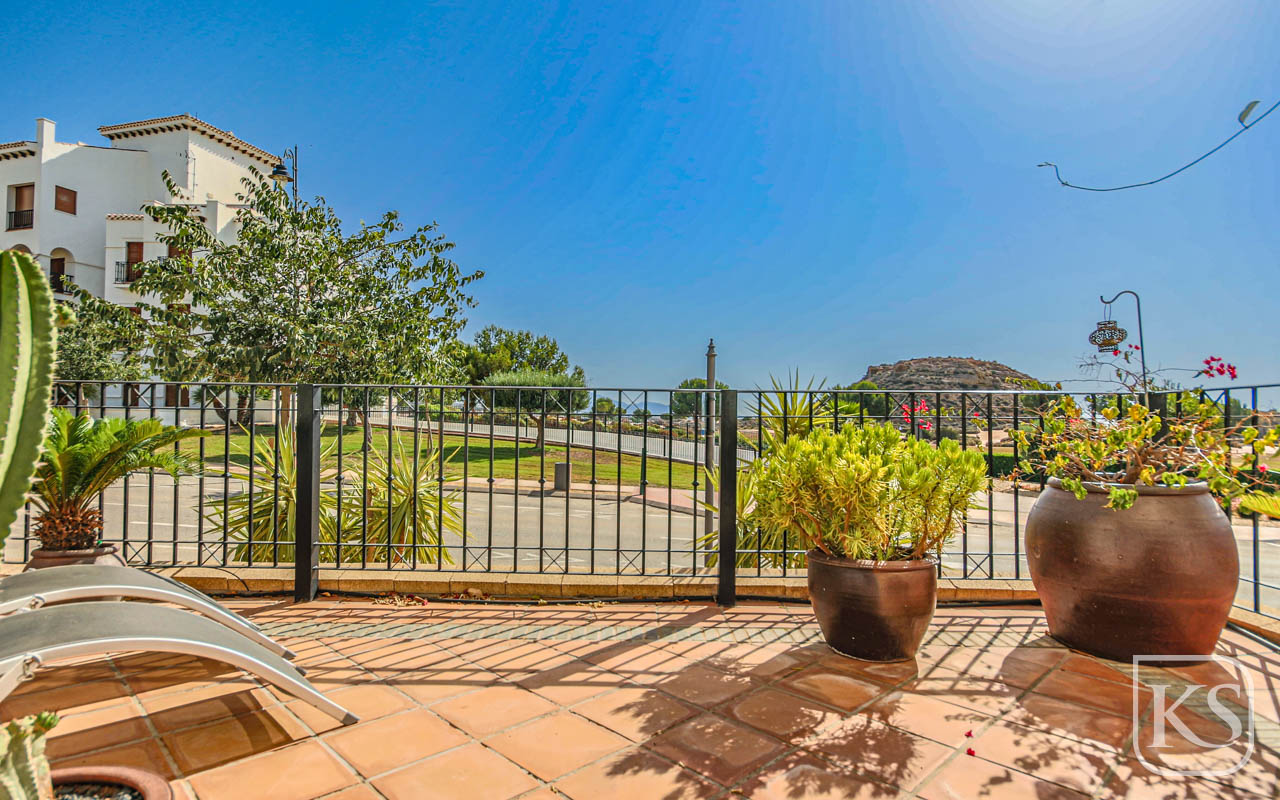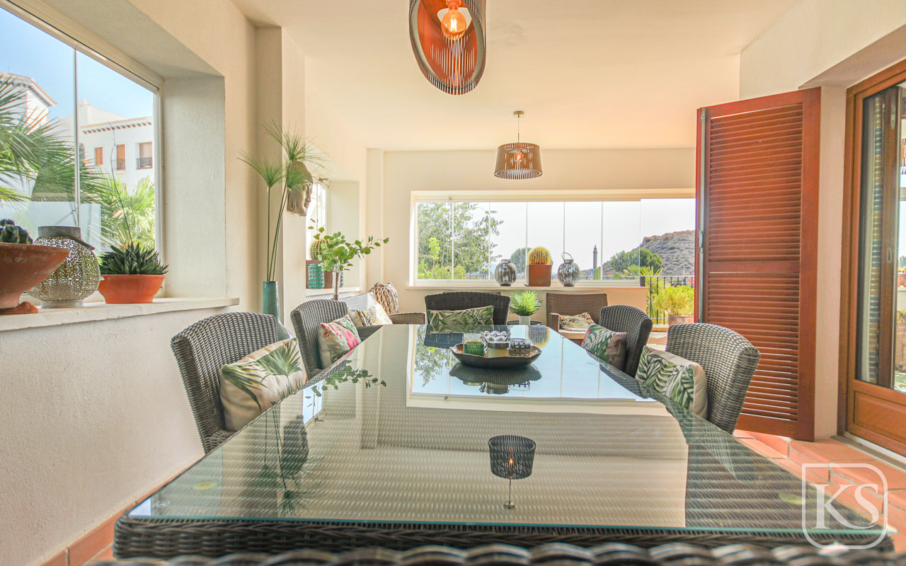 Keystyle Properties welcomes you to Casa Jay, a charming 2-bedroom, 2-bathroom ground floor apartment with stunning golf views on El Valle Golf Resort in Murcia. This beautiful property features a large L-shaped enclosed terrace with glass curtains, perfect for enjoying the sun year-round. The east-facing orientation ensures ample natural light, creating a bright and welcoming atmosphere.