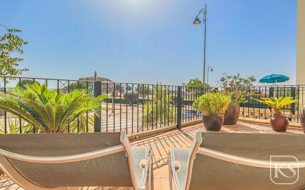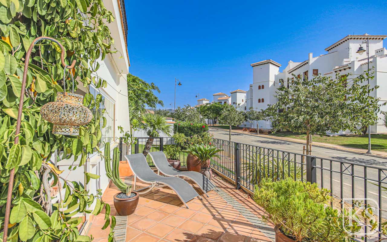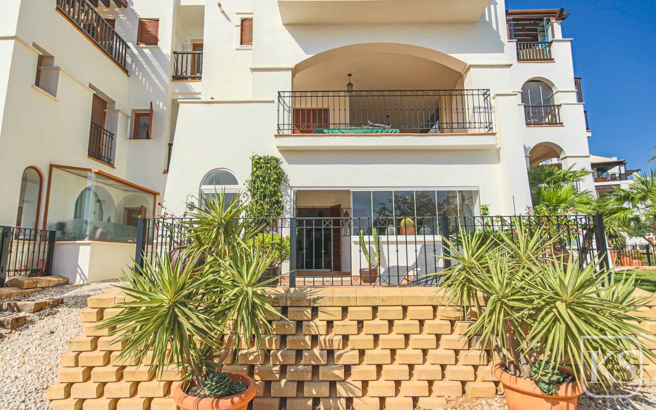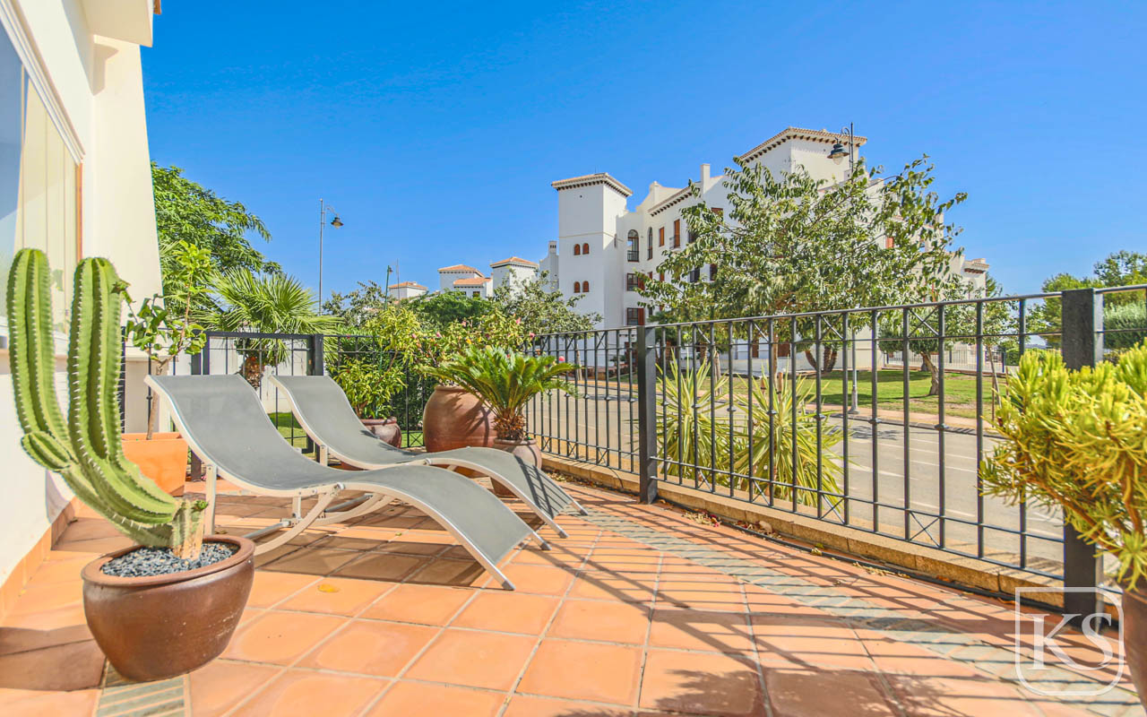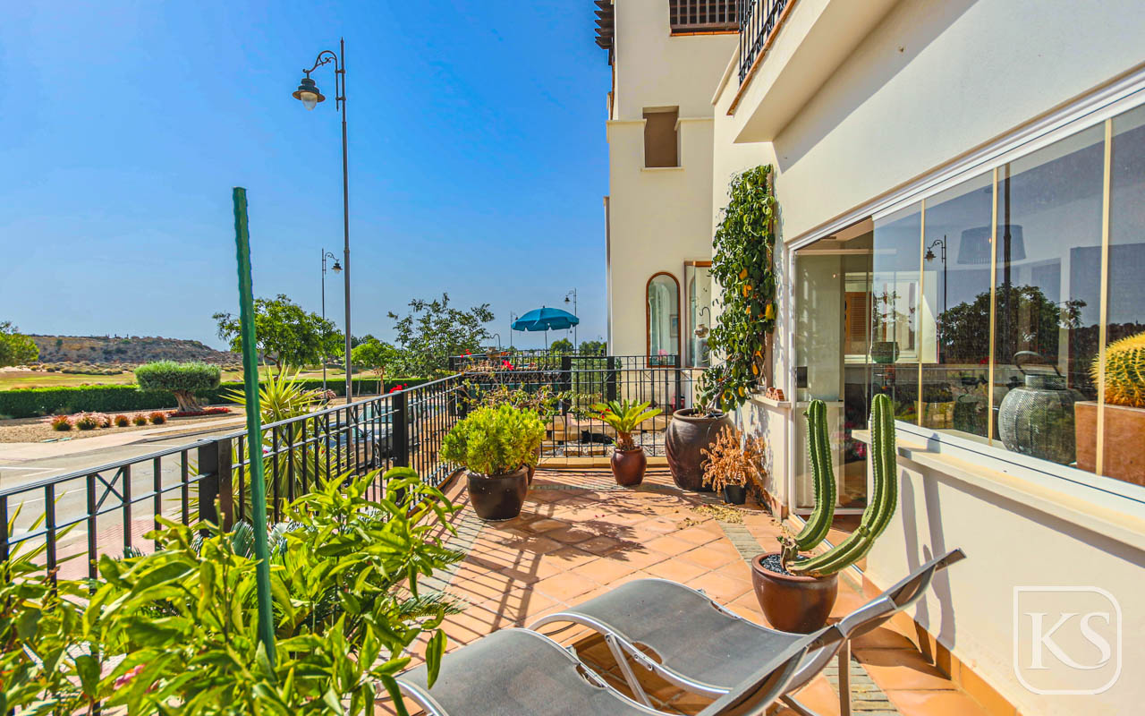 Keystyle Properties welcomes you to Casa Jay, a charming 2-bedroom, 2-bathroom ground floor apartment with stunning golf views on El Valle Golf Resort in Murcia. This beautiful property features a large L-shaped enclosed terrace with glass curtains, perfect for enjoying the sun year-round. The east-facing orientation ensures ample natural light, creating a bright and welcoming atmosphere.