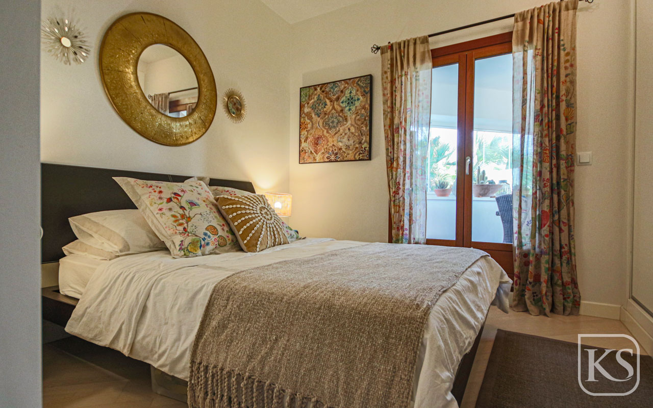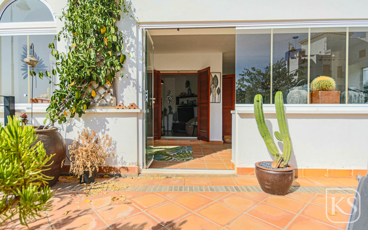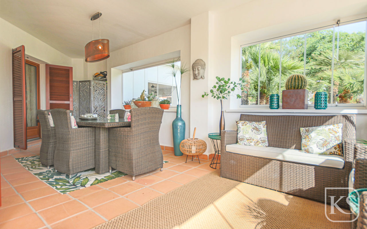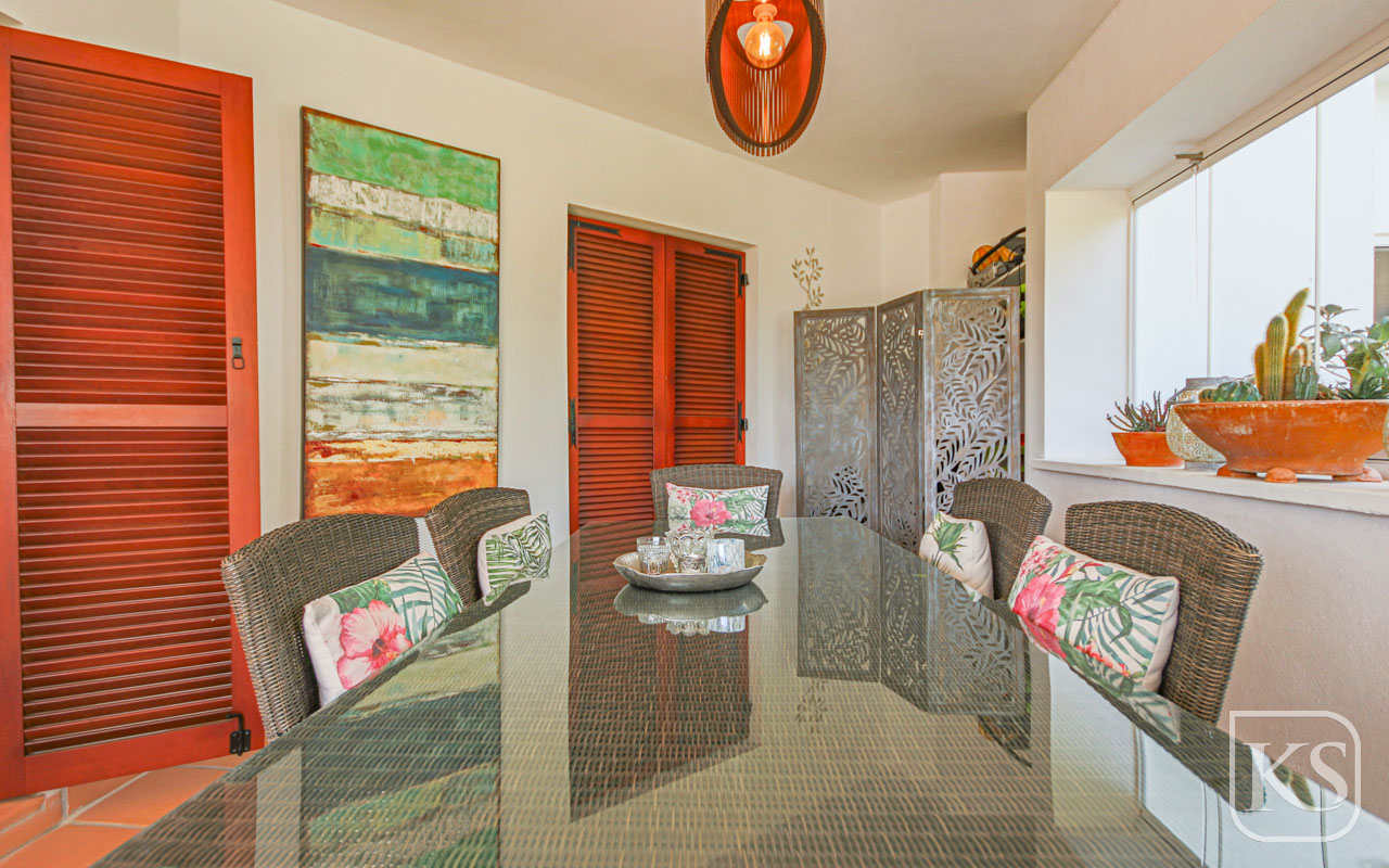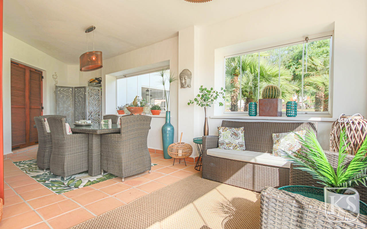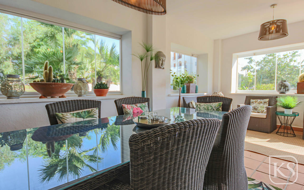 Upon entering Casa Jay, you'll find the kitchen and laundry space to your right. At the end of the hallway to the right, there is the living room which opens out to the spacious L-shaped enclosed terrace. The glass curtains can be fully opened, seamlessly connecting the indoor and outdoor spaces. The outdoor terrace provides breathtaking views of the golf course, making it an ideal spot for relaxation. A gate from the terrace offers easy access to the largest communal pool on the resort, just a stone's throw away.
