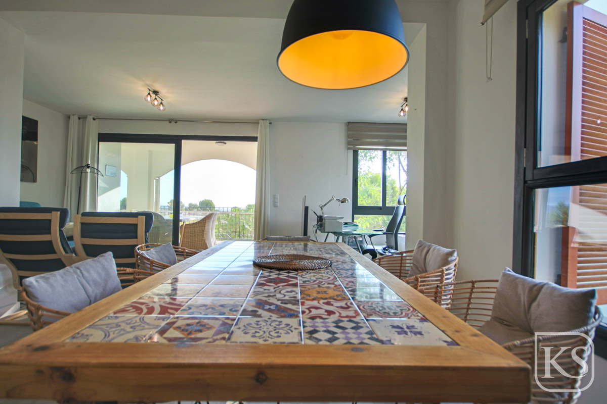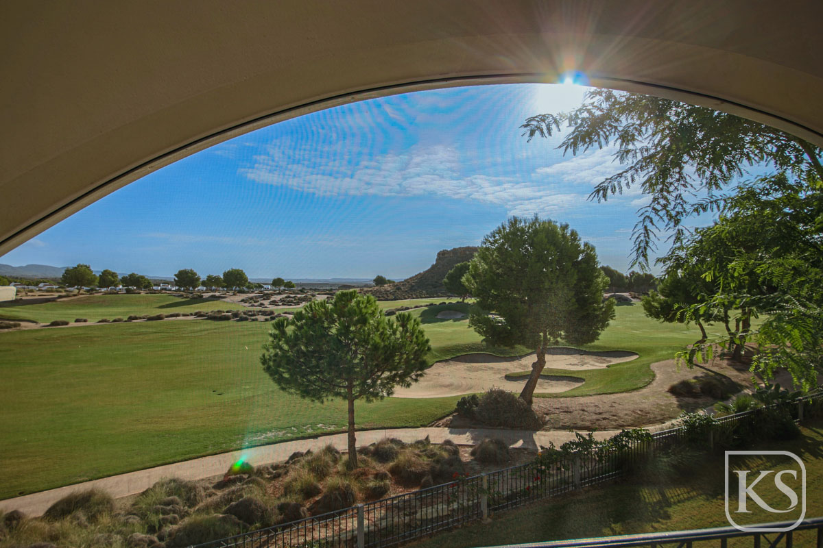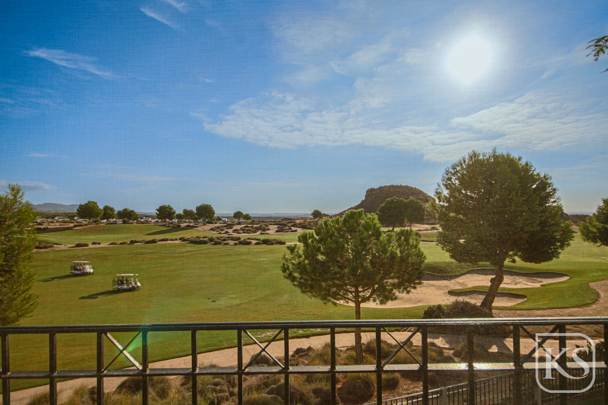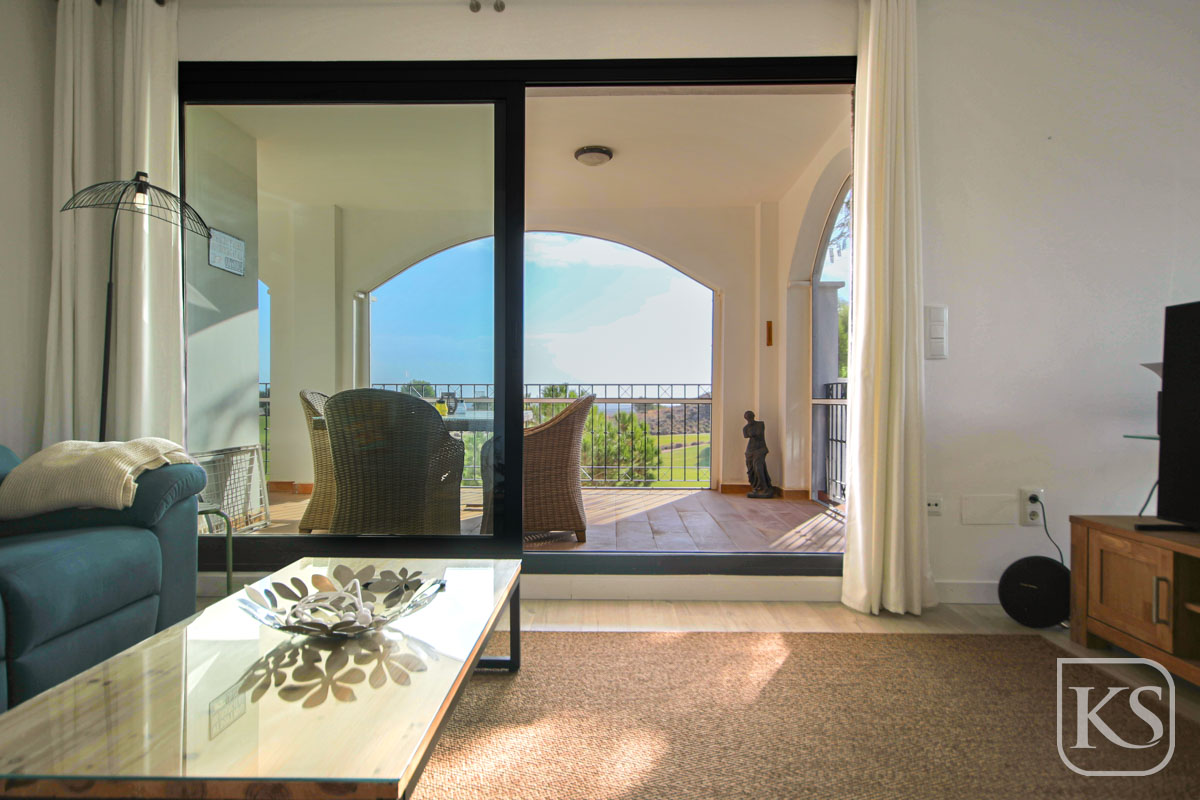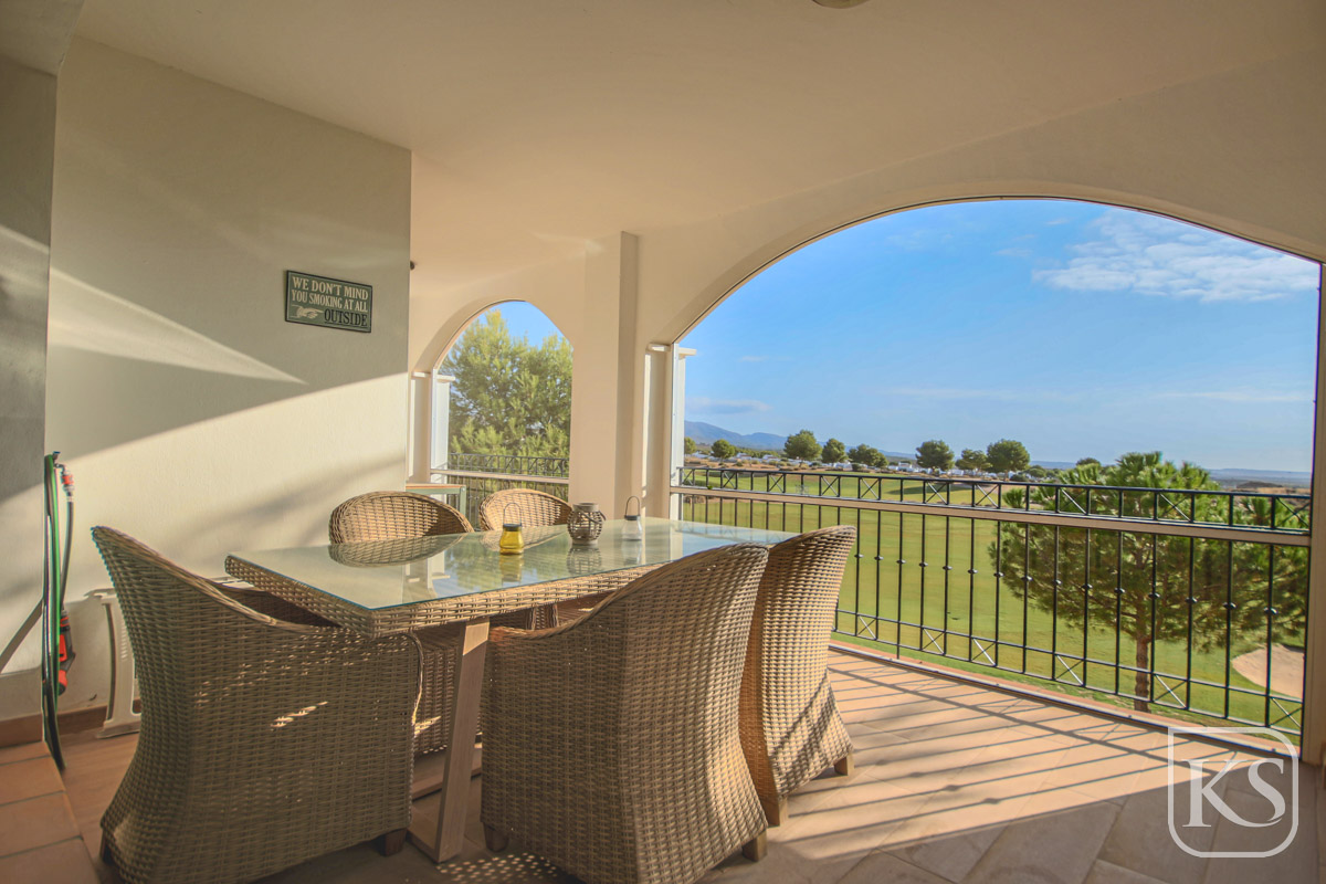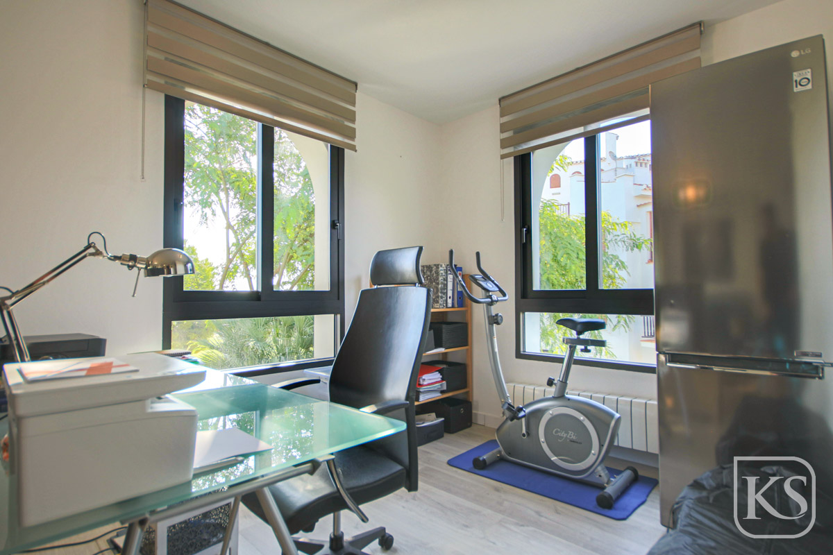 The living area opens onto a large L-shaped terrace, offering beautiful golf course views from every window. A former jacuzzi area has been converted into an office, making the living space even more practical and spacious.