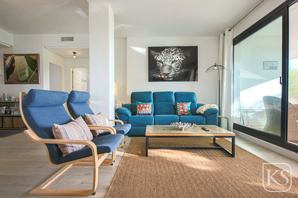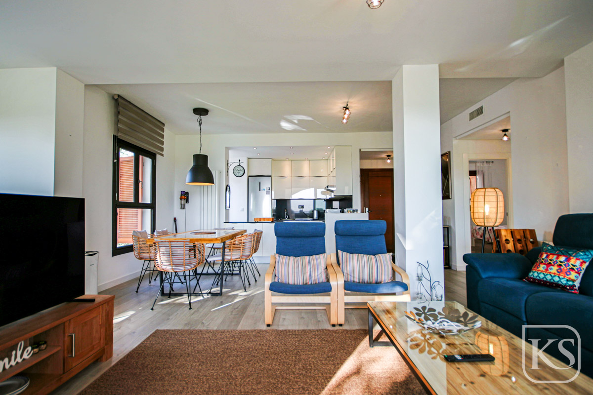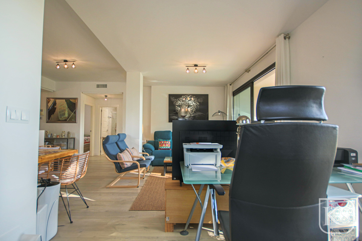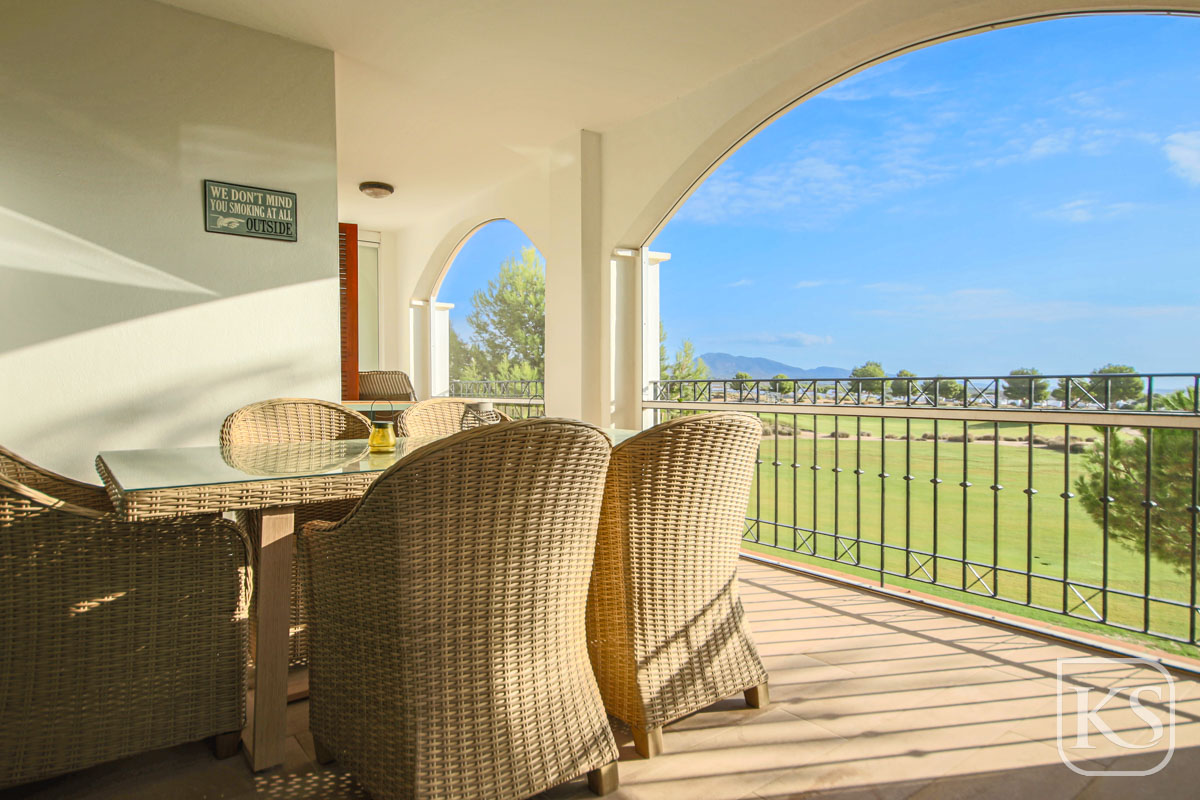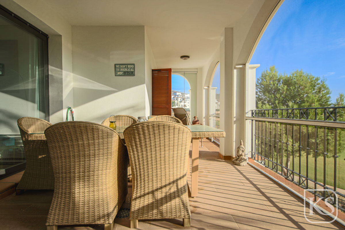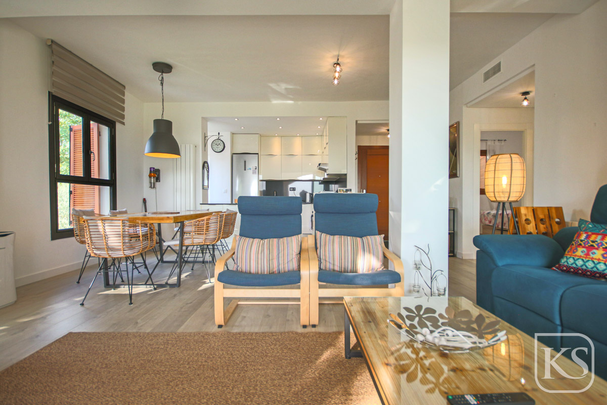 The living area opens onto a large L-shaped terrace, offering beautiful golf course views from every window. A former jacuzzi area has been converted into an office, making the living space even more practical and spacious.