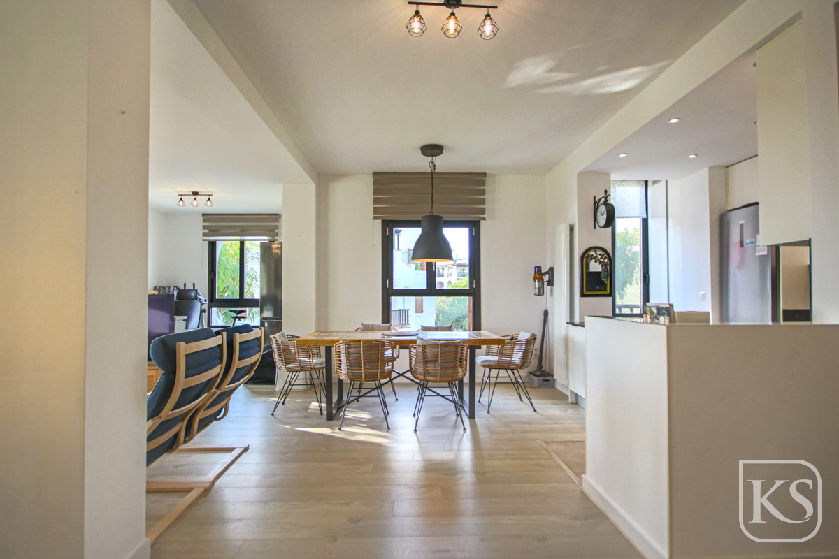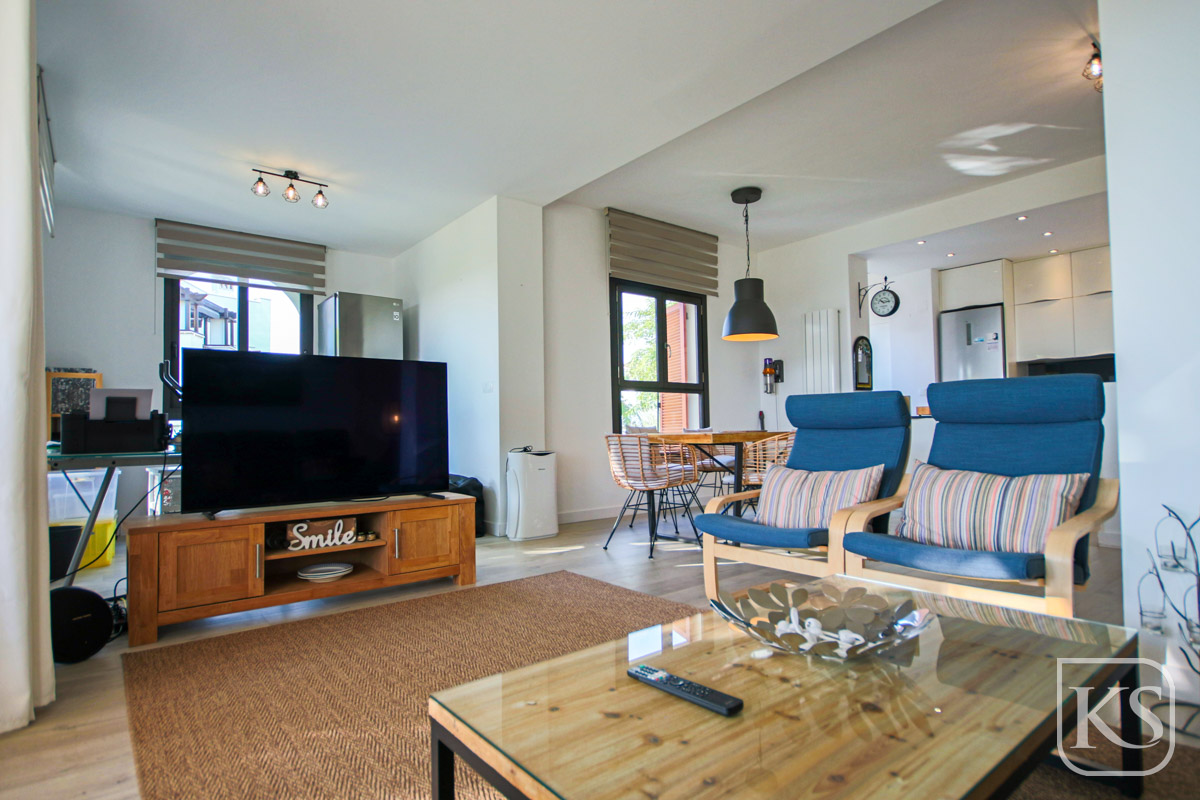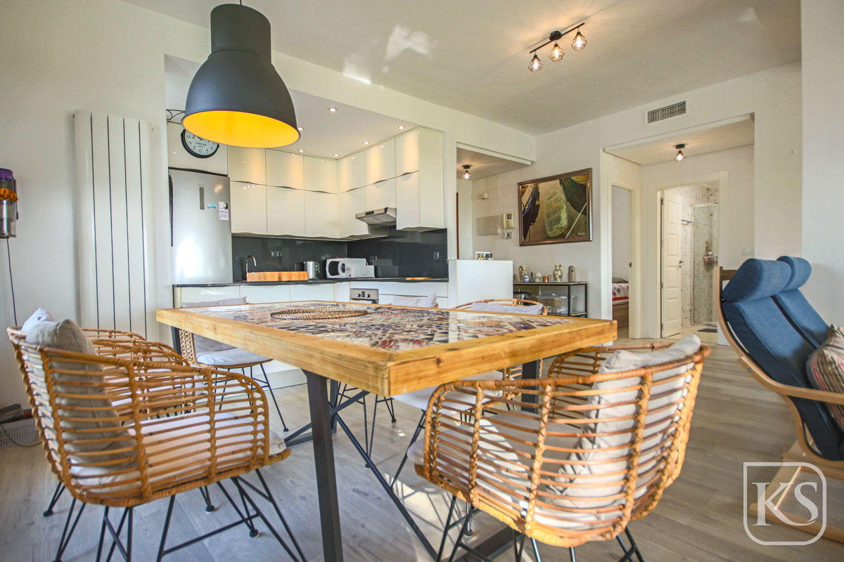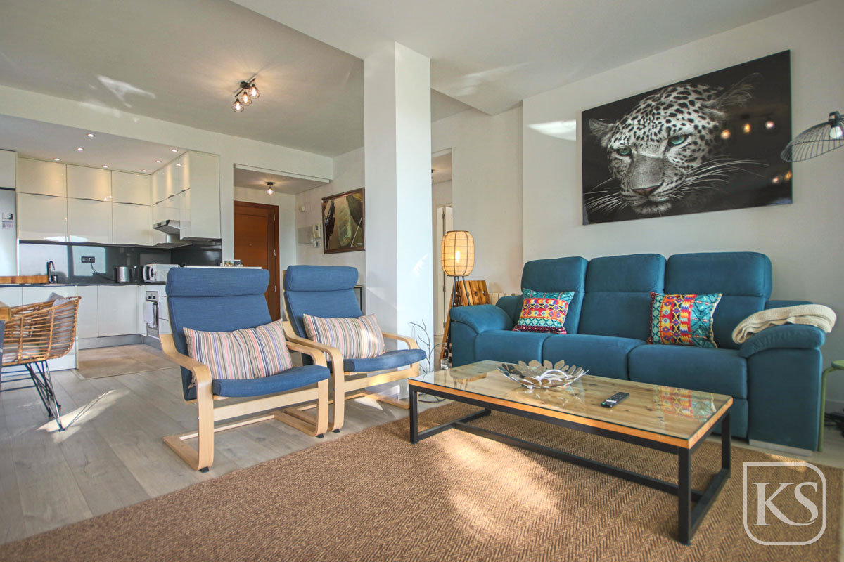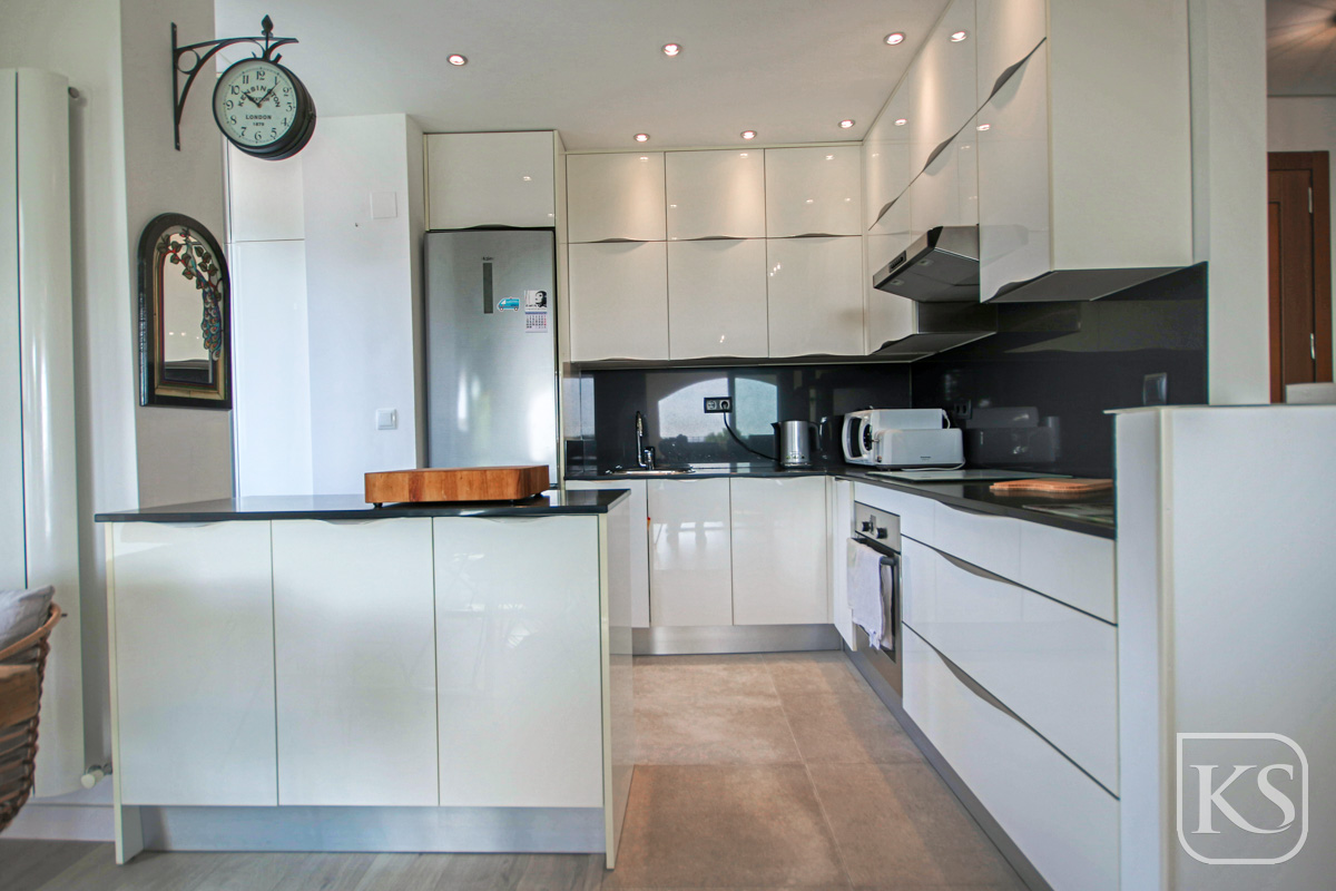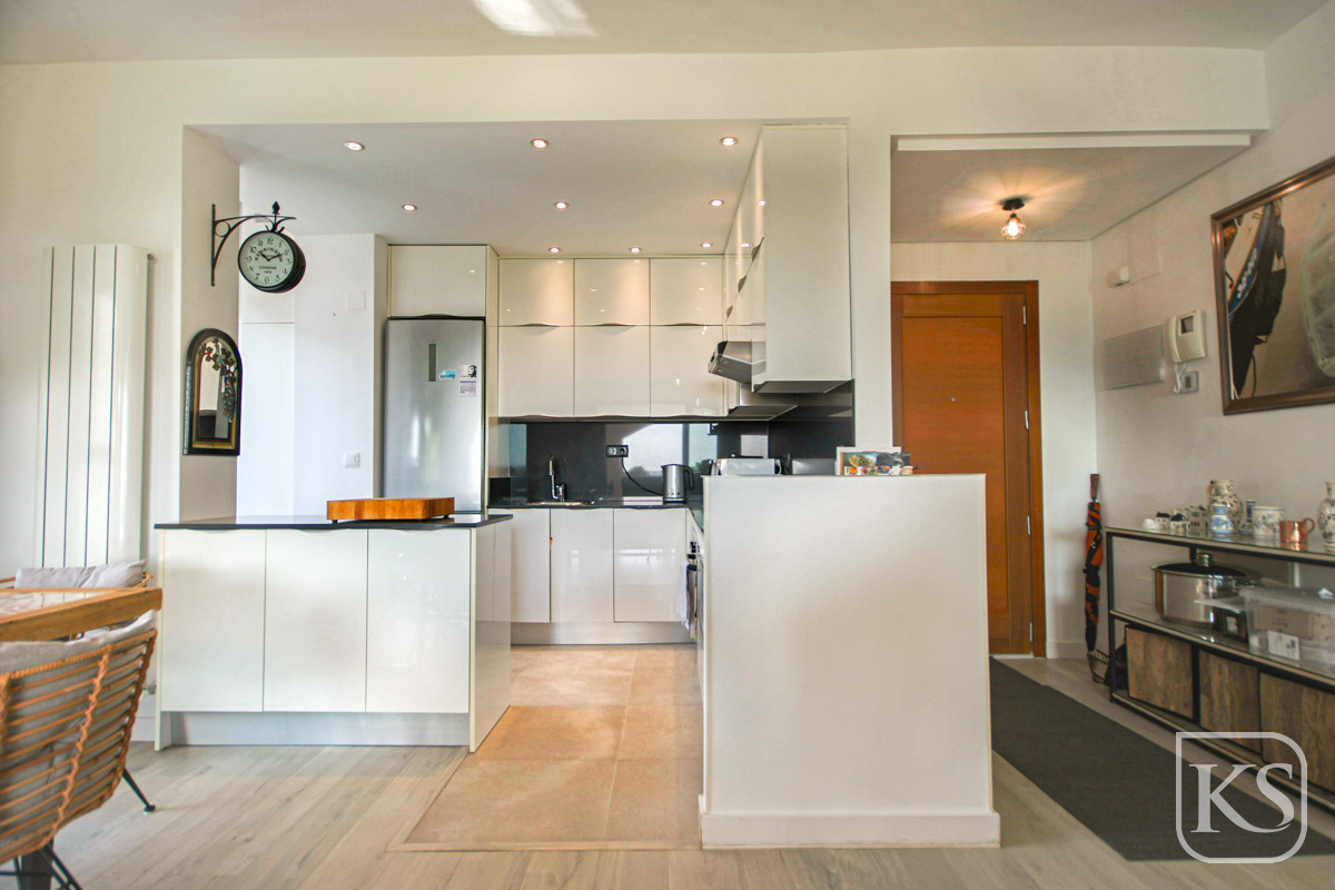 The apartment has a bright and spacious open-plan living area where the kitchen, dining, and lounge flow together. The kitchen wall has been removed to create a modern, open layout with a clean white design that complements the rest of the home.