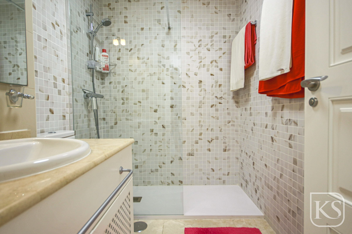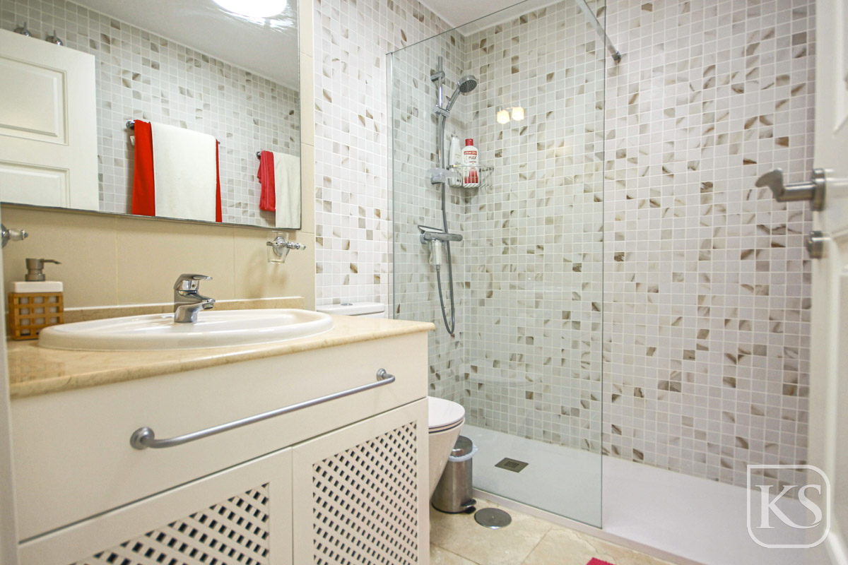 Both bathrooms have been recently remodelled to a high standard. The master bedroom has an ensuite bathroom and direct access to the terrace through sliding glass doors, creating an indoor-outdoor living feel.