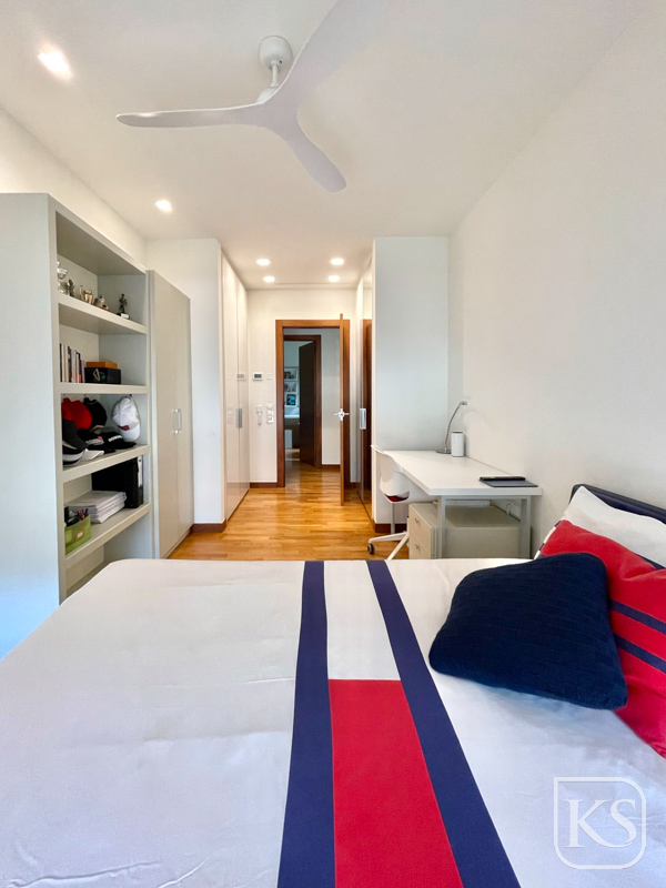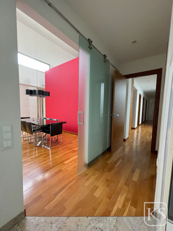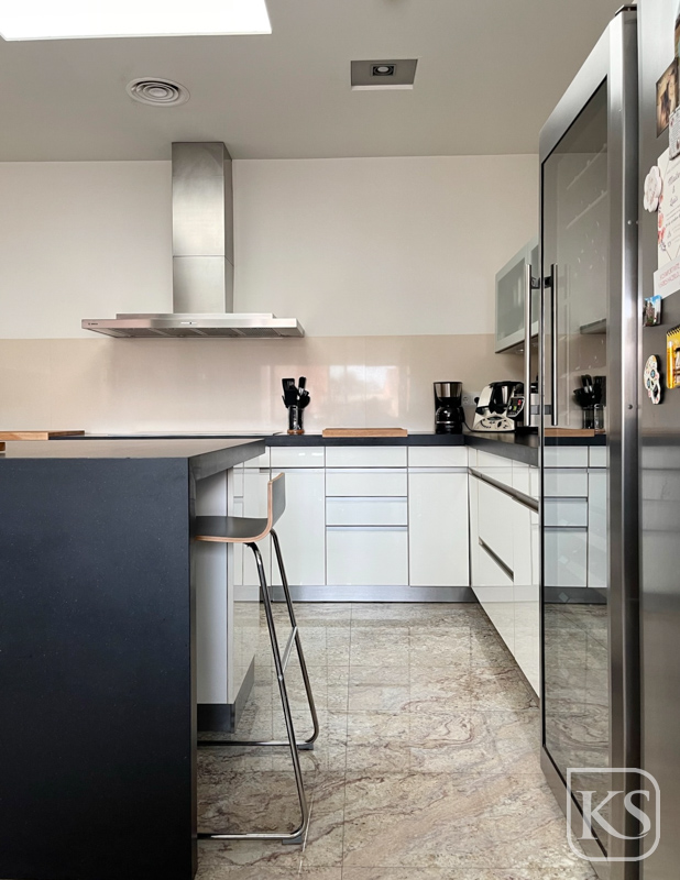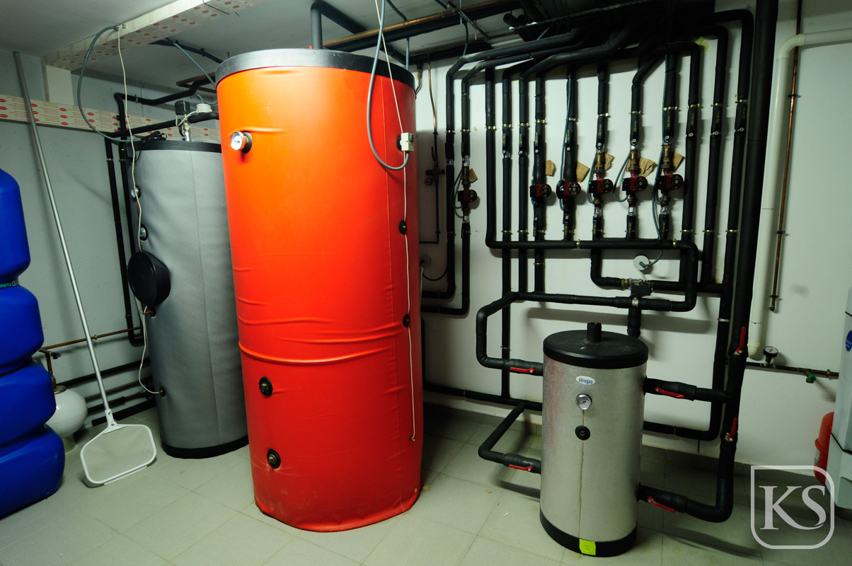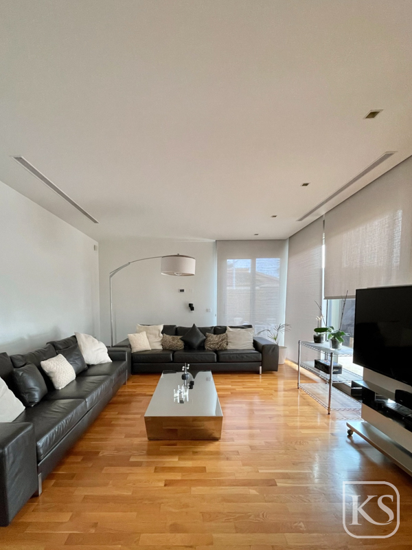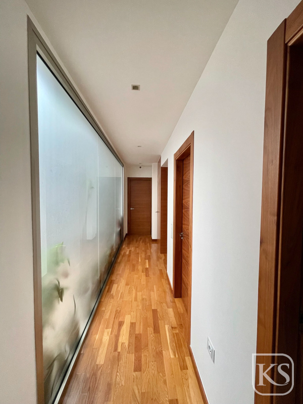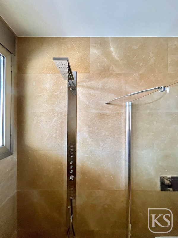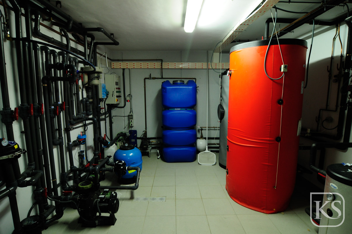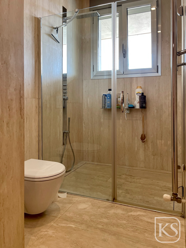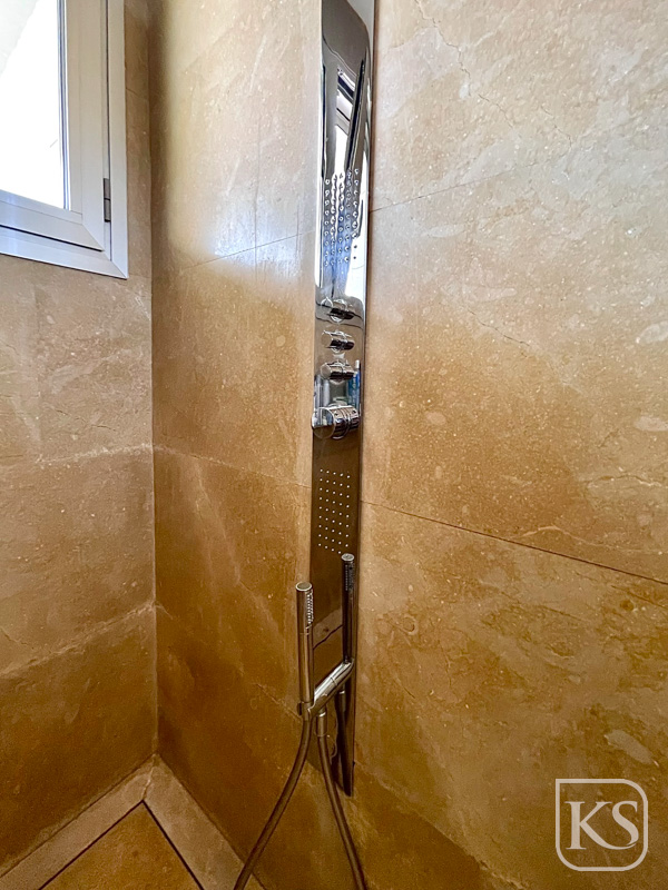 The villa features a mixed system of underfloor heating and Fancoil air conditioning, controlled via thermostats in each room and a mobile app. The heating system is partially powered by solar panels on the roof, ensuring energy efficiency. Heated towel rails are installed in all three bathrooms.