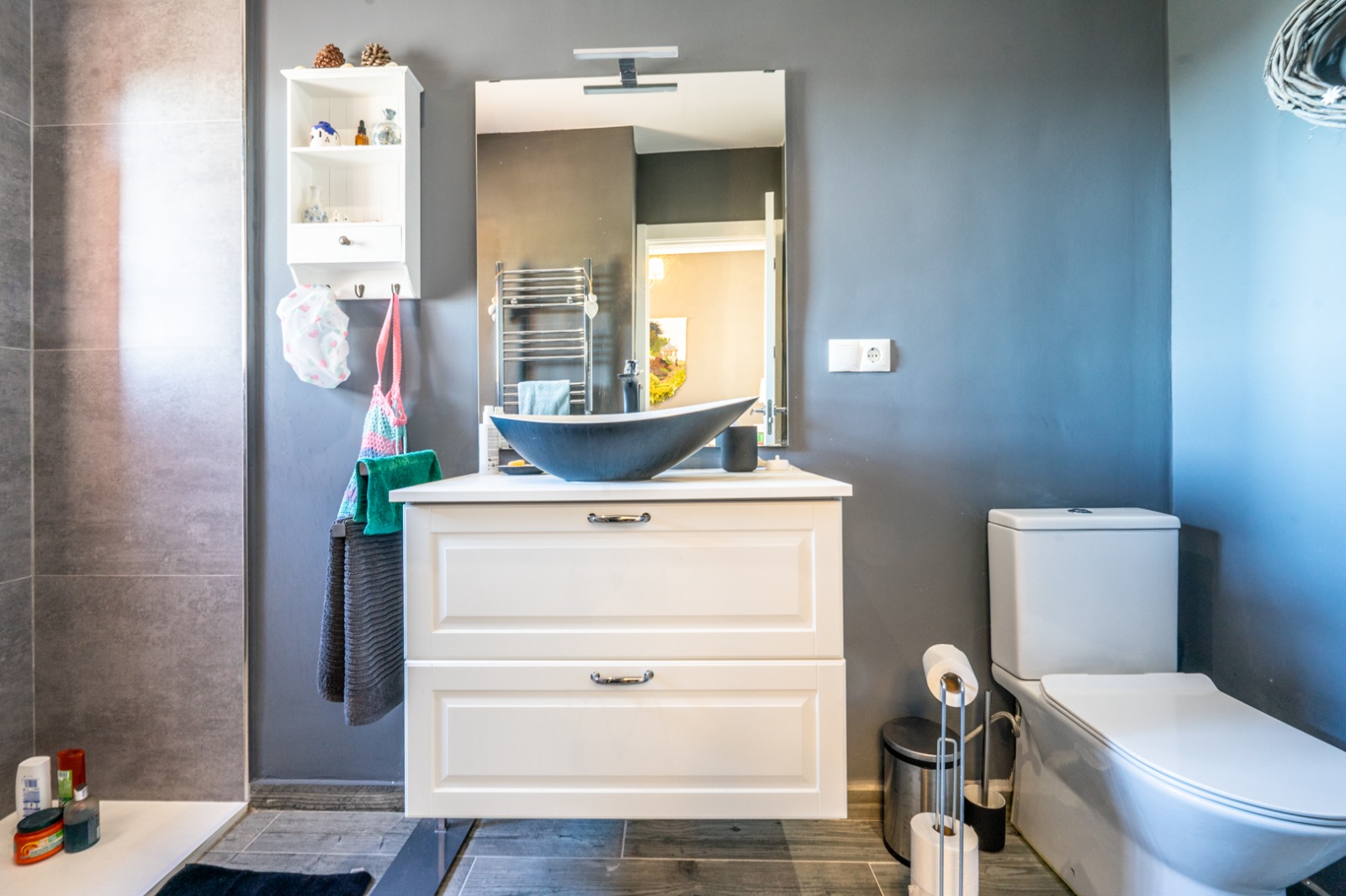 - Bathrooms: Two bathrooms, including a master en suite with a modern, stand-in shower and sleek design, and a second bathroom conveniently located in the hallway near the second bedroom.
