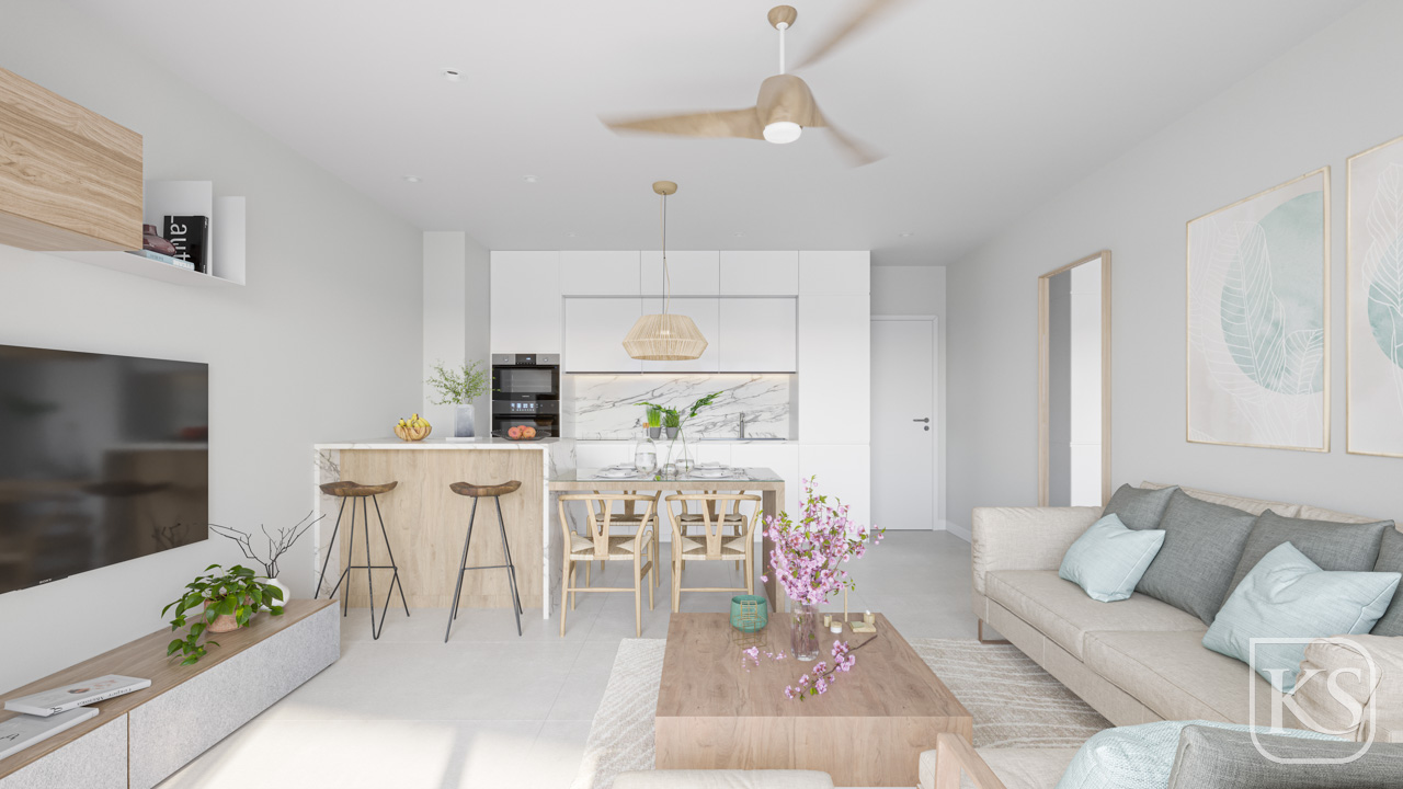 This stunning residential complex is composed of three-level blocks, each unit thoughtfully crafted to maximize natural light and spacious living areas. Designed for comfort and elegance, every apartment embraces an open-plan style, seamlessly connecting the living room, dining area, and kitchen with large windows that open to private terraces. These terraces provide the perfect space to enjoy the Mediterranean breeze and soak in the surrounding beauty.