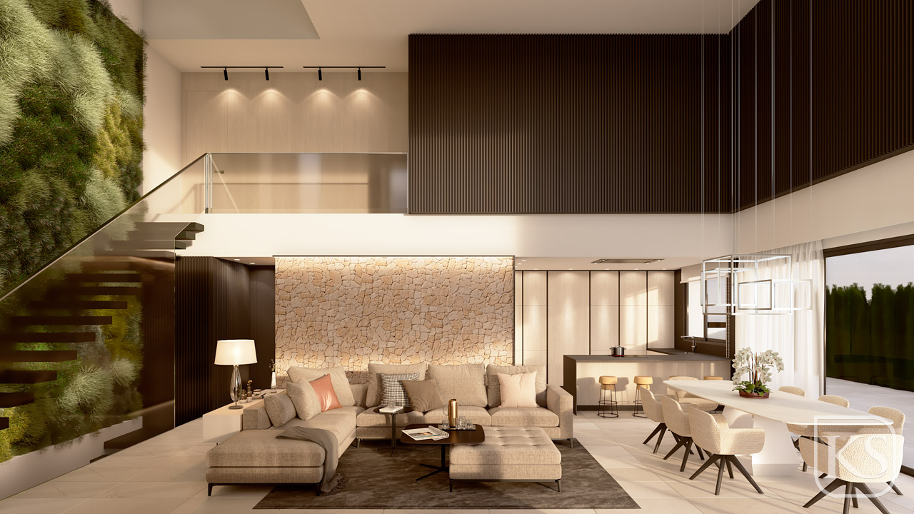 Step into a spacious open-plan layout seamlessly integrating the living room, dining area, and a state-of-the-art kitchen with premium appliances. Expansive sliding windows flood the interiors with natural light and provide access to landscaped outdoor areas. Oriented south-southeast, the villa enjoys all-day sunshine and picturesque views of the surroundings.