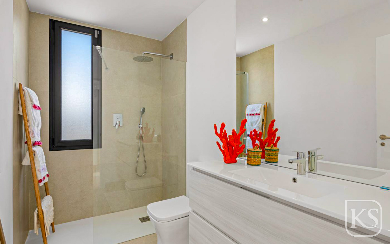 To the left of the property, three well-appointed bedrooms and two bathrooms await, creating an oasis of comfort and luxury. The master suite, spanning approximately 20 square meters, features a walk-in wardrobe and an en-suite bathroom, offering a private sanctuary with direct access to the pool area and stunning views.