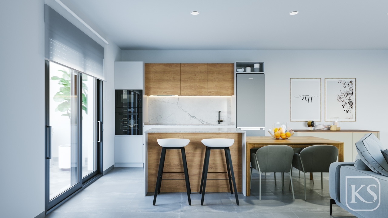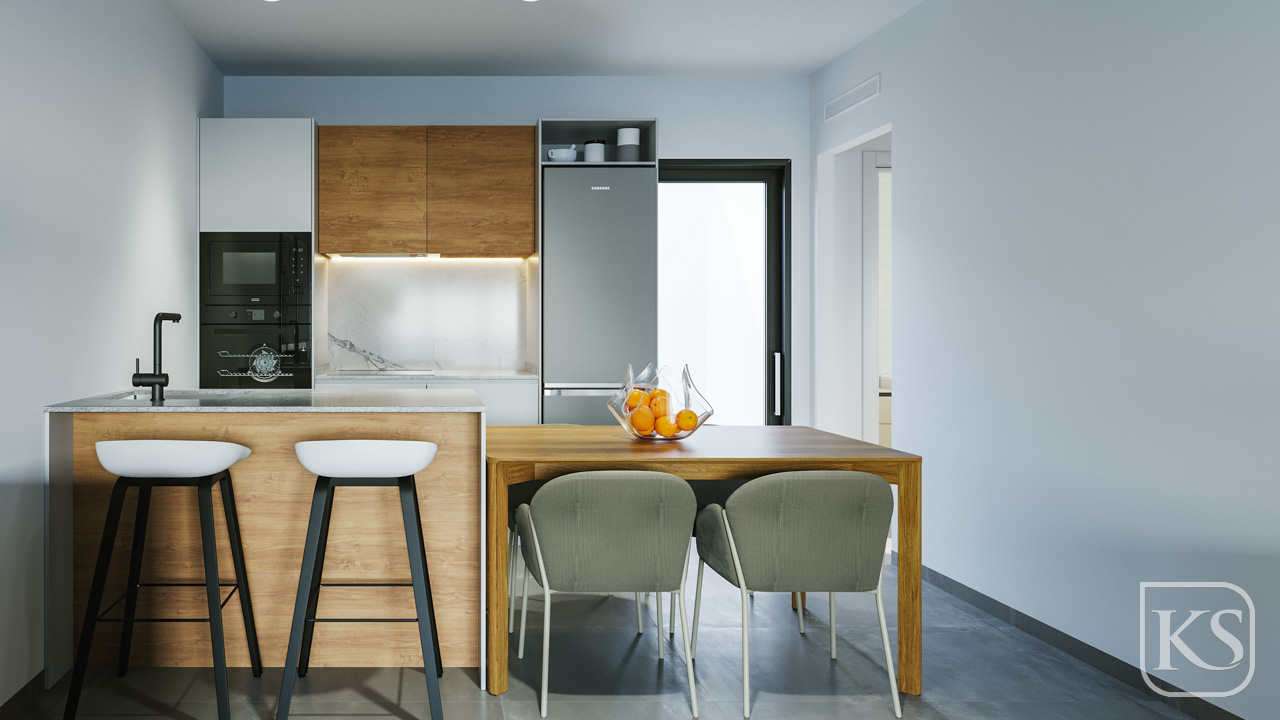 The kitchen is a culinary enthusiast's dream, equipped with high-end appliances including a fridge, hob, integrated dishwasher, oven, and microwave. Ample storage space is provided by sleek white kitchen units, complete with a choice of composite worktop in various colors and LED strips under wall units for added ambiance.