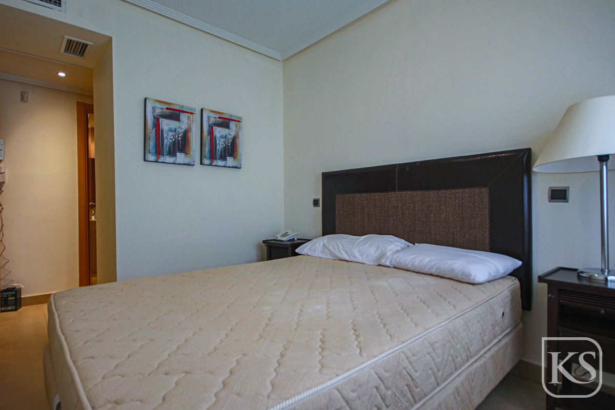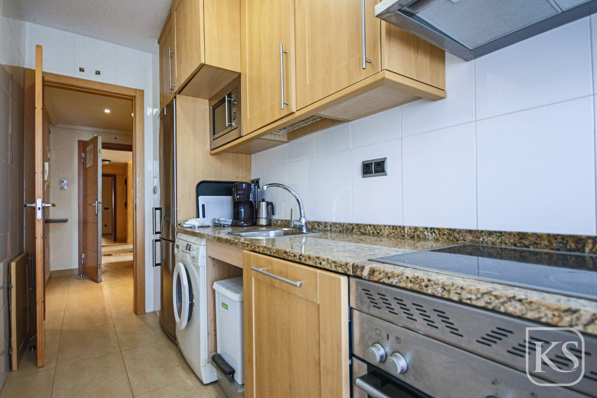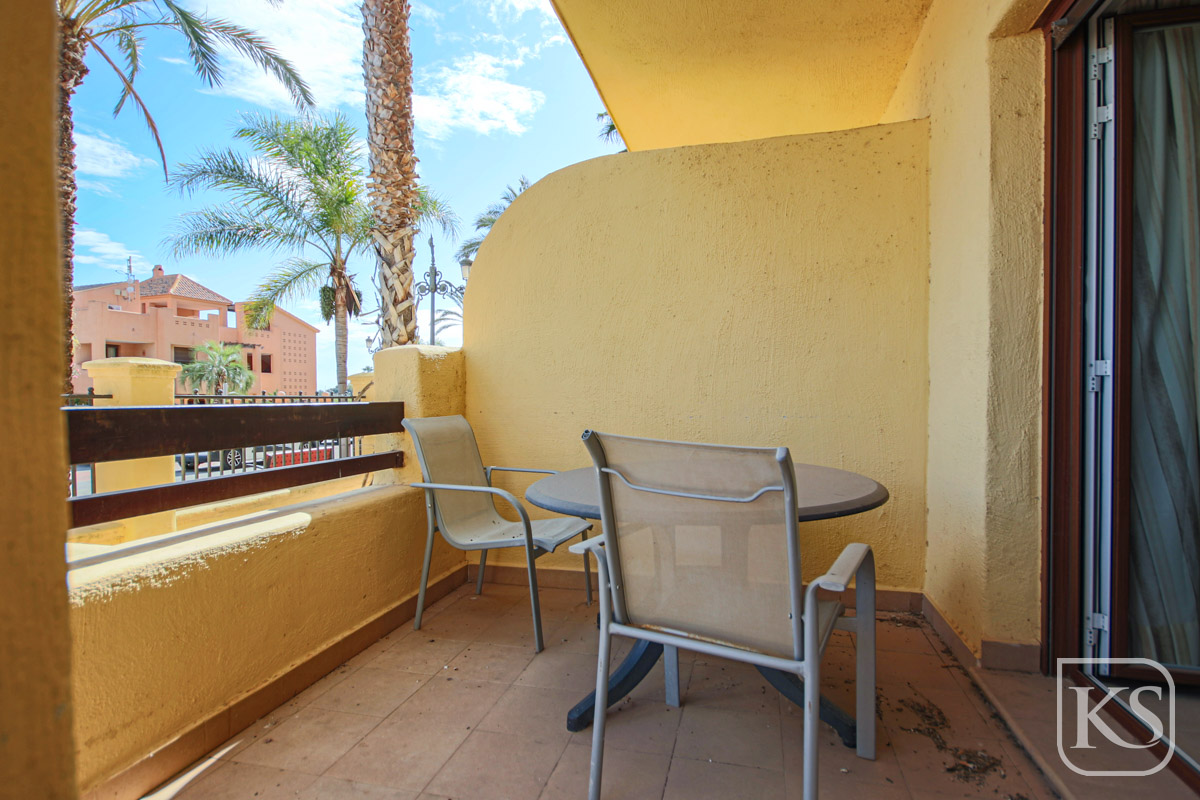 The apartment features an open-plan living and dining area that opens onto a private balcony, where you can enjoy views of either the communal garden areas or the golf course. The kitchen comes complete with white goods, and there’s a convenient closet by the entrance for extra storage.