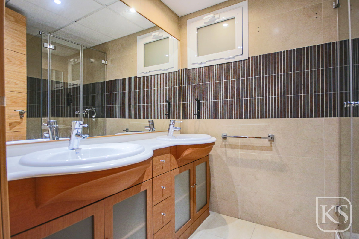 There are two good-sized bedrooms — one with built-in wardrobes and the other with wardrobe space between the bedroom and its ensuite bathroom. The property offers two bathrooms in total, one of which includes his-and-hers sinks.