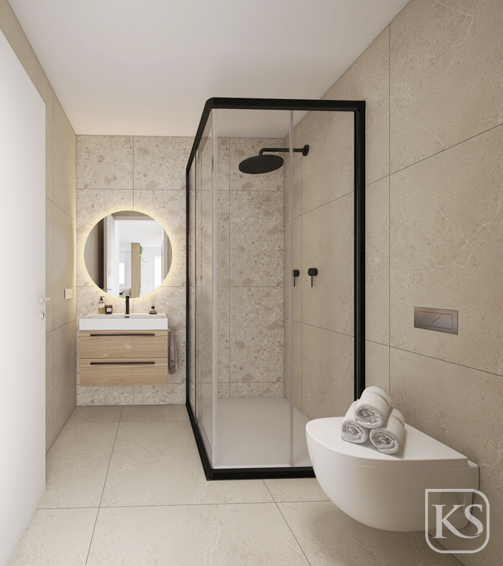 Bathrooms are fully tiled with white vitrified porcelain fittings, vanity units, sleek glass shower screens, downlighting, and an aerothermal water heater. Black mixer taps and a recirculating air extractor complete the premium finish.