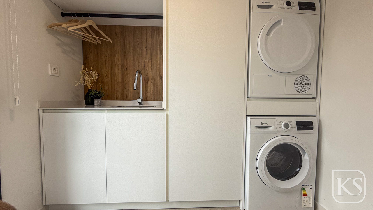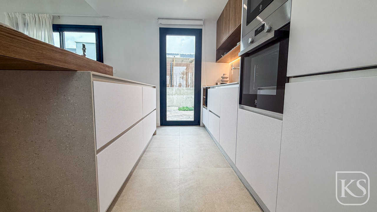 The open-plan living and dining area is bathed in natural light, enhancing the spacious feel of the home. The modern kitchen is fully equipped with high-end appliances, including an oven, hob, extractor, fridge, dishwasher, microwave, and a washing machine for added convenience. LED lighting throughout the kitchen-living room, bedrooms, and bathrooms creates a warm and inviting ambiance.