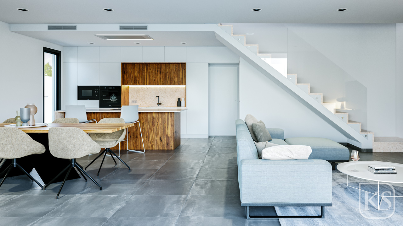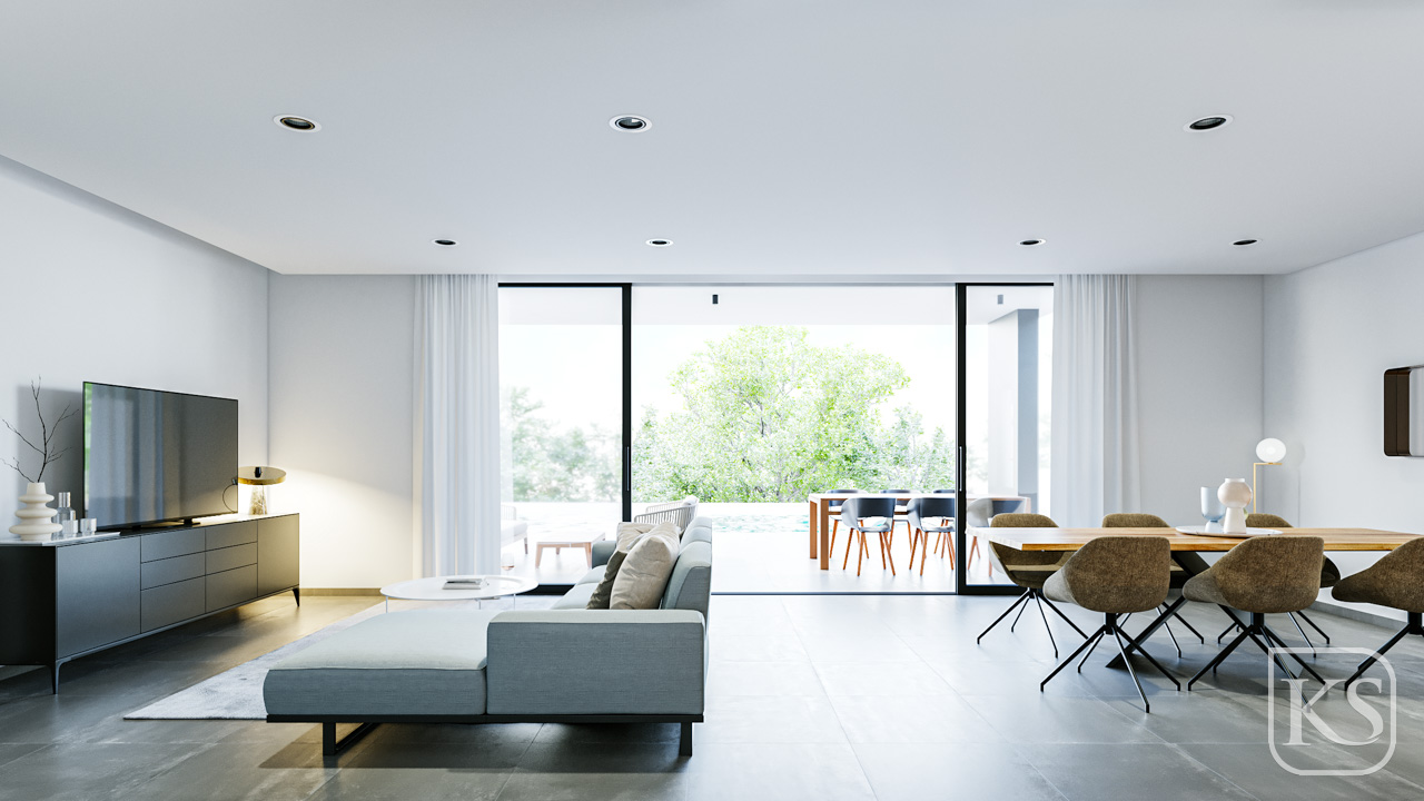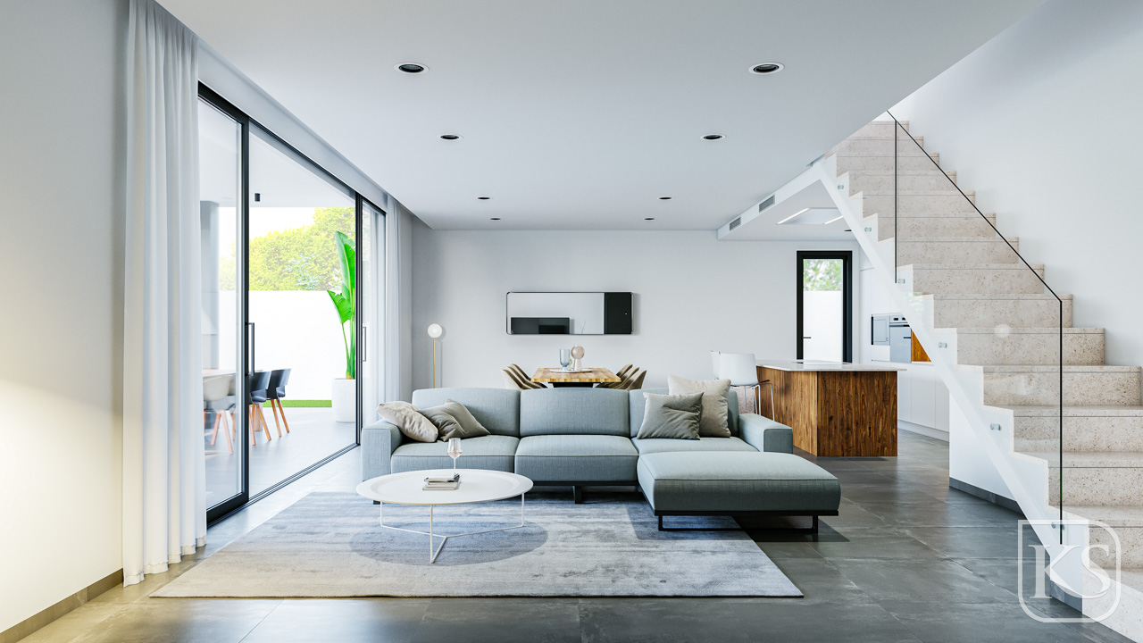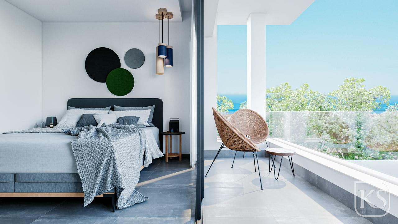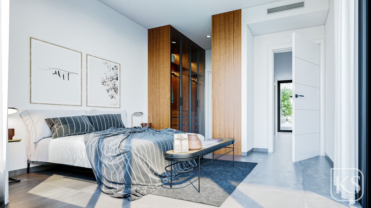The villa includes 4 spacious bedrooms and 3 modern bathrooms. Each bathroom is equipped with high-quality built-in sanitary ware by Roca or a similar brand, chrome steel mixing taps, and thermostatic showers with a Rain System. The bathrooms also feature large format tiling, smooth plastic paint in white, and built-in shower trays in embedded resin with glass shower panels available in either clear or matt finishes.