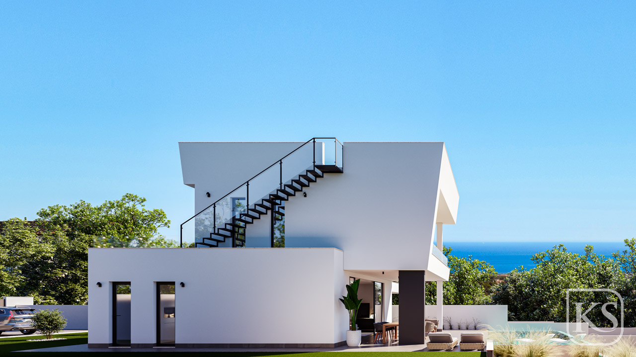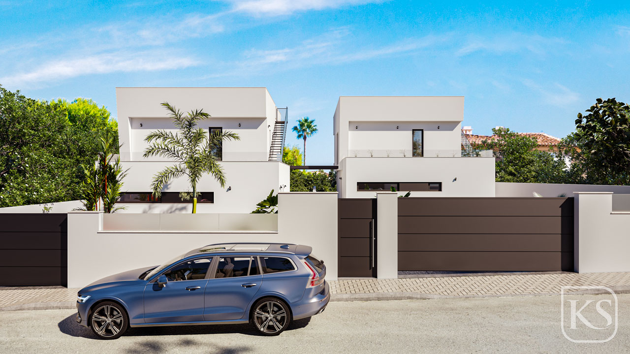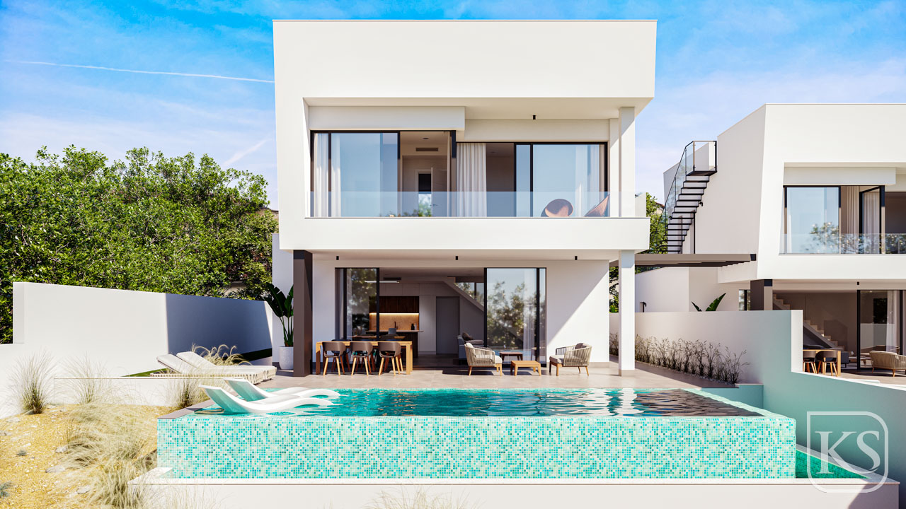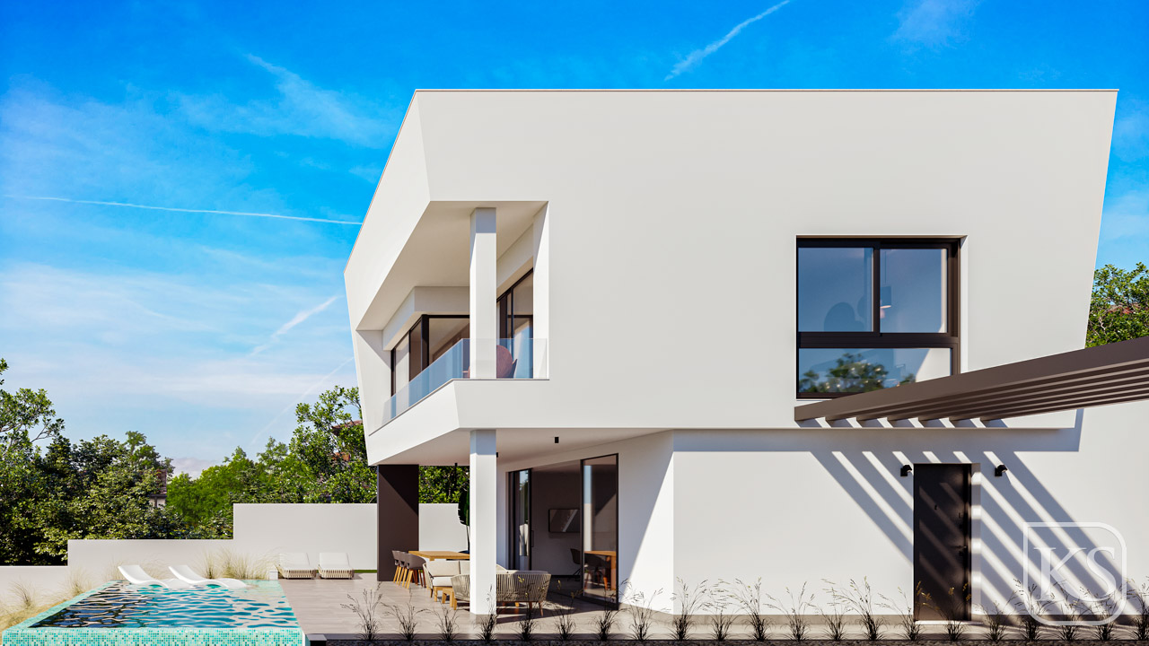 Villa Abeto is a stunning, modern detached villa situated in the picturesque area of Pinar de Campoverde, Pilar de la Horadada, Alicante. This property boasts a large plot of 700 m², offering ample garden space both at the front and back, with the convenience of being able to walk around the sides. The villa features a private pool, off-road parking, and a clean, contemporary design.