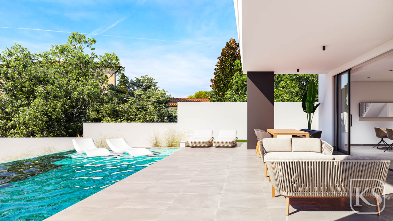 The exterior of the villa includes a beautiful overflowing pool, a lounging area, and a solar shower on the terrace in front of the living room. The garden is designed with artificial grass, trees, and an irrigation system, complemented by a natural area with pine trees.