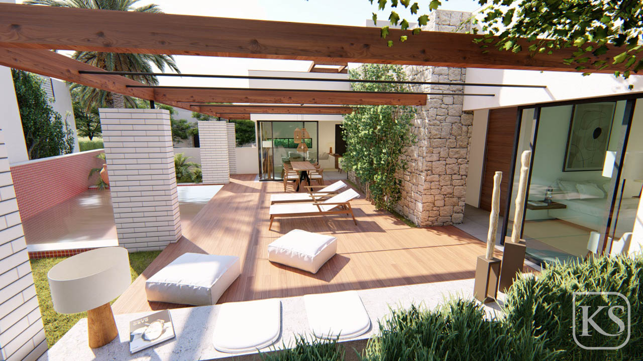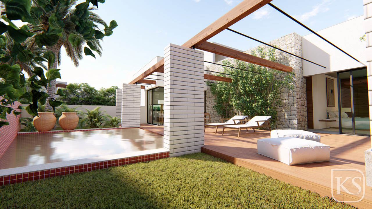 Each villa boasts a private landscaped garden complete with artificial grass and decorative plants, as well as a private swimming pool (size depends on plot), perfect for relaxing or entertaining. Access the rooftop solarium via an exterior staircase — pre-installed for a summer kitchen — offering stunning views and extra leisure space.