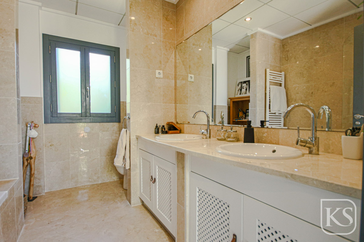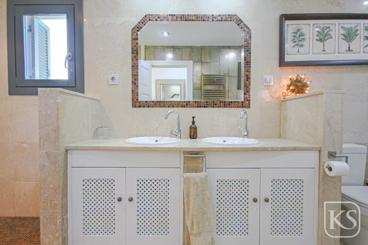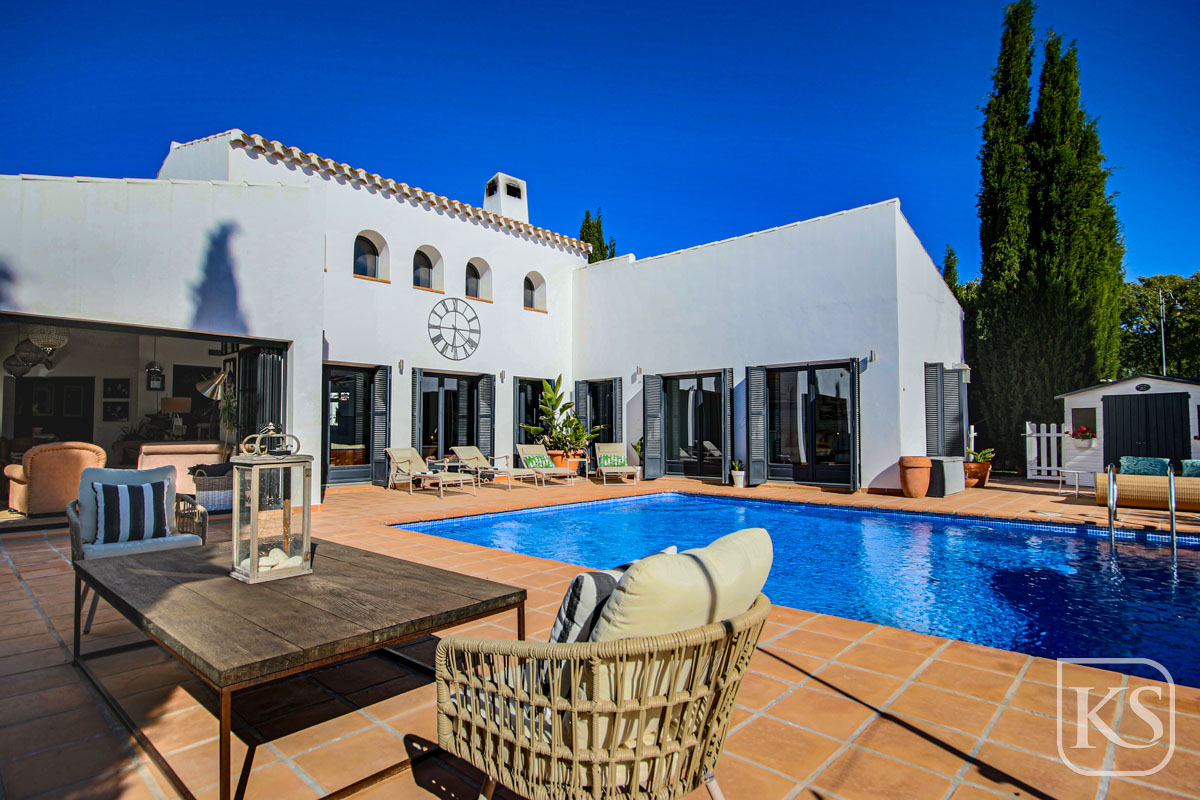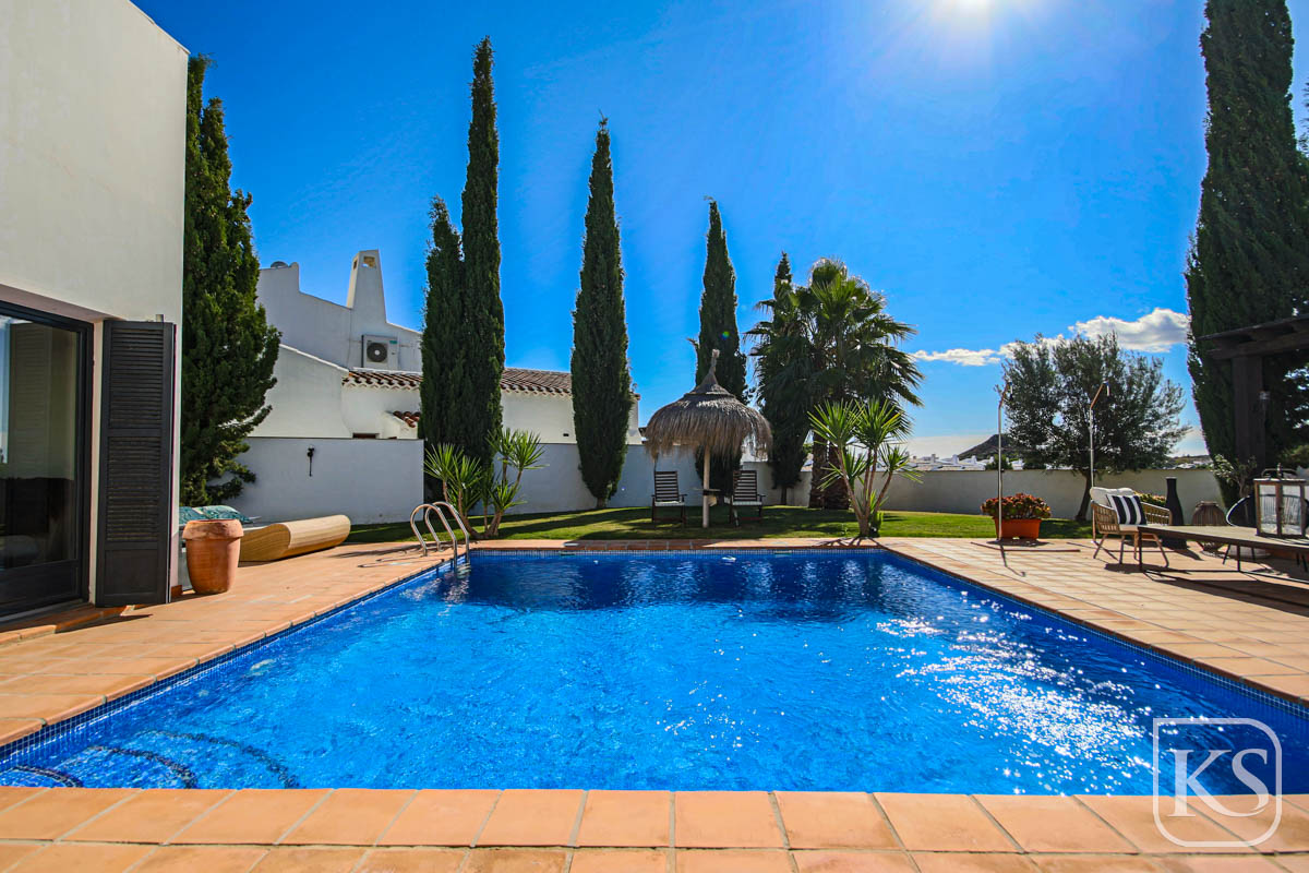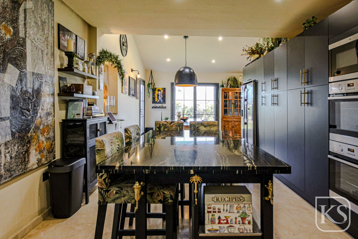 The newly renovated kitchen offers a modern, open-plan layout, perfect for both family life and entertaining guests. The bright and airy living area flows seamlessly to the expansive terrace and private swimming pool, ideal for al fresco dining and sun-soaked afternoons. For entertainment, the villa includes a dedicated cinema room, while a utility room adds practicality to the elegant design.