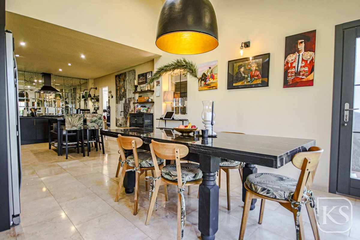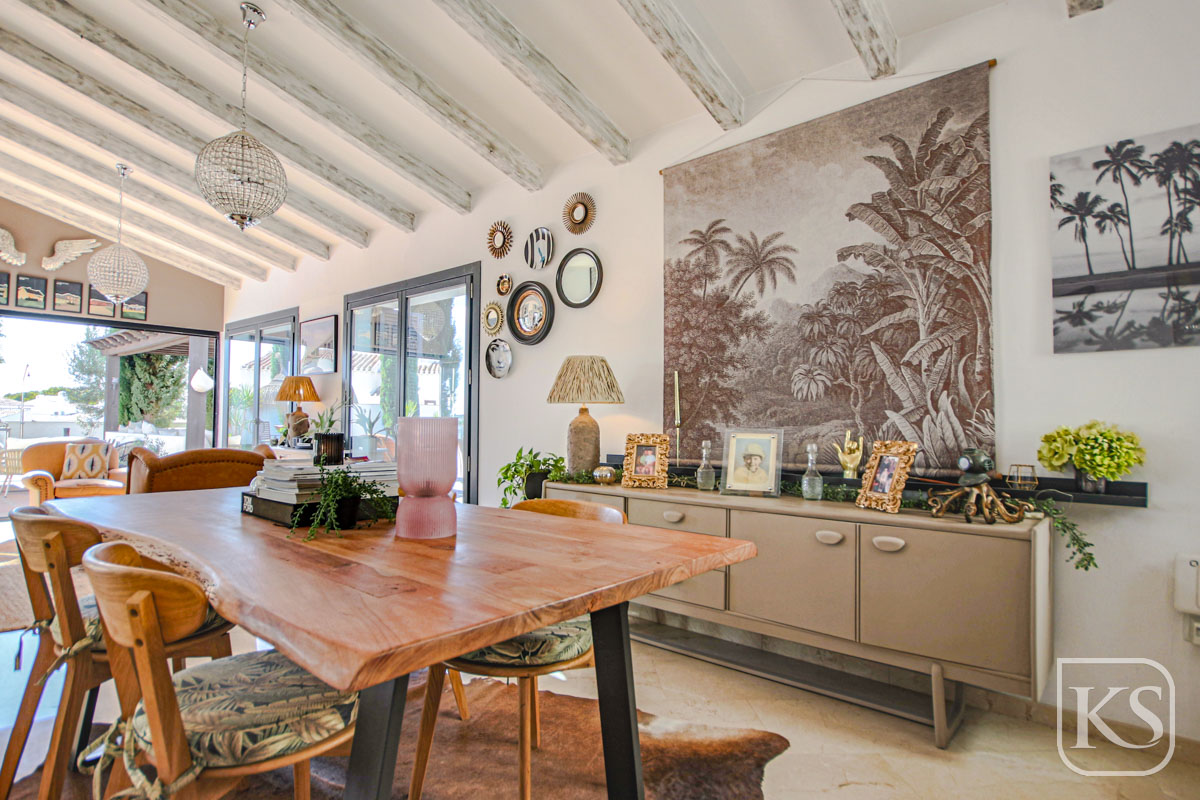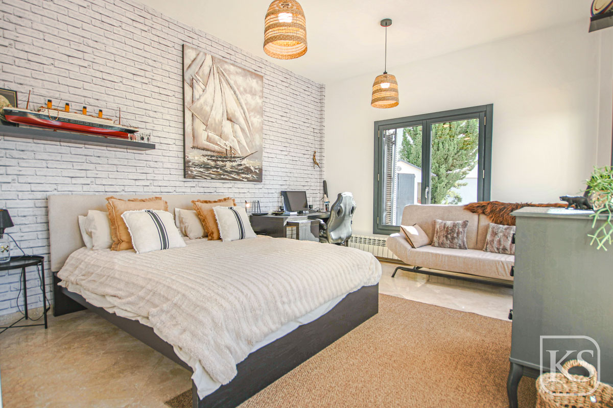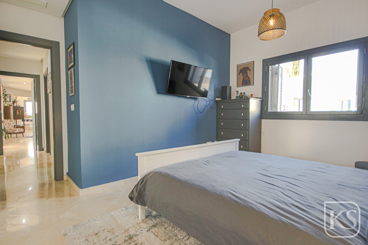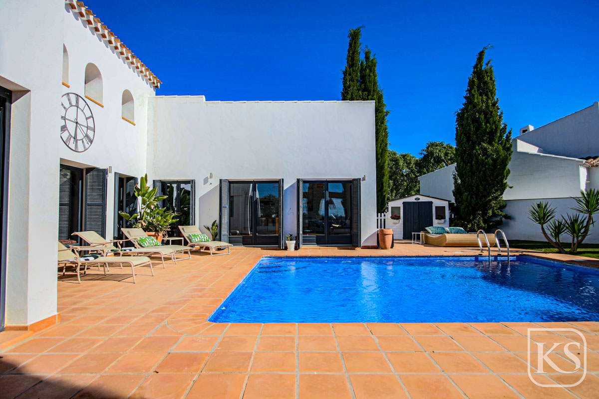 The newly renovated kitchen offers a modern, open-plan layout, perfect for both family life and entertaining guests. The bright and airy living area flows seamlessly to the expansive terrace and private swimming pool, ideal for al fresco dining and sun-soaked afternoons. For entertainment, the villa includes a dedicated cinema room, while a utility room adds practicality to the elegant design.