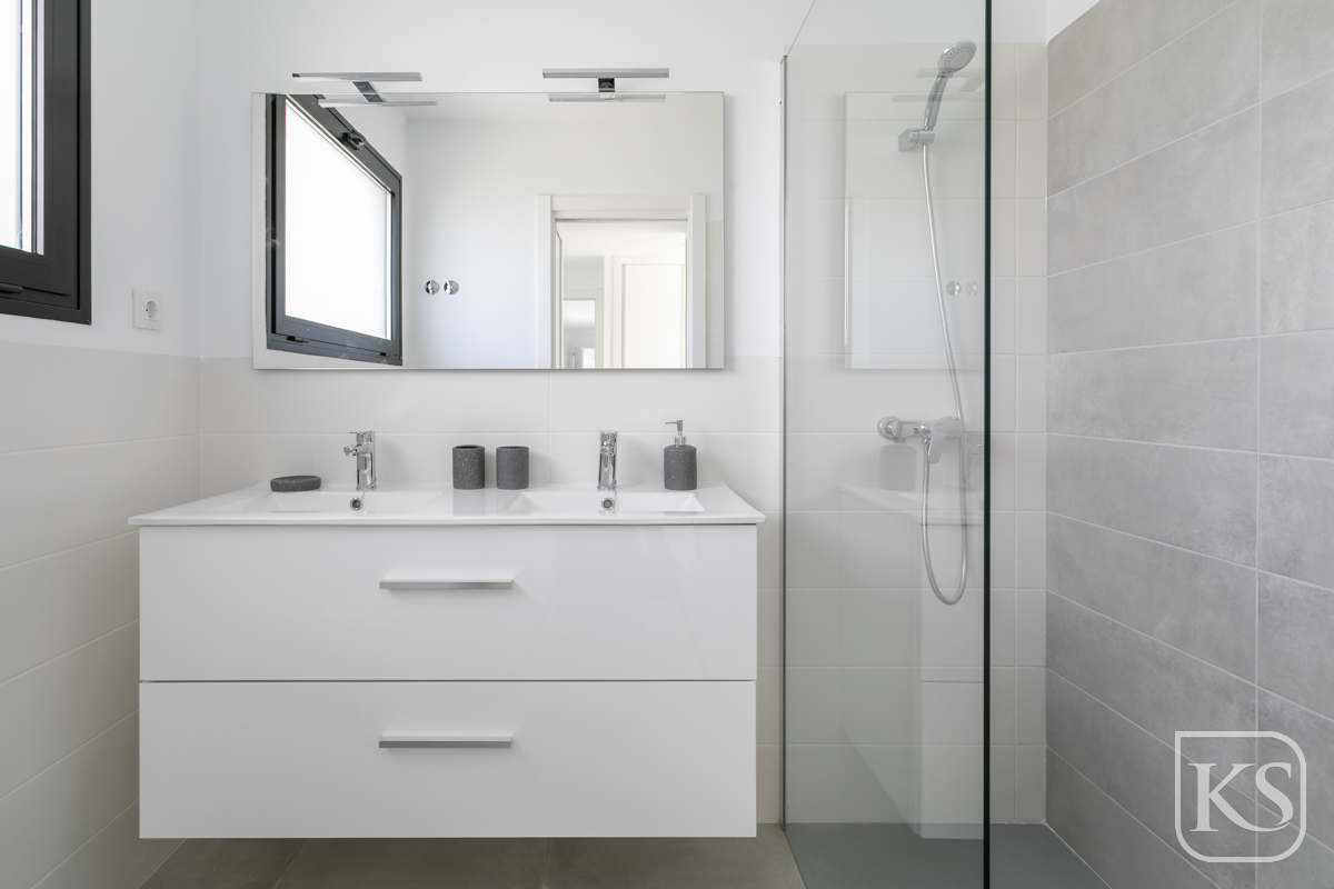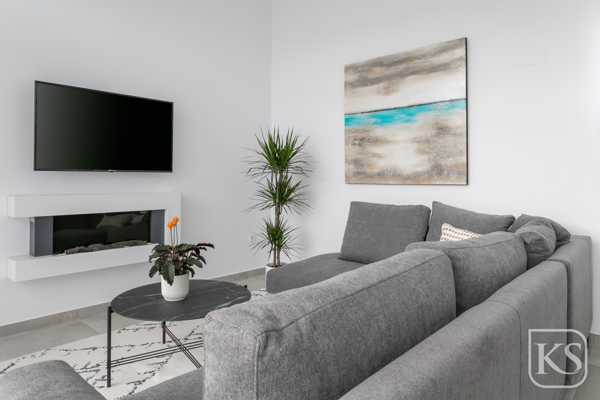 The fully equipped kitchen boasts stylish Silestone countertops and fronts, along with essential appliances including an oven, ceramic hob, extractor hood, and dishwasher. A separate laundry room equipped with a washing machine and aerothermal heater adds to the practicality.