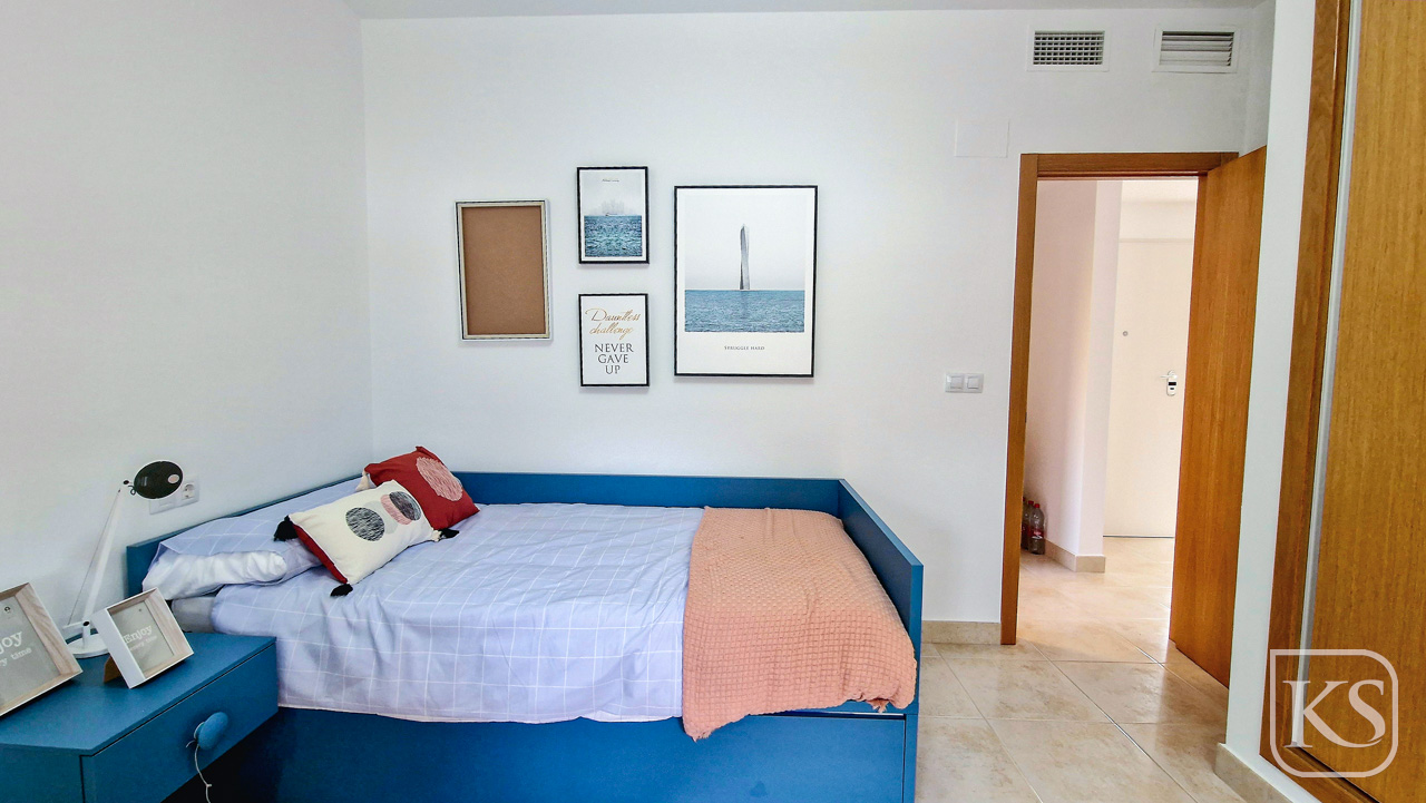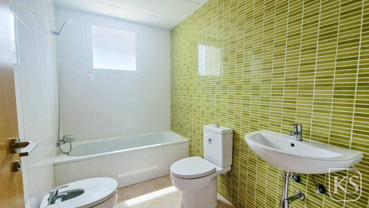 The master bedroom, located on the second floor, includes an ensuite bathroom, along with another bedroom and bathroom. The ground floor accommodates the third bedroom, which could also serve as an office space if desired. Built-in wardrobes in all bedrooms offer practical storage solutions.