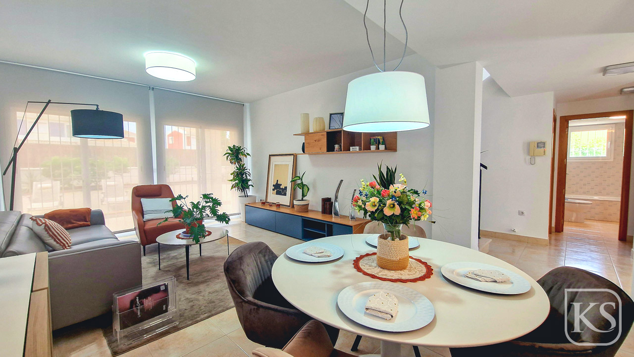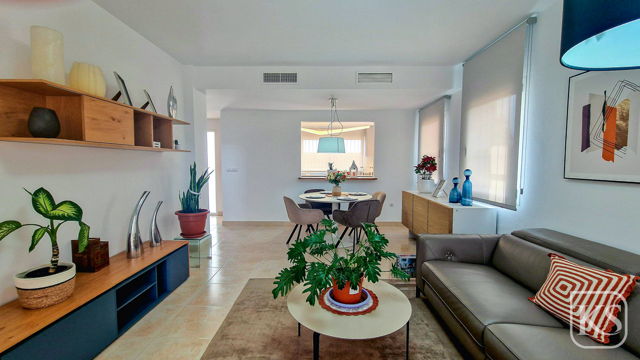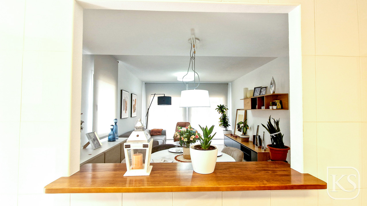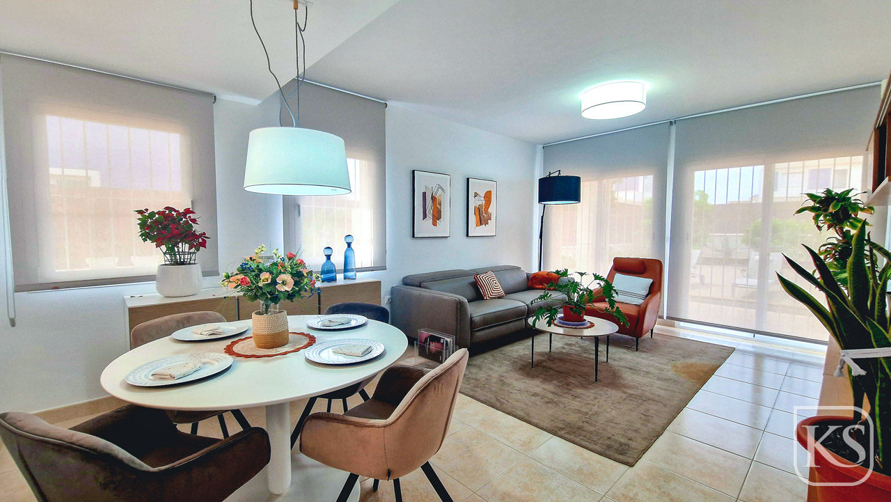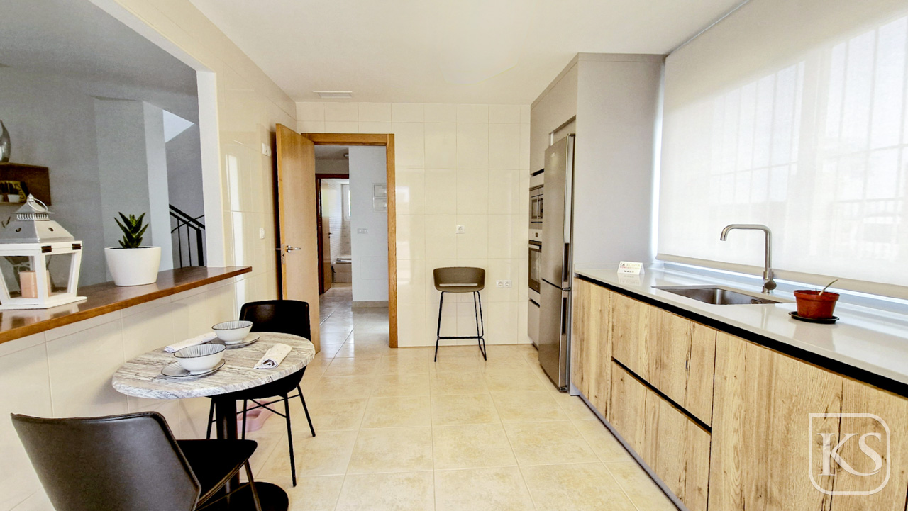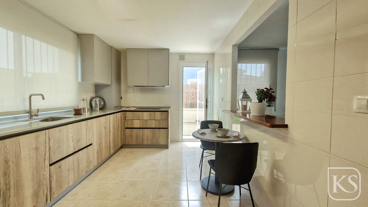 Upon arrival, you'll find convenient off-road parking and a covered terrace at the entrance, welcoming you into the open-plan living, kitchen, and dining area. The modern kitchen features a large serving hatch, seamlessly connecting it to the living and dining spaces.