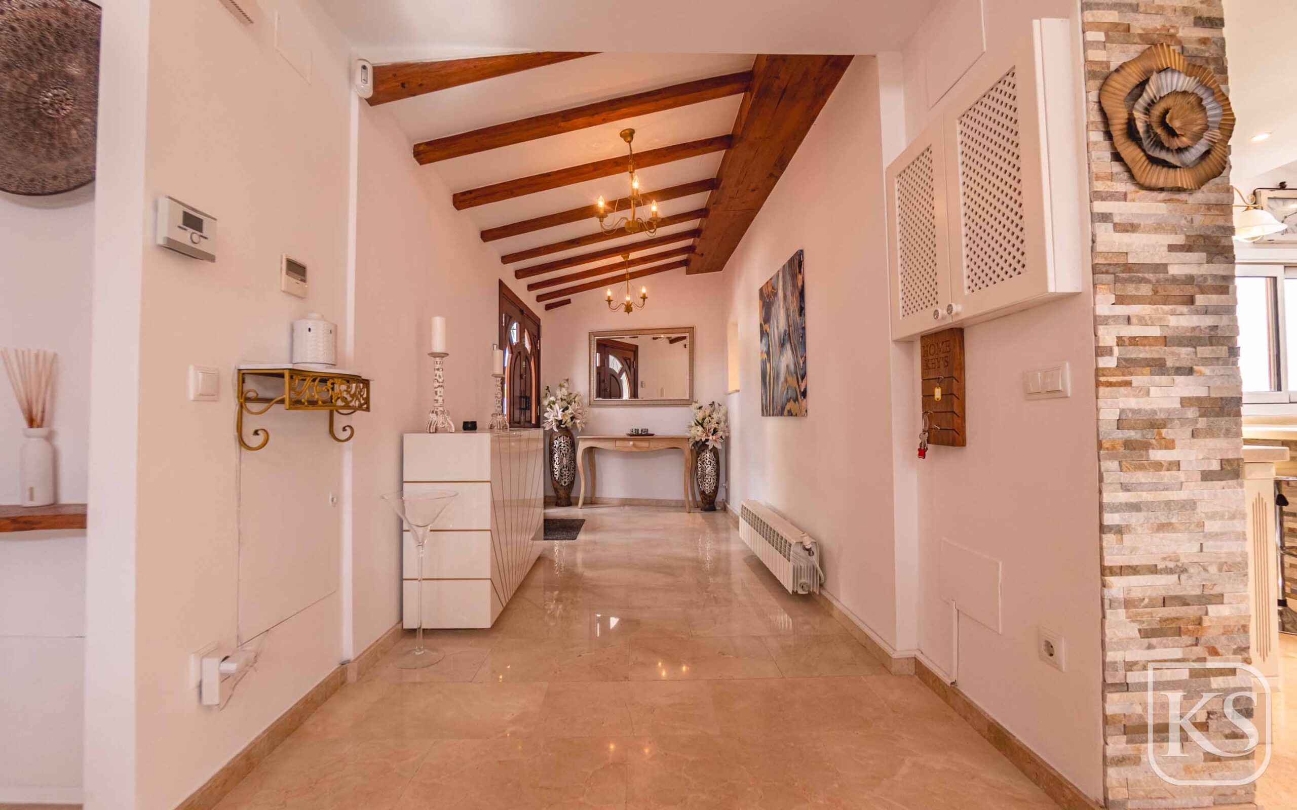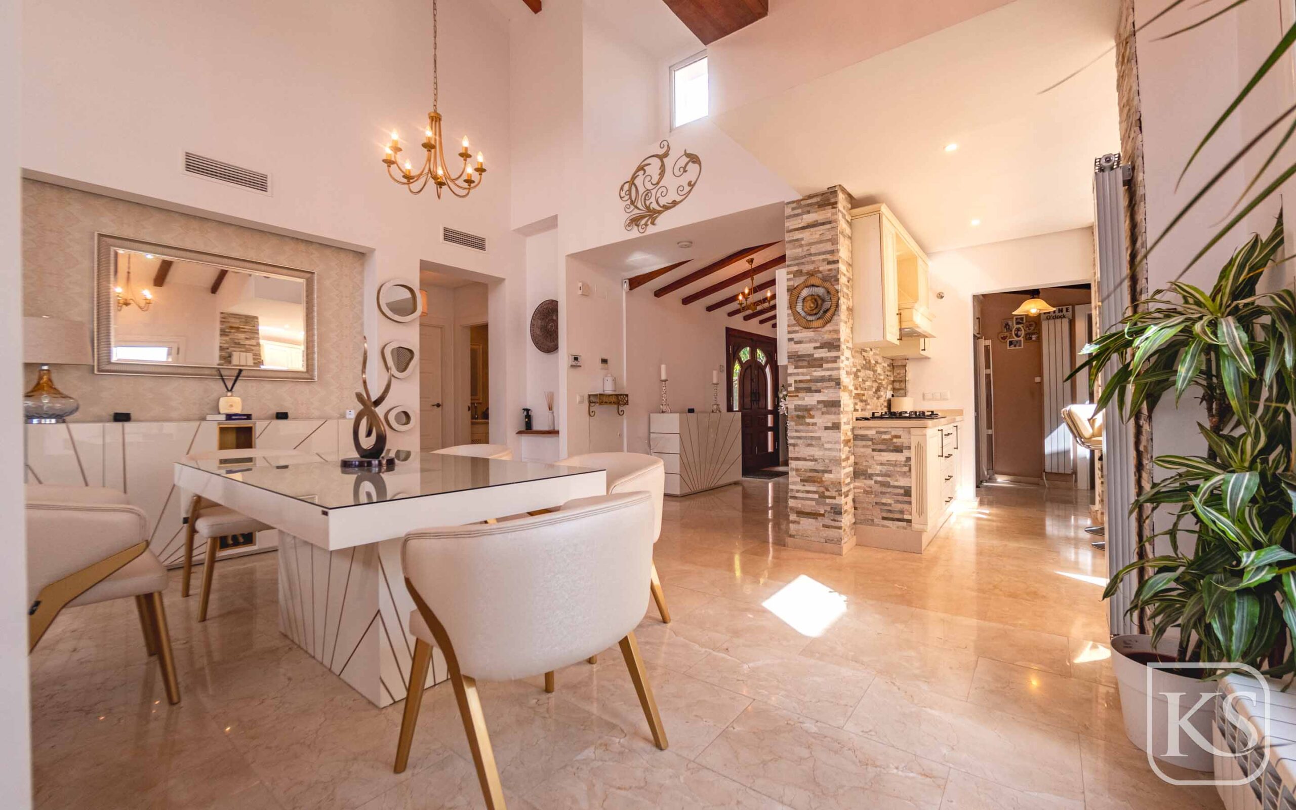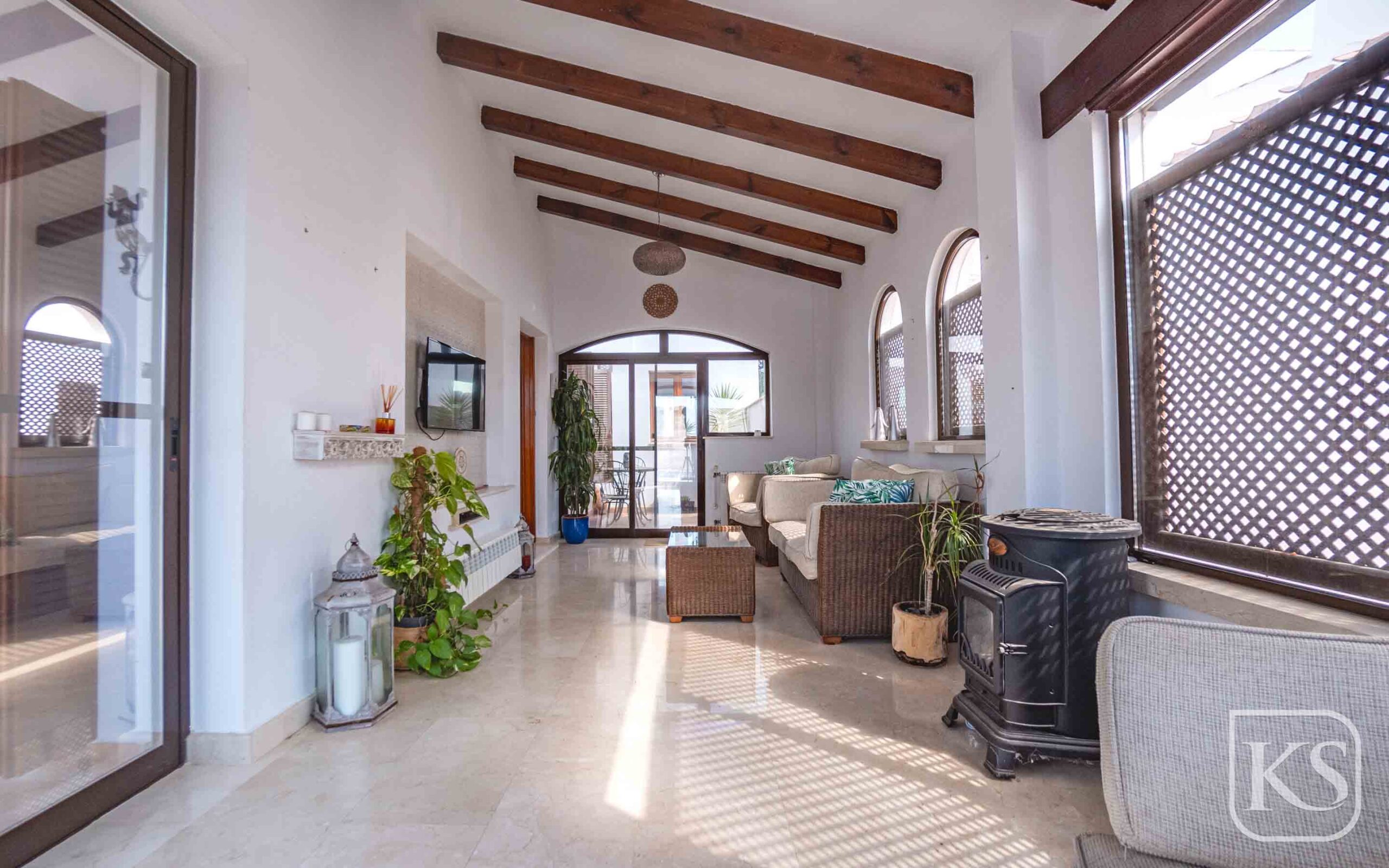 From the kitchen, there is a delightful patio, creating the perfect spot for your morning coffee rituals. To the left of the living room, an inviting enclosed terrace awaits, complete with sliding doors that open to the picturesque garden and a heated swimming pool, ensuring year-round enjoyment.