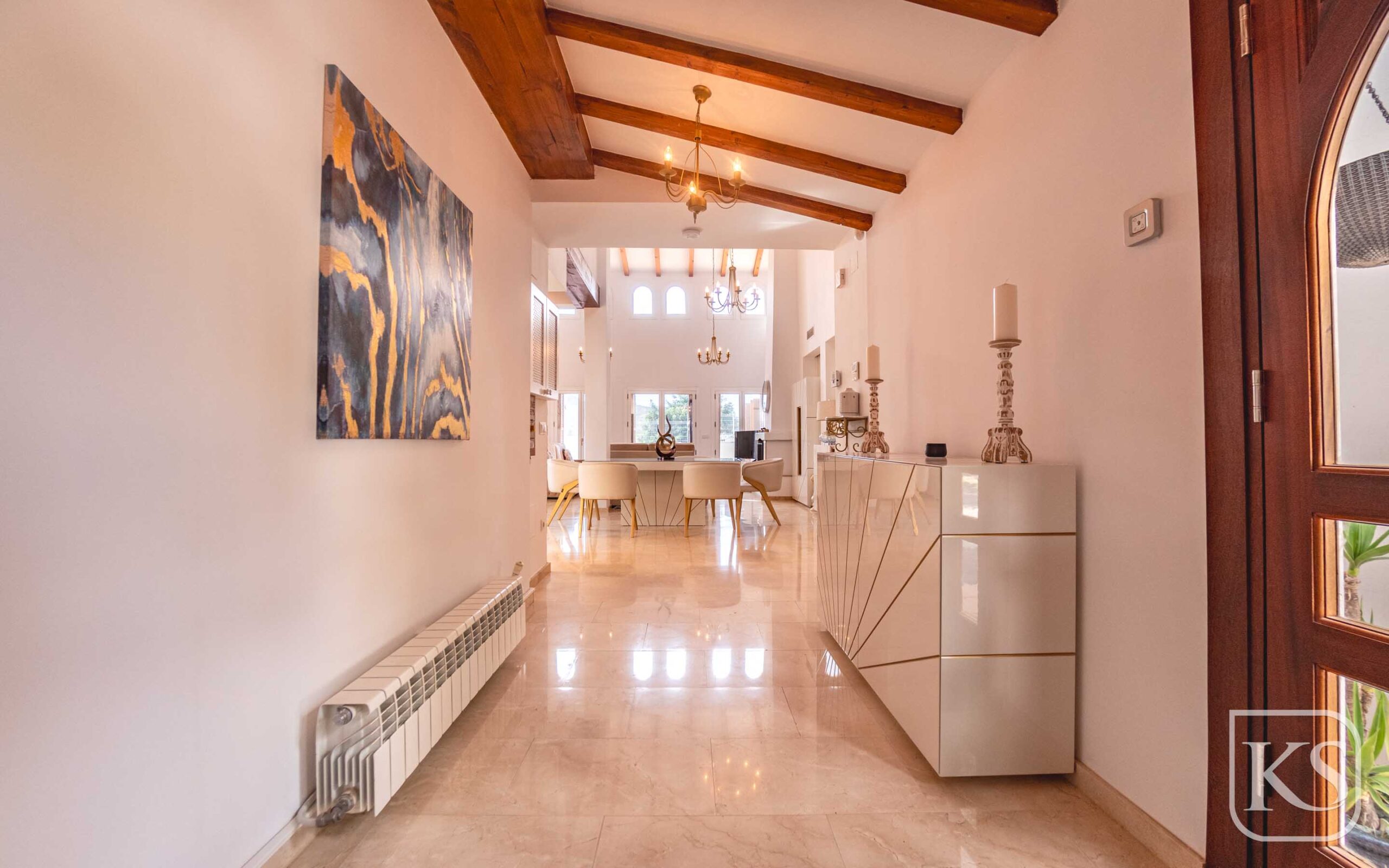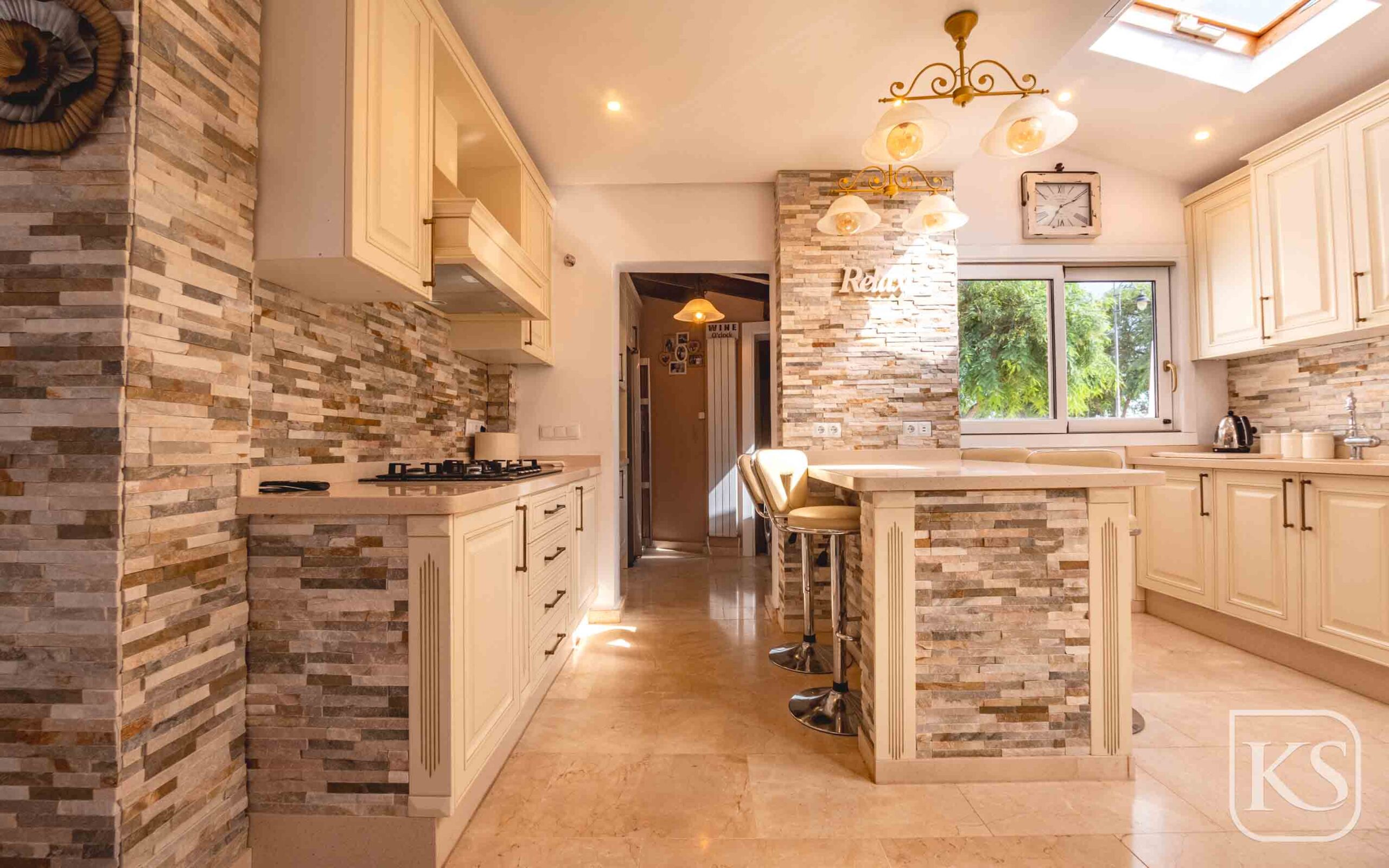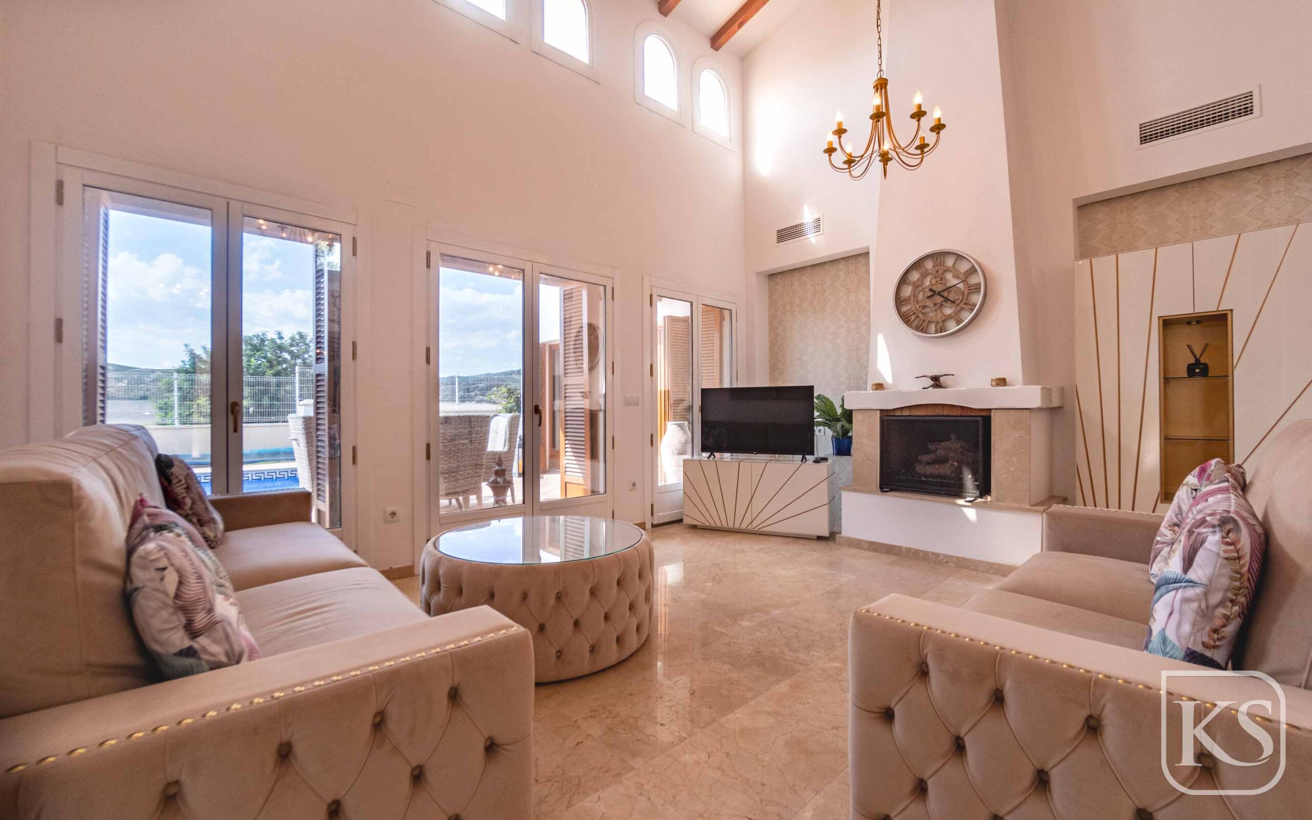 From the kitchen, there is a delightful patio, creating the perfect spot for your morning coffee rituals. To the left of the living room, an inviting enclosed terrace awaits, complete with sliding doors that open to the picturesque garden and a heated swimming pool, ensuring year-round enjoyment.