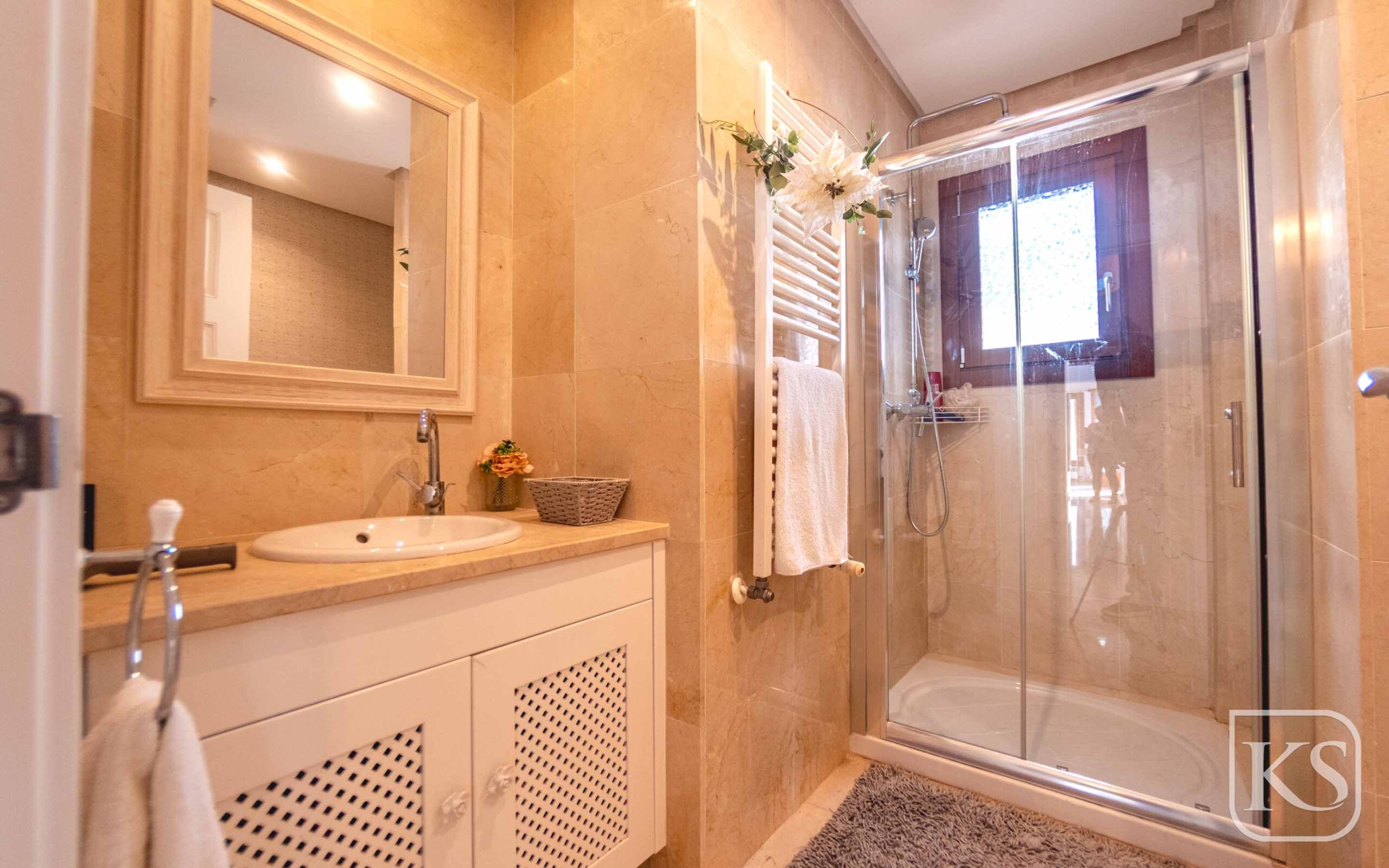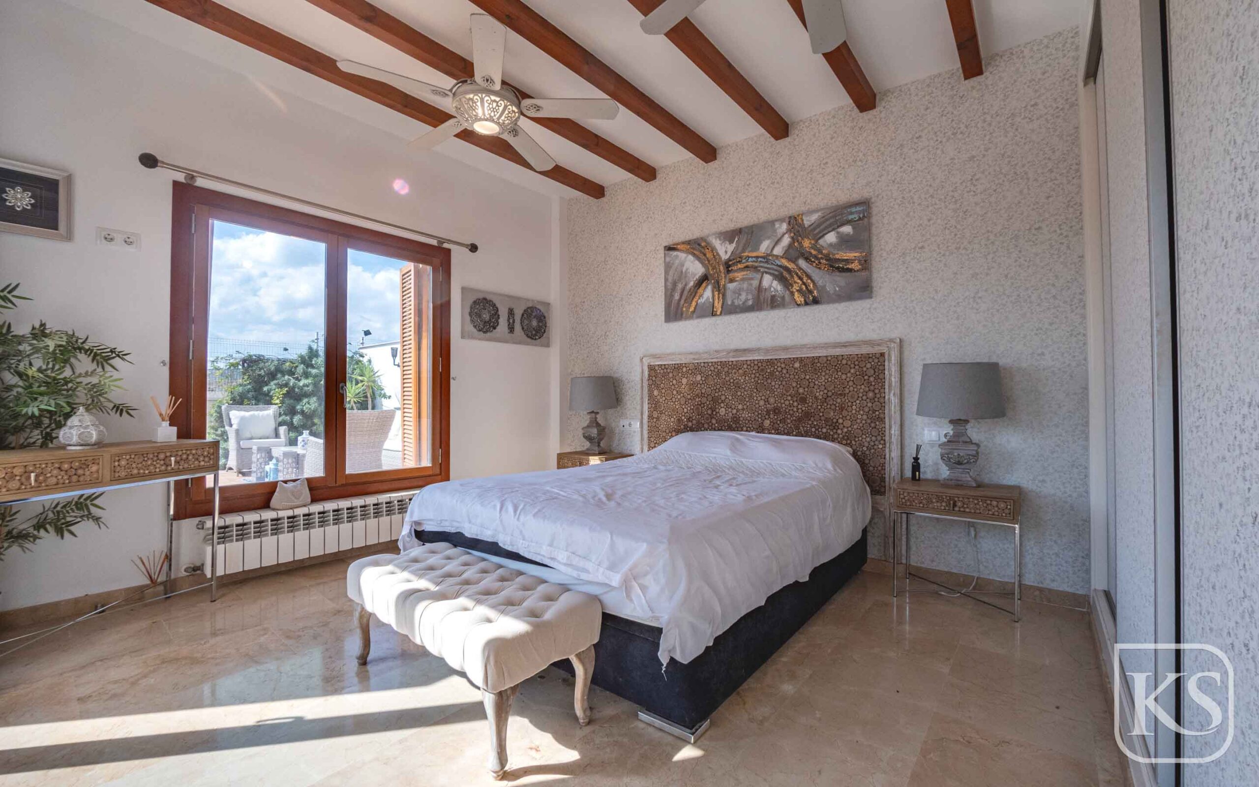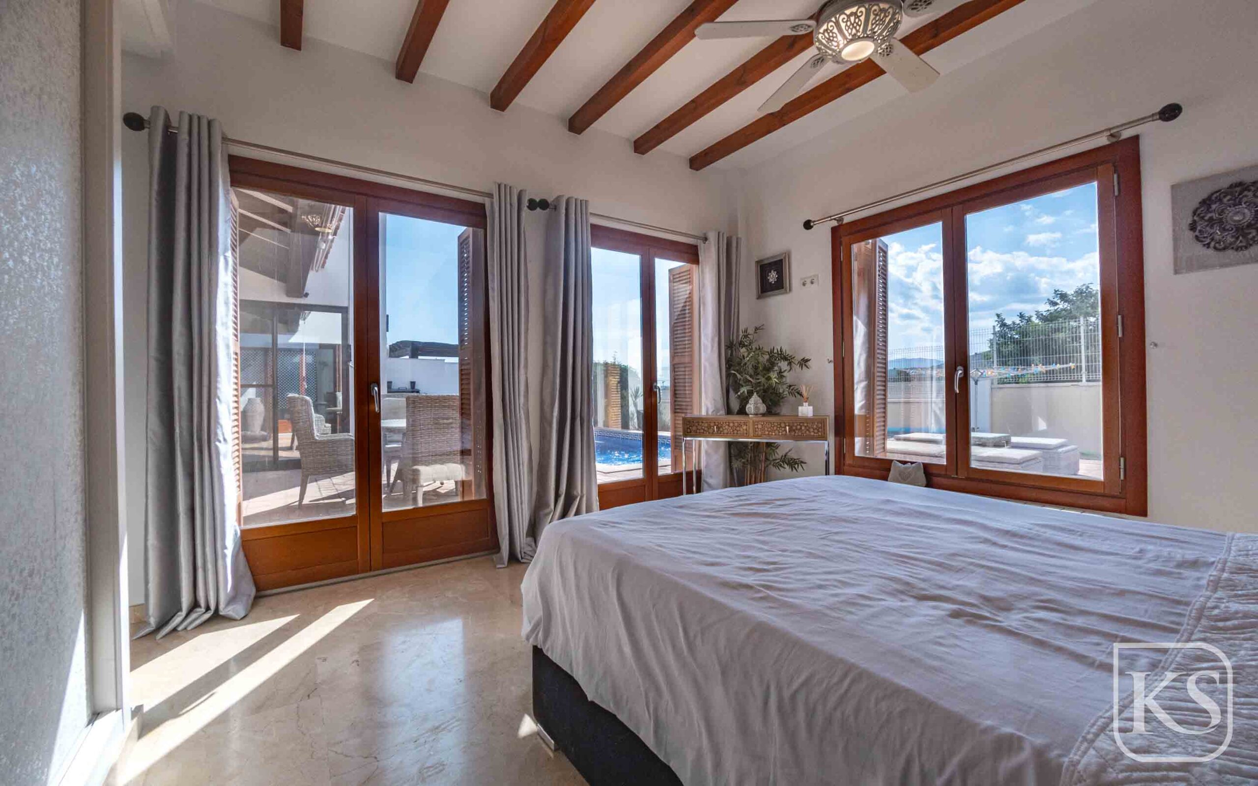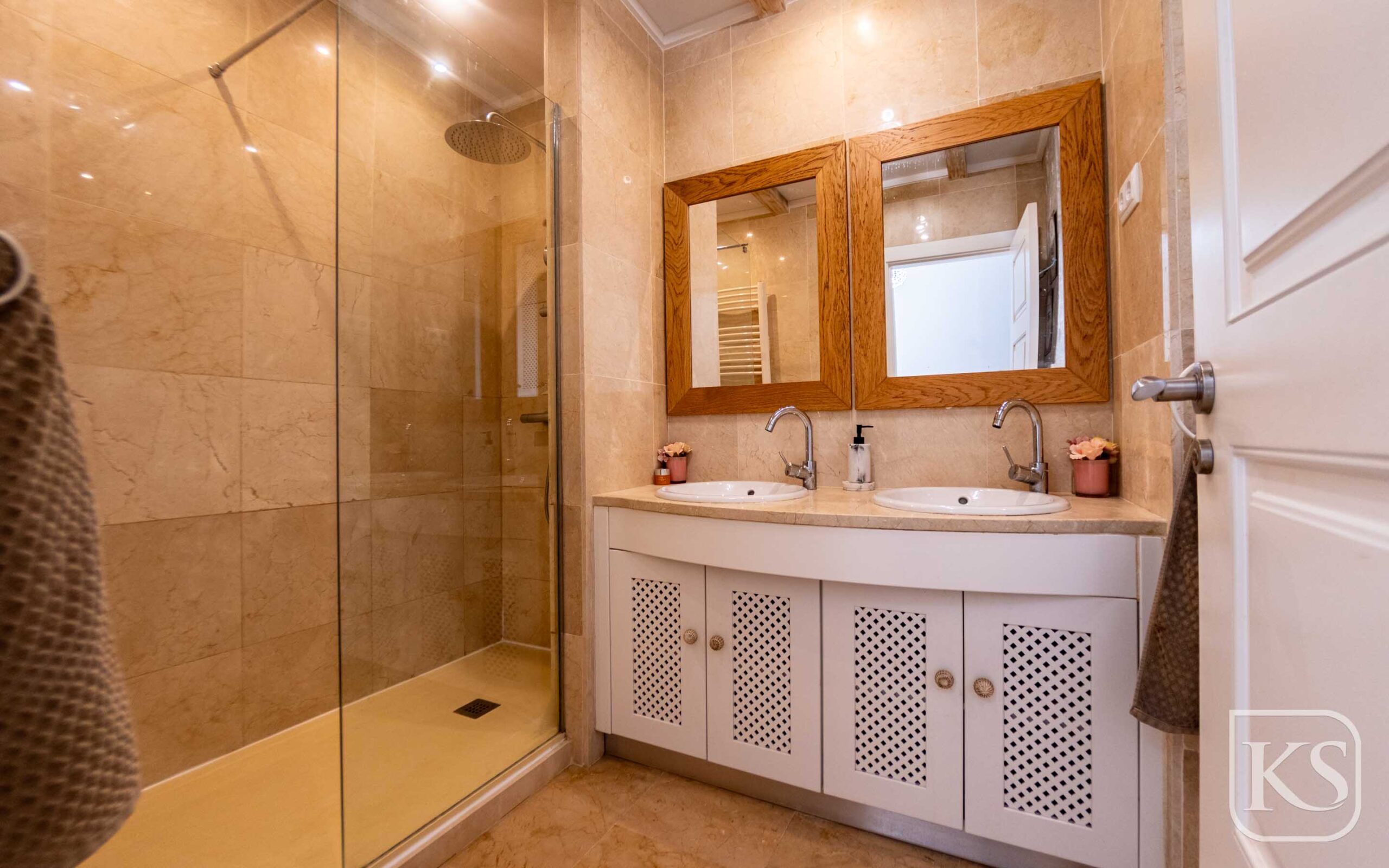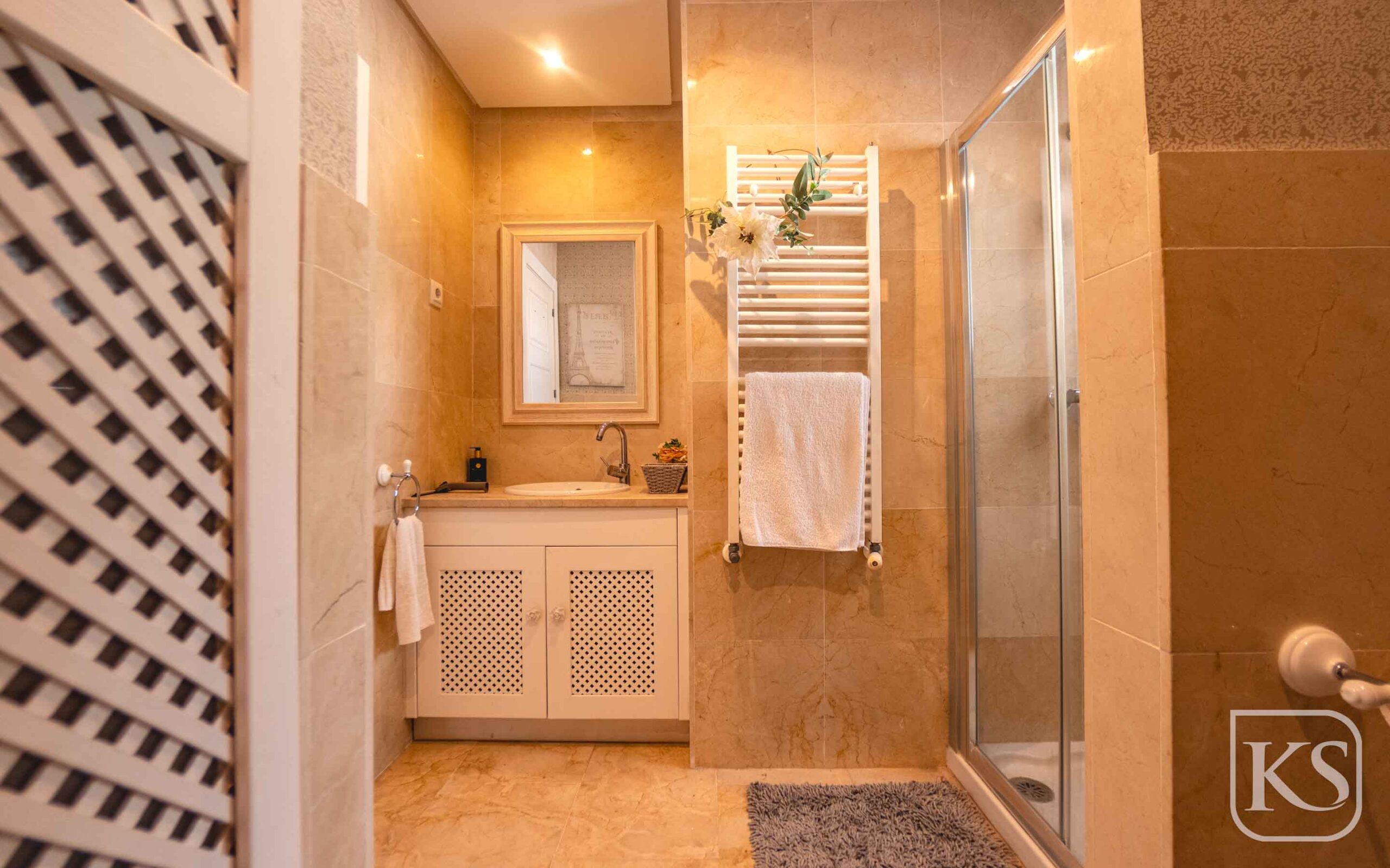 Returning inside, to the right of the hallway, you’ll discover three generously proportioned double bedrooms, each featuring fitted wardrobes. The master bedroom, in particular, enjoys views of the garden and pool, and a beautifully remodelled en-suite bathroom, complete with a shower and dual sinks.