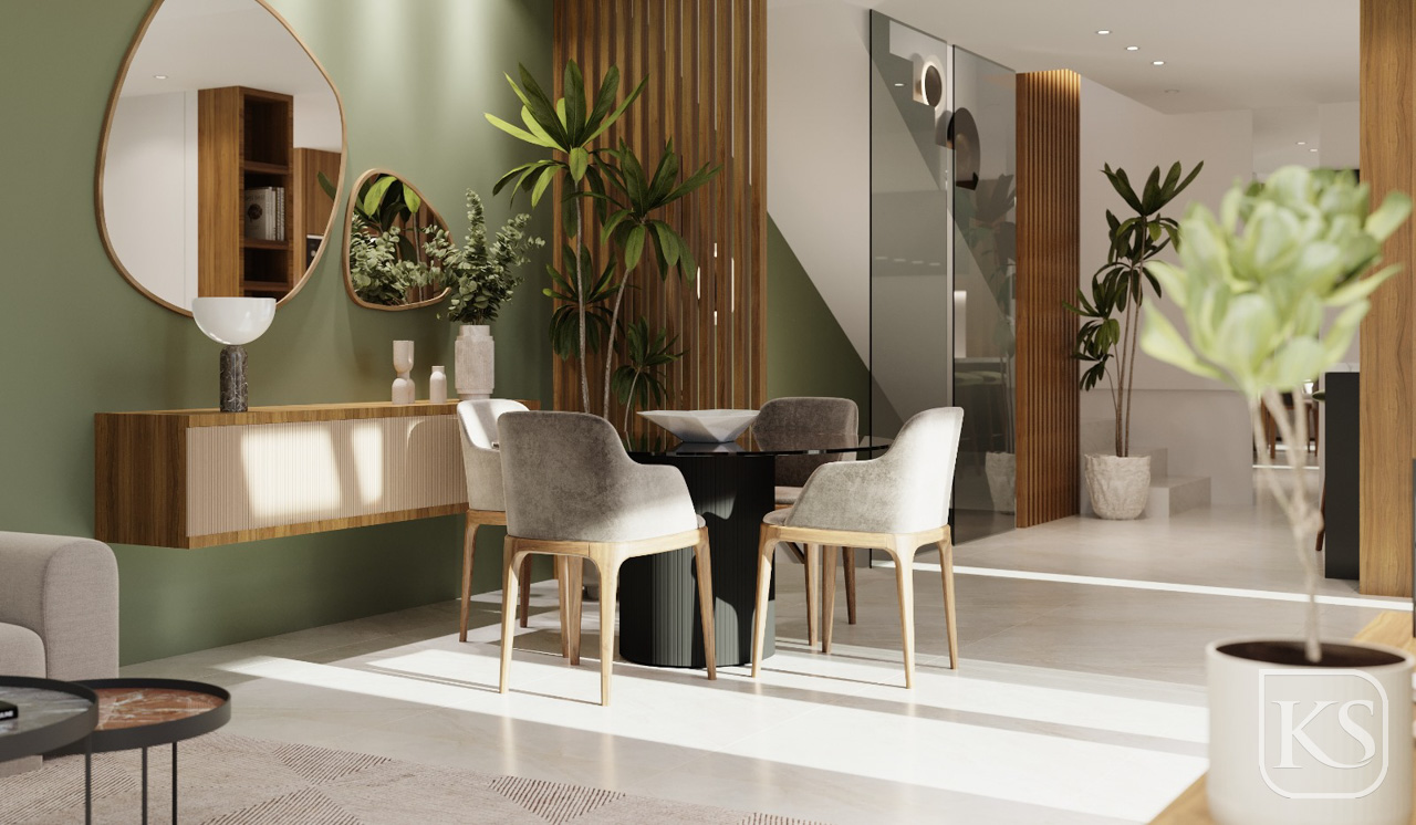 The ground floor features an open-plan kitchen, living, and dining room creating a spacious and airy environment, perfect for entertaining or relaxing with family. Large windows provide views of the ground floor terrace and the shimmering private pool. Additionally, a laundry room is conveniently located off the kitchen, and a covered terrace extends the living space outdoors. This floor also includes the first bedroom and a well-appointed bathroom.