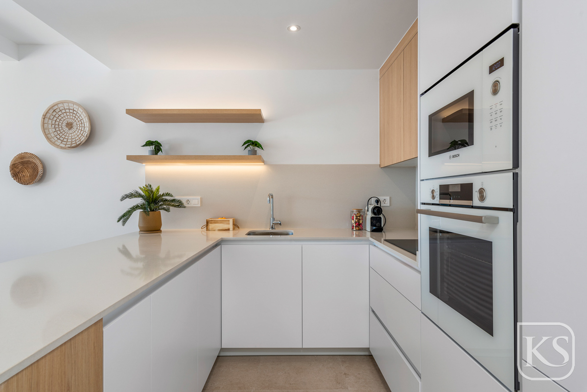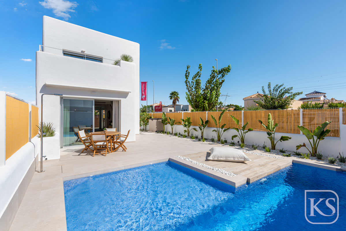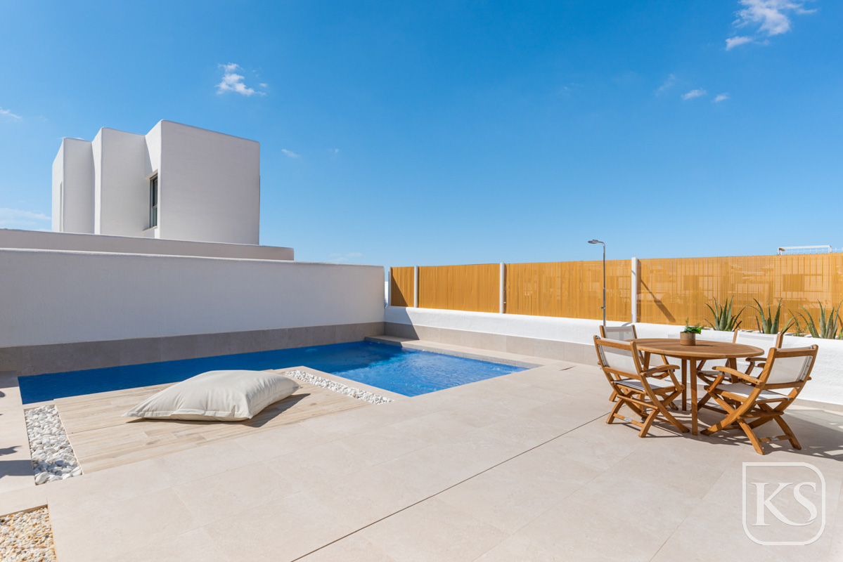 Featuring 3-bedroom residences, this enclave harmoniously blends Mediterranean design with quality and functionality. Each home comprises two bathrooms and a south-facing pool area and garden, seamlessly connected to the open-plan living space through large glass doors. There is also a very spacious basement area providing you with extra space for guests or family members.