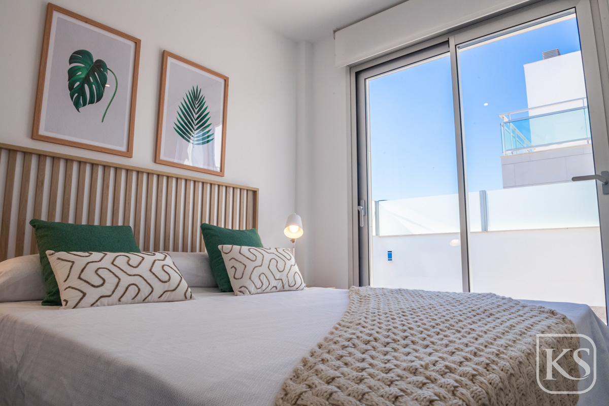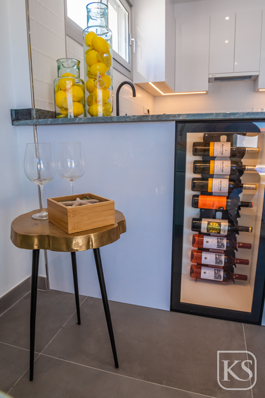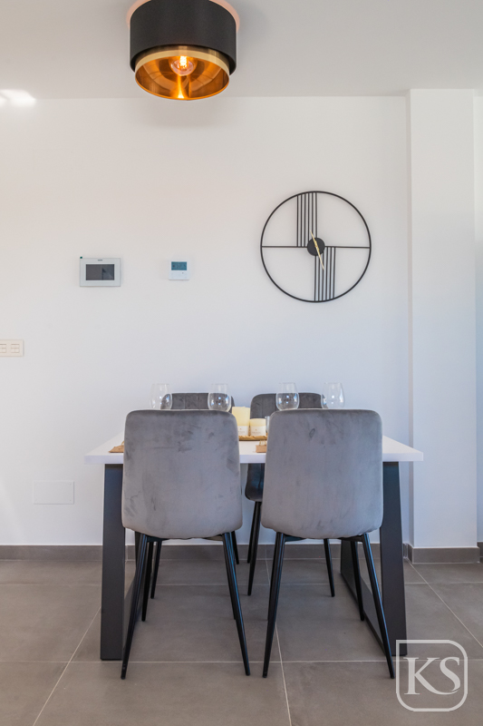 Step inside to find bedrooms adorned with fitted wardrobes featuring automatic LED lighting, ensuring both functionality and luxury. The bathrooms are equipped with high-quality fixtures, including recessed sinks, custom rectangular shower trays with non-slip resin, and elegant shower enclosures. The living room is bathed in natural light through two high-security sliding glass doors and features modern comforts such as TV and USB sockets, complemented by energy-efficient LED lighting. The kitchen is a culinary delight, complete with Siemens appliances, gloss white cabinets, and a built-in wine cellar. Adjacent, the dining area boasts a stylish hanging lamp, creating a perfect ambiance for dining.