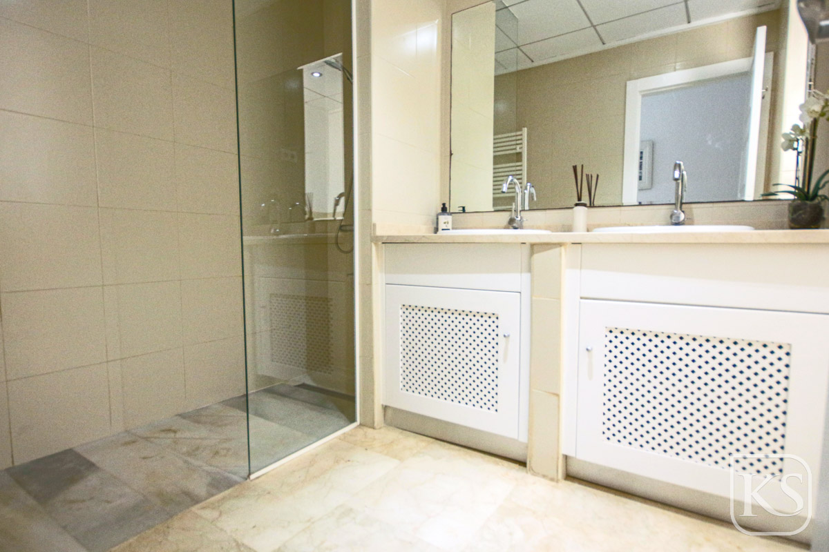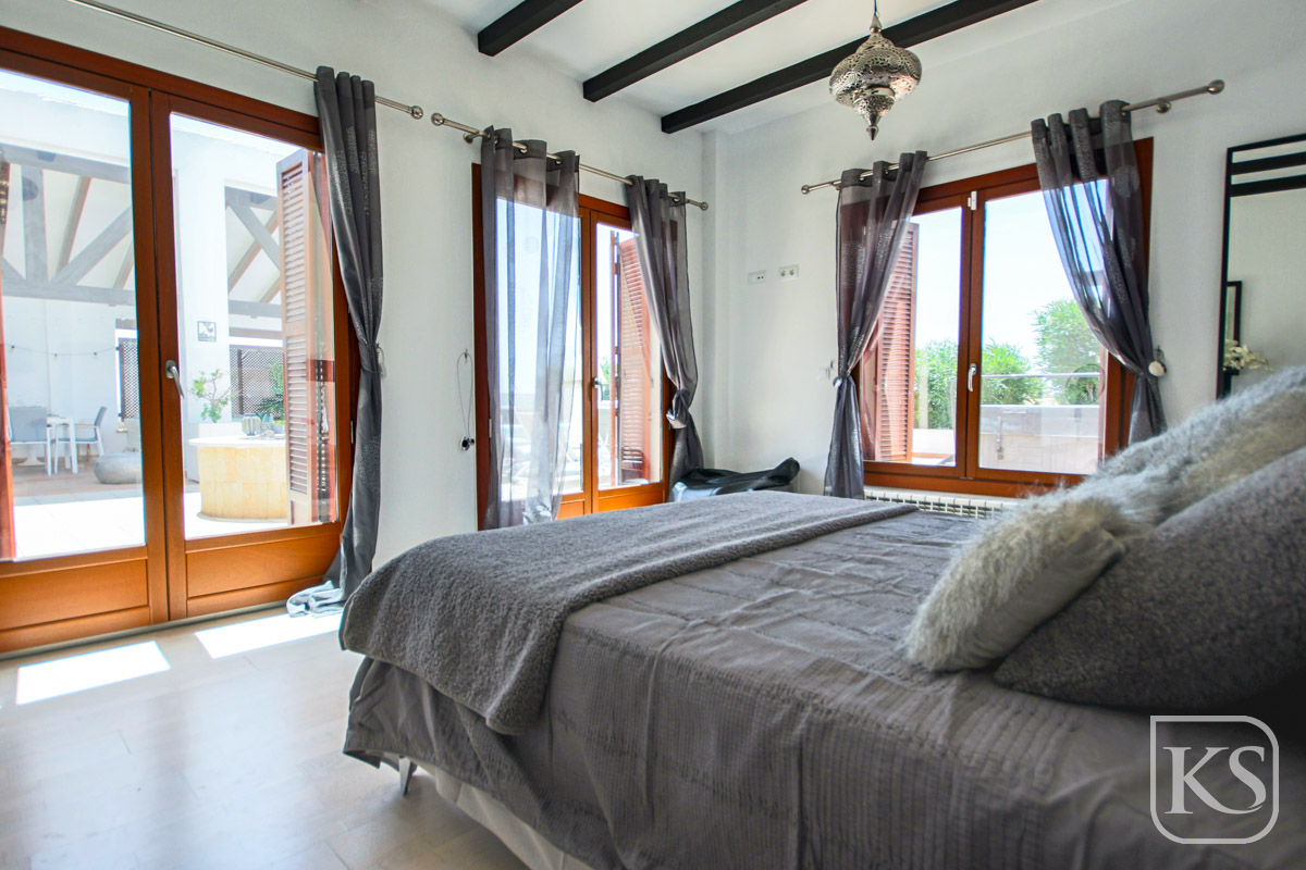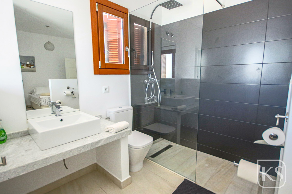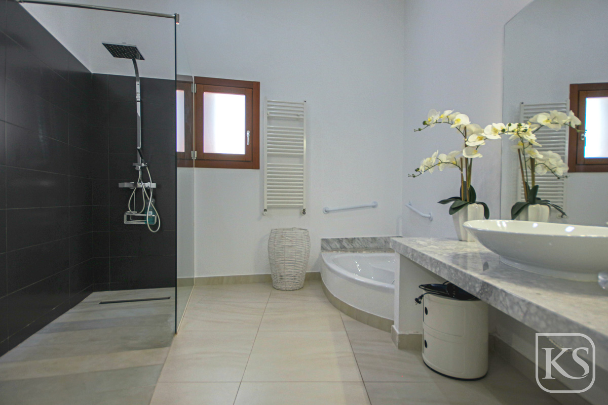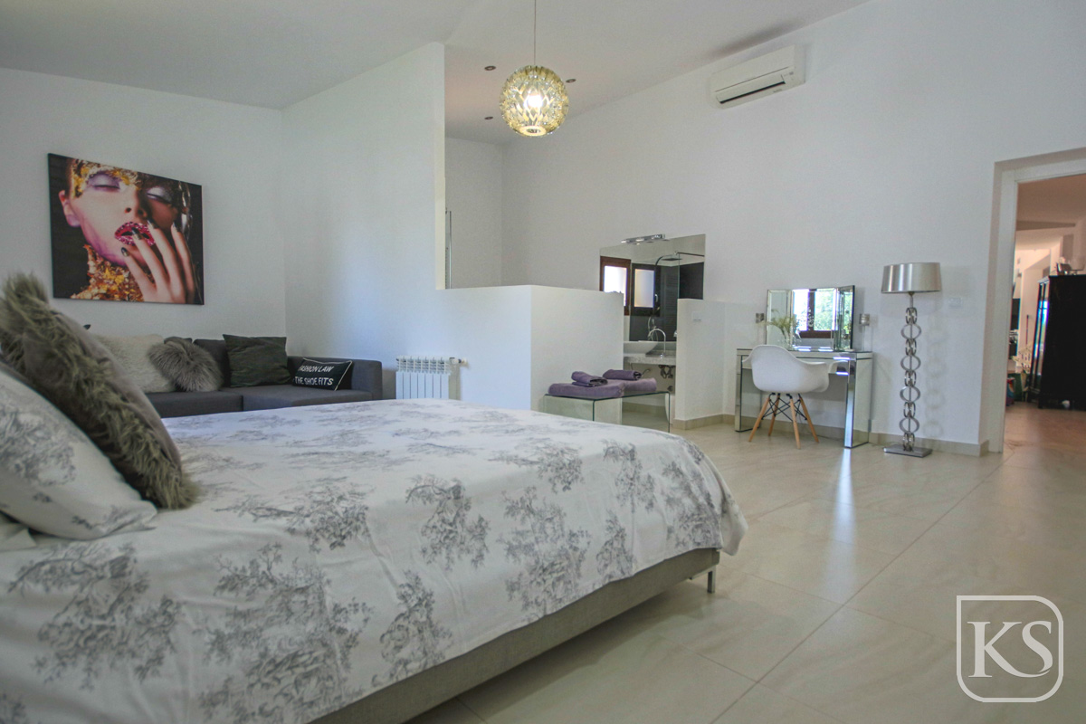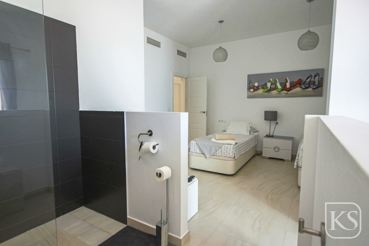 This villa offers four generously sized double bedrooms, each with built-in wardrobes, except for the master suite which features a walk-in wardrobe, views onto the garden, and a luxurious en-suite with his and hers sinks.