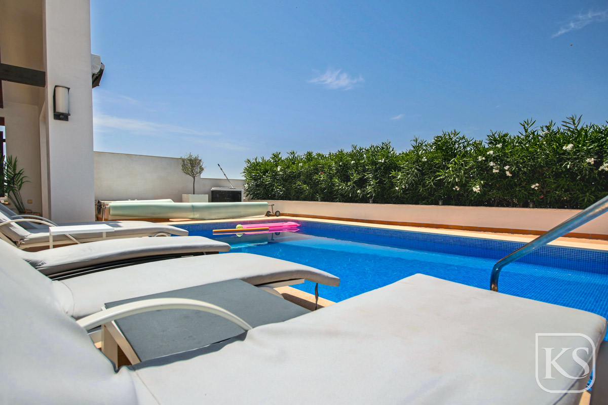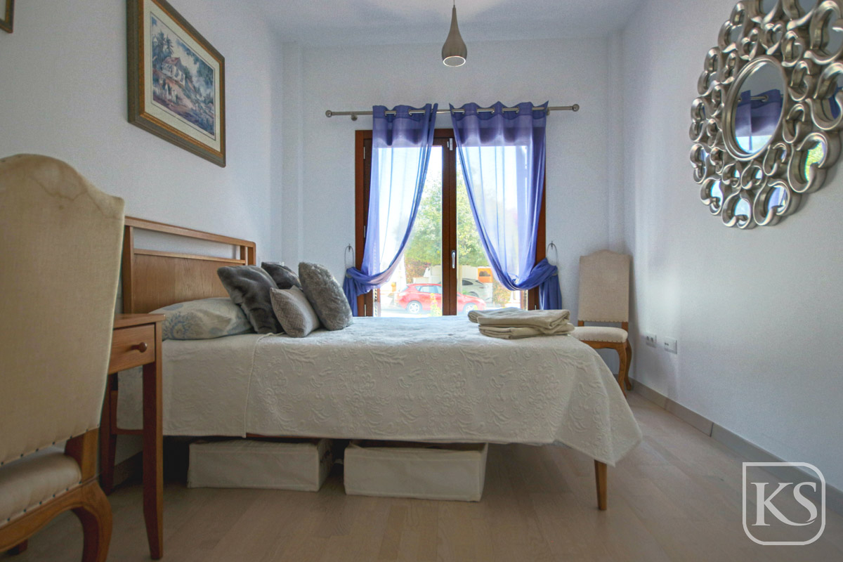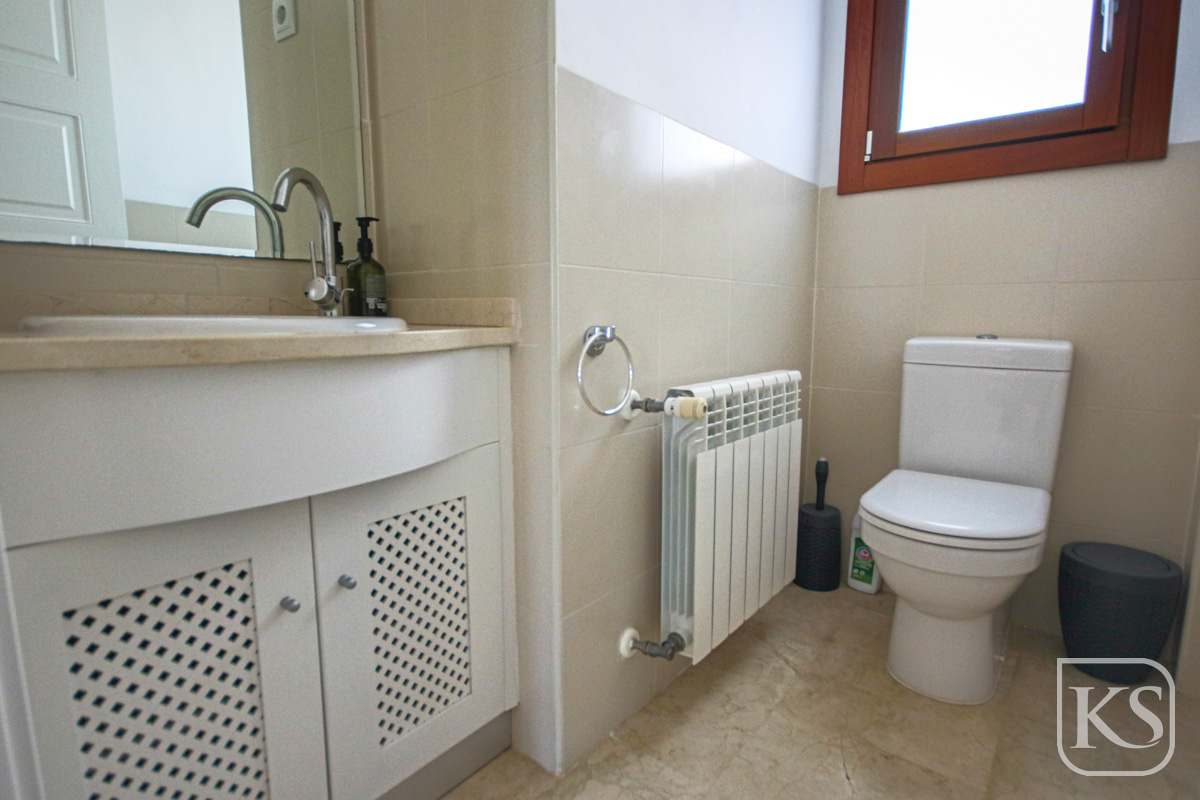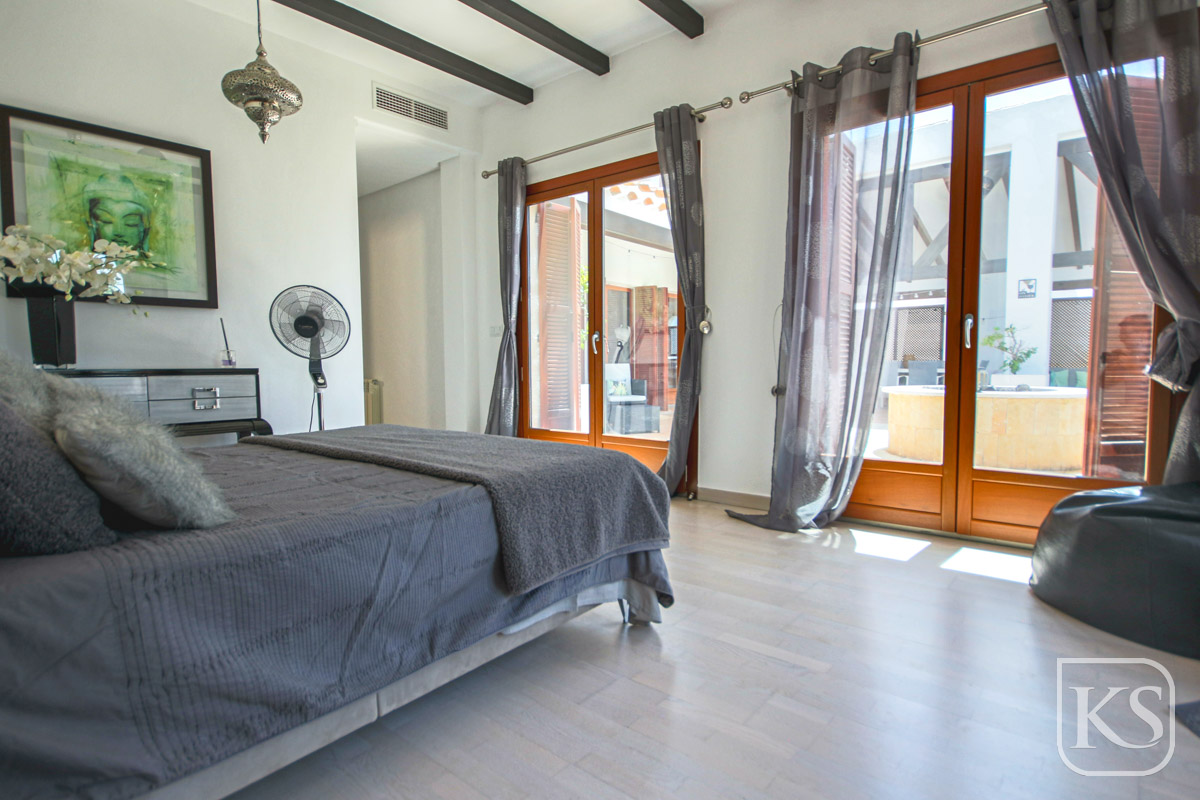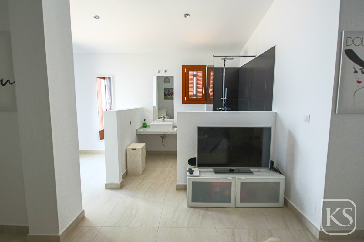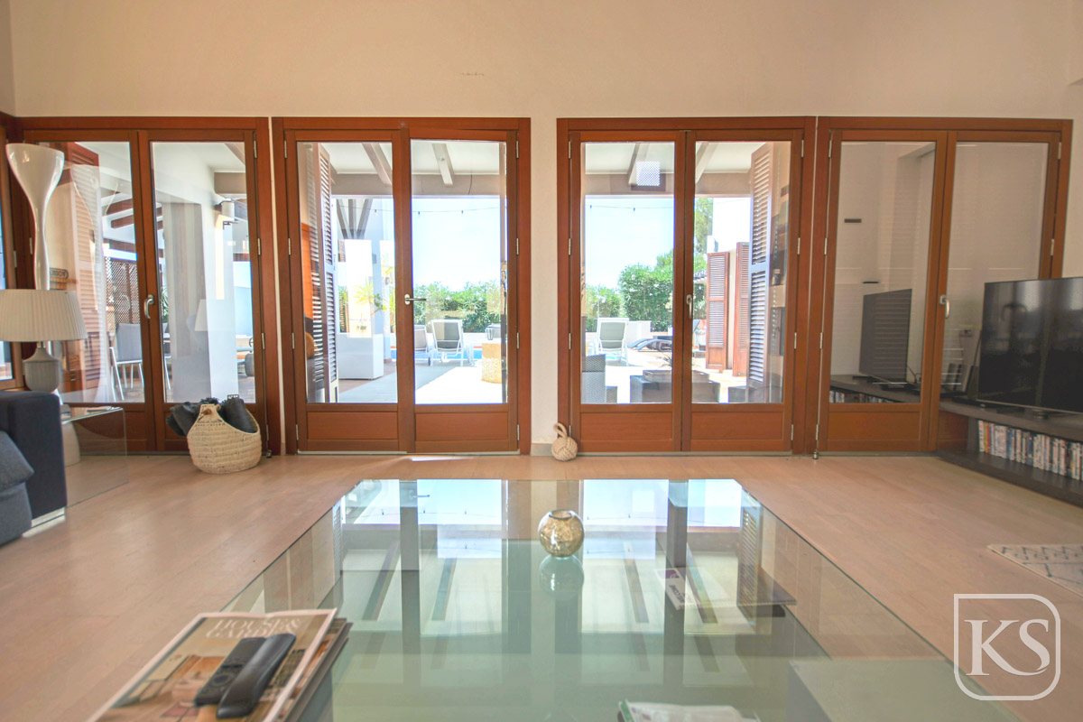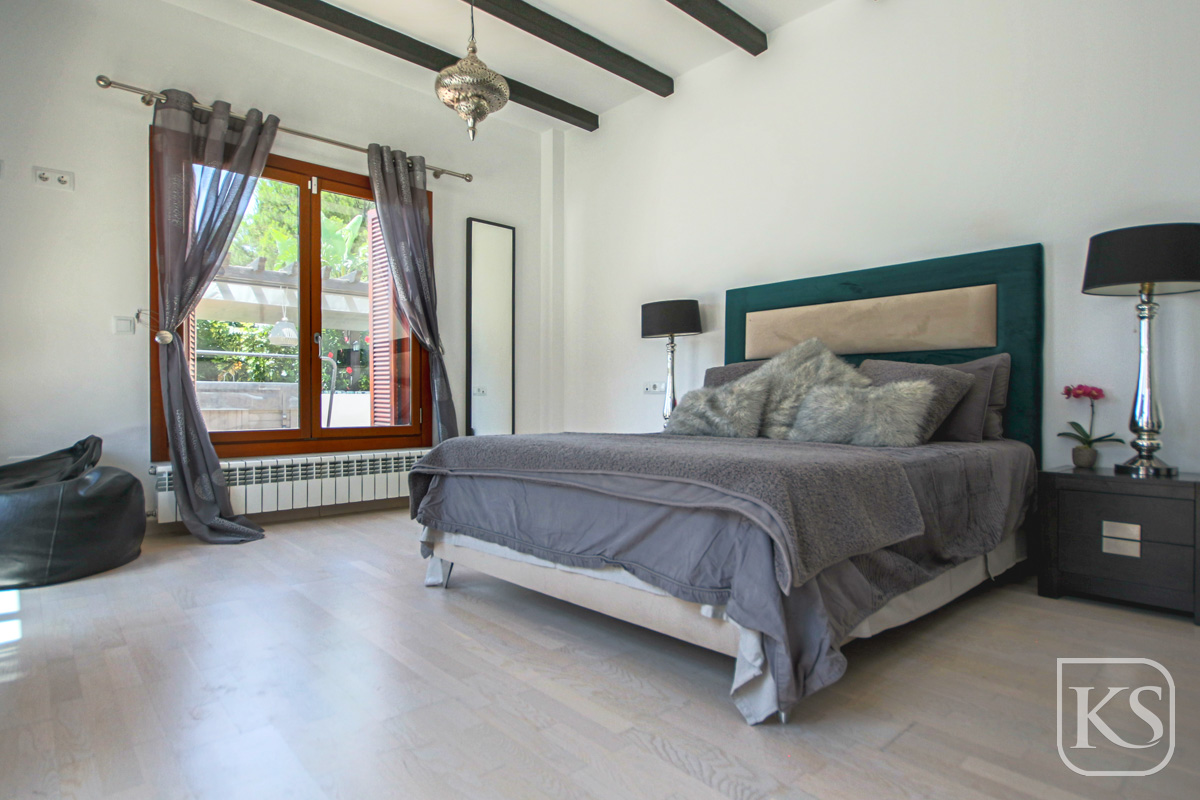 This villa offers four generously sized double bedrooms, each with built-in wardrobes, except for the master suite which features a walk-in wardrobe, views onto the garden, and a luxurious en-suite with his and hers sinks.
