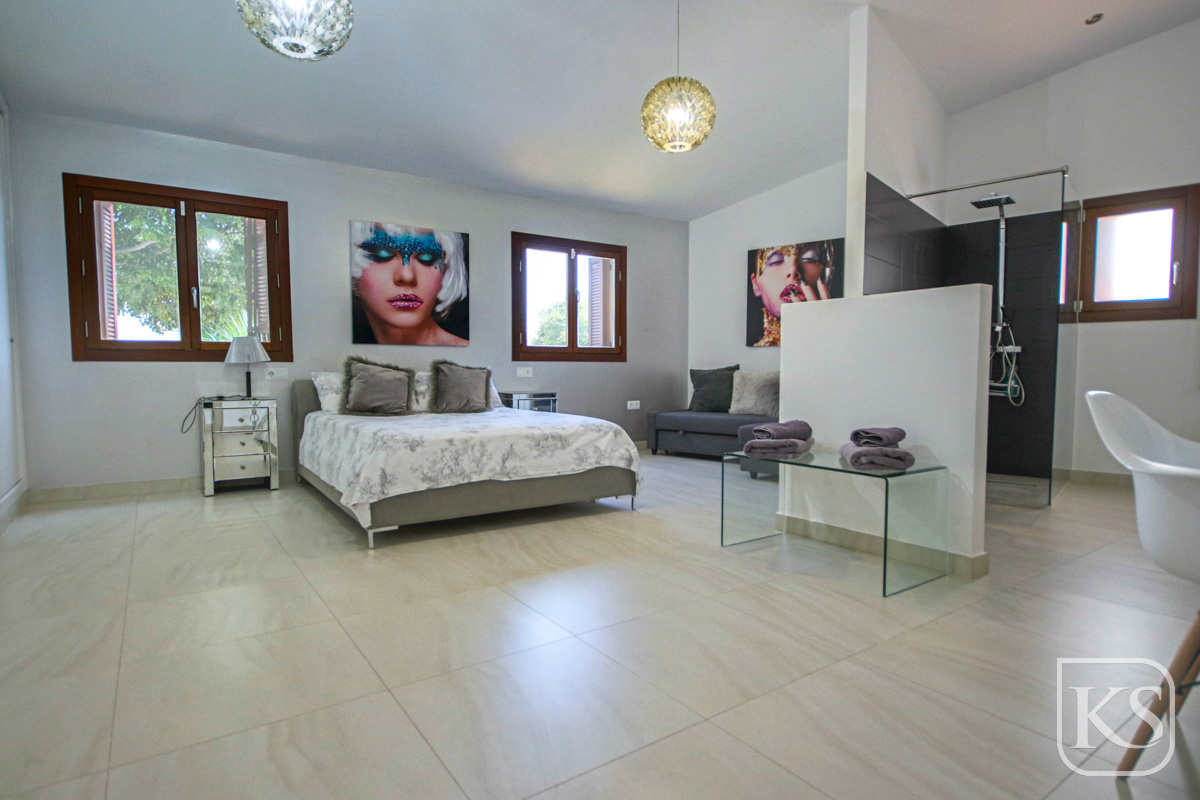 A large double bedroom with sofa space and open en-suite—perfect for guests or as a private retreat.