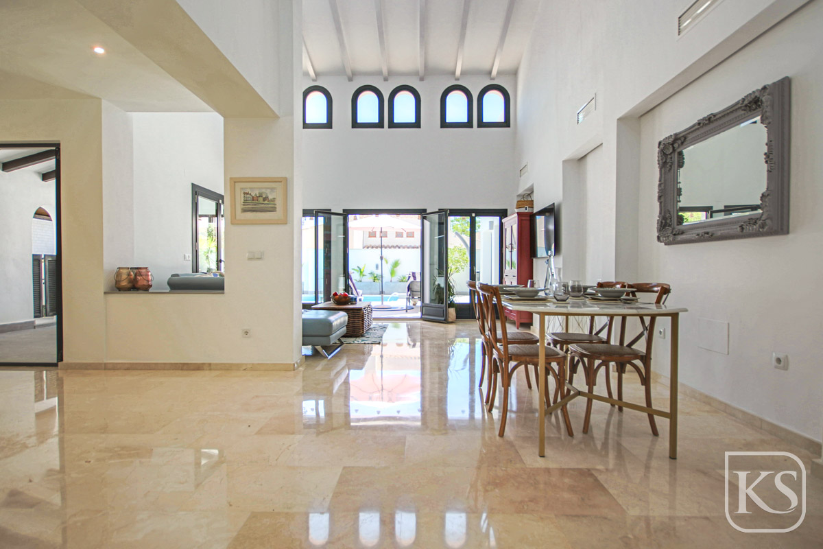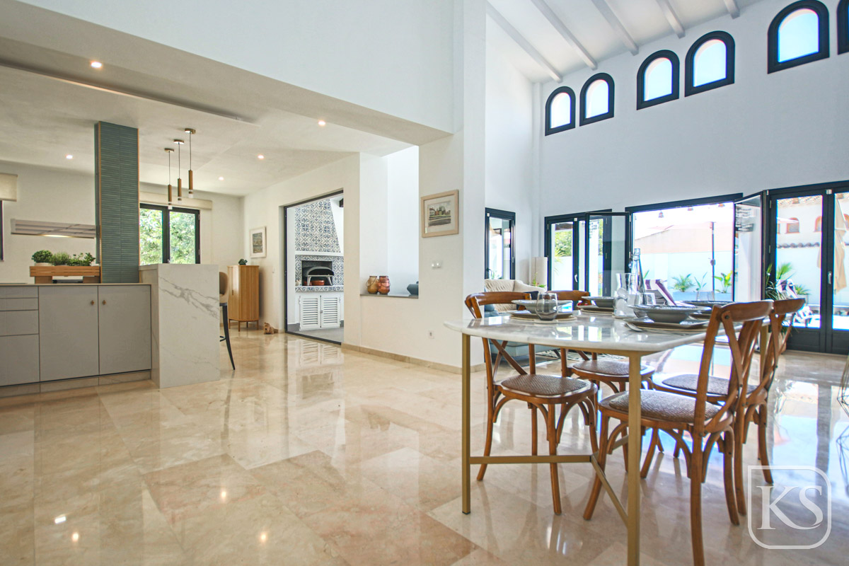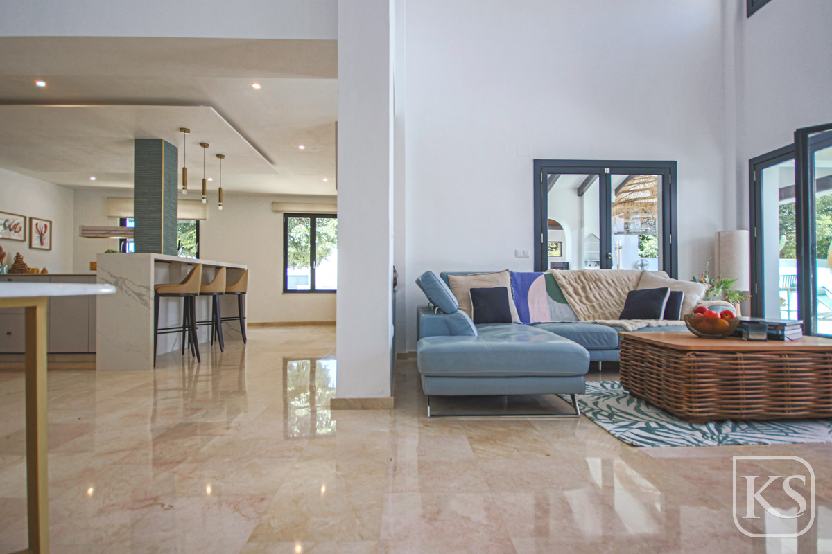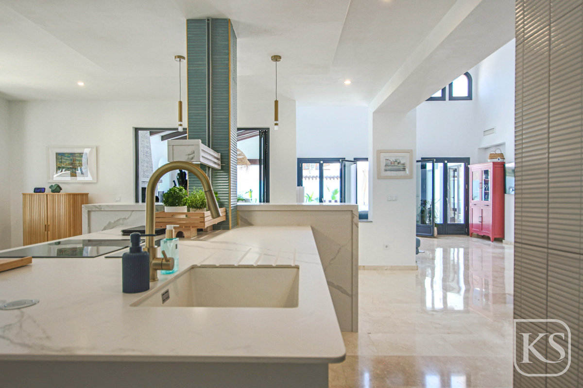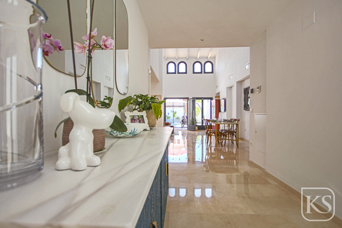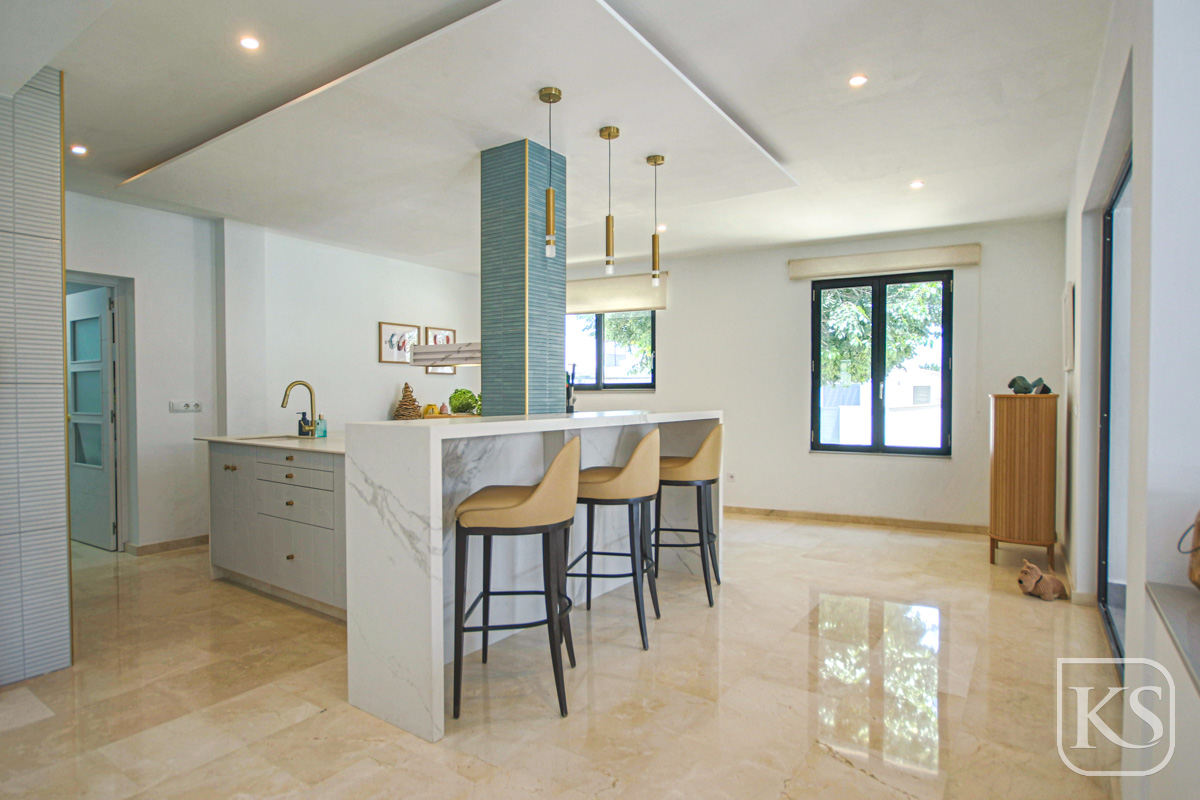 Step inside and feel the bright, airy ambience created by the fresh renovation, new tiling, and carefully curated décor. The villa features an extended entrance hallway leading into a spacious open-plan kitchen, living, and dining area.